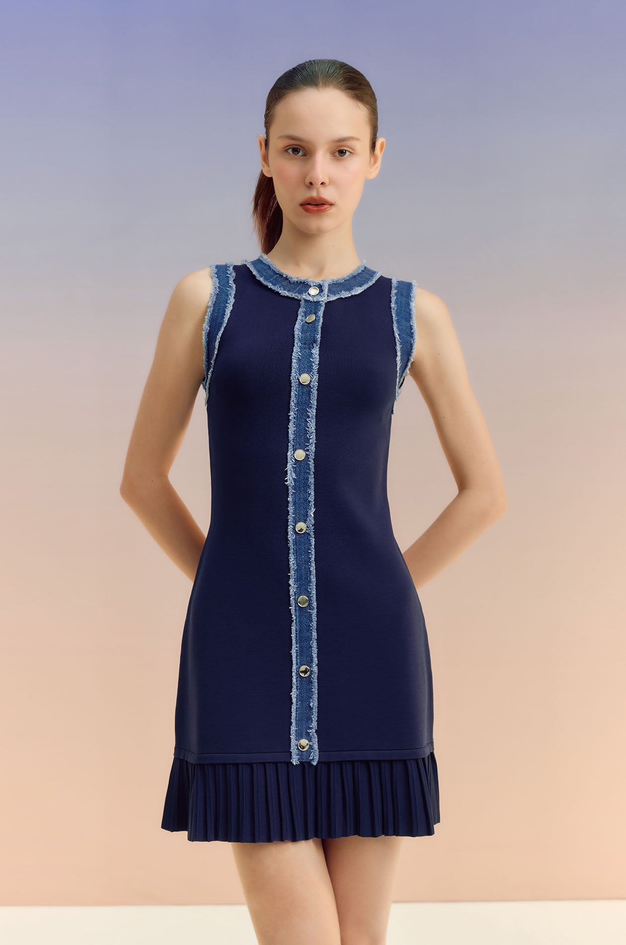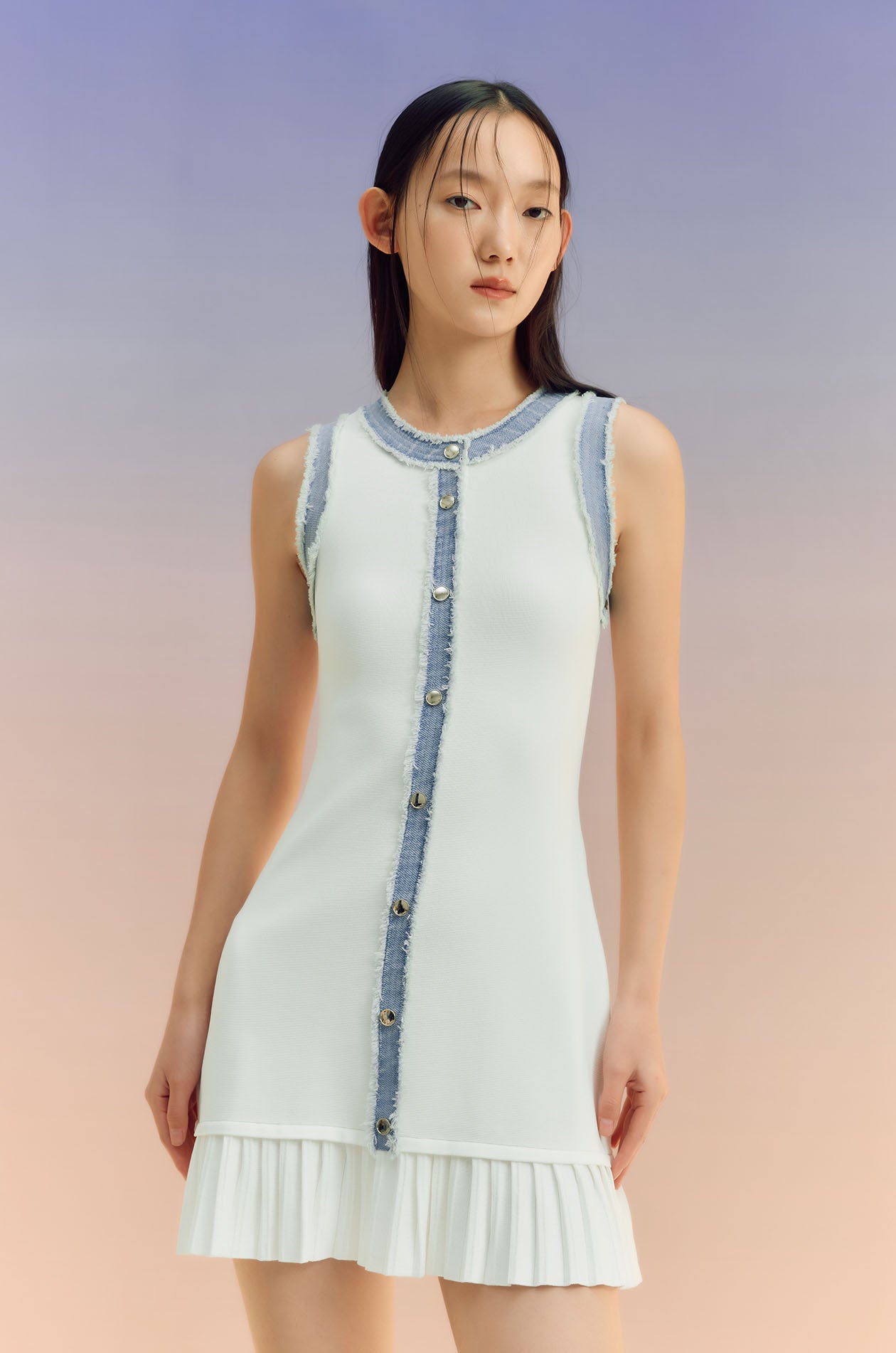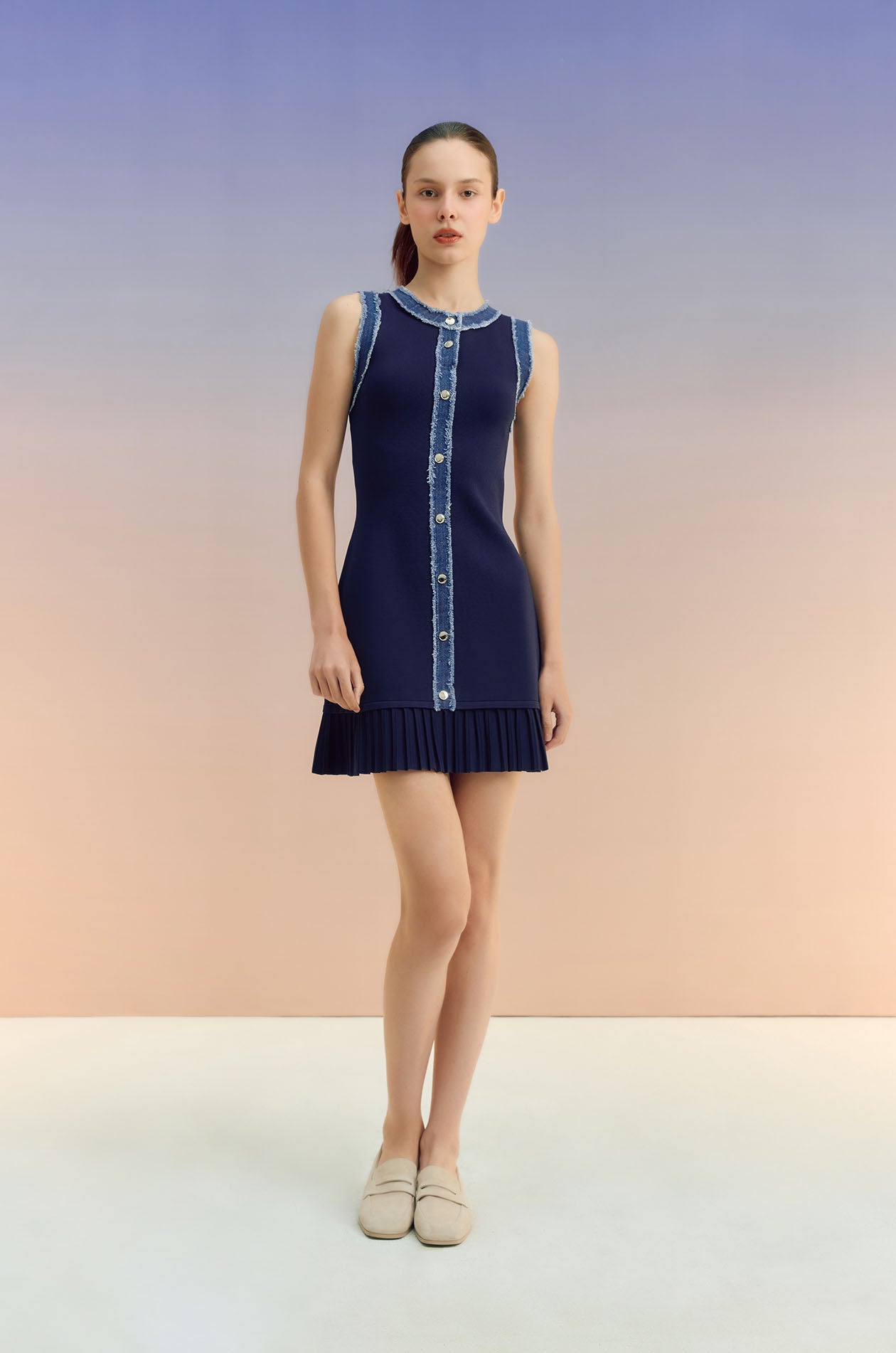 Sleeveless mini dress in knit fabric with denim trim. Fitted silhouette with round neckline, faux button embellishment, and pleated hem. Pull-on style. Available in off-white and indigo.