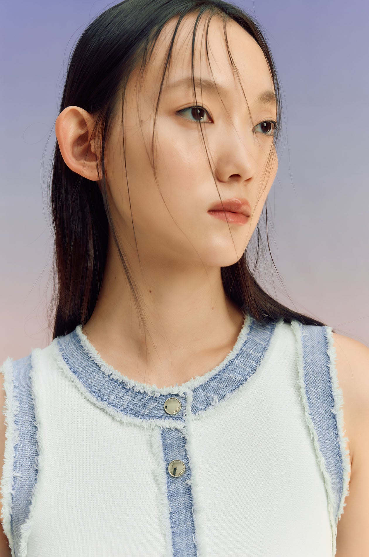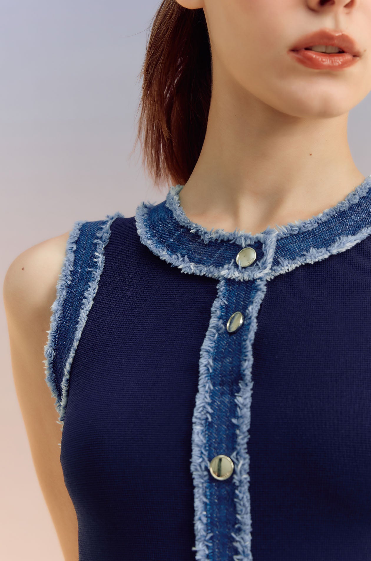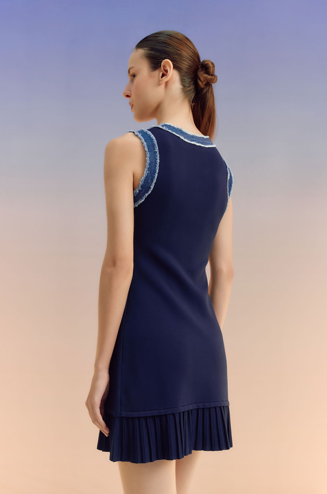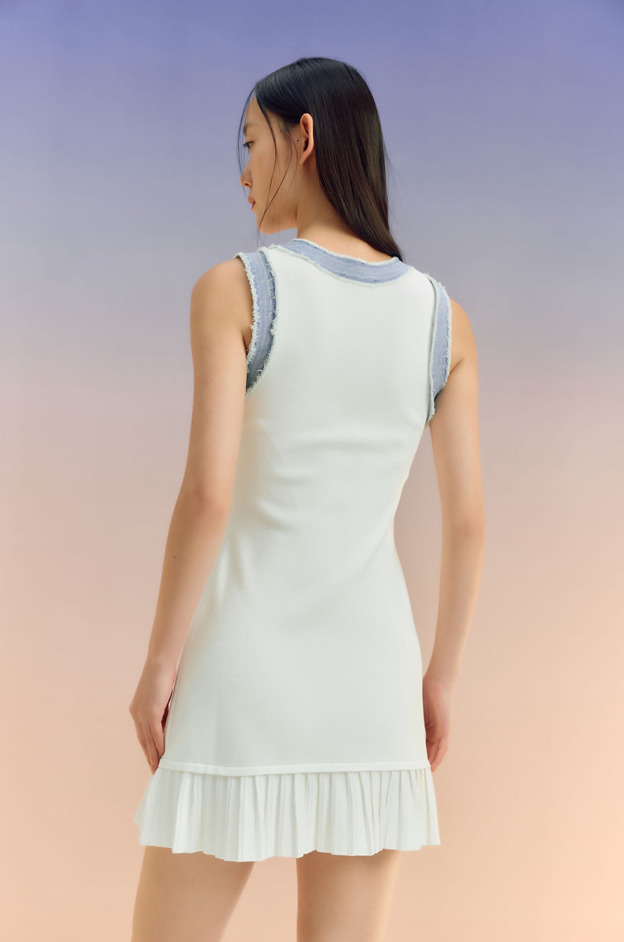 Sleeveless mini dress in knit fabric with denim trim. Fitted silhouette with round neckline, faux button embellishment, and pleated hem. Pull-on style. Available in off-white and indigo.