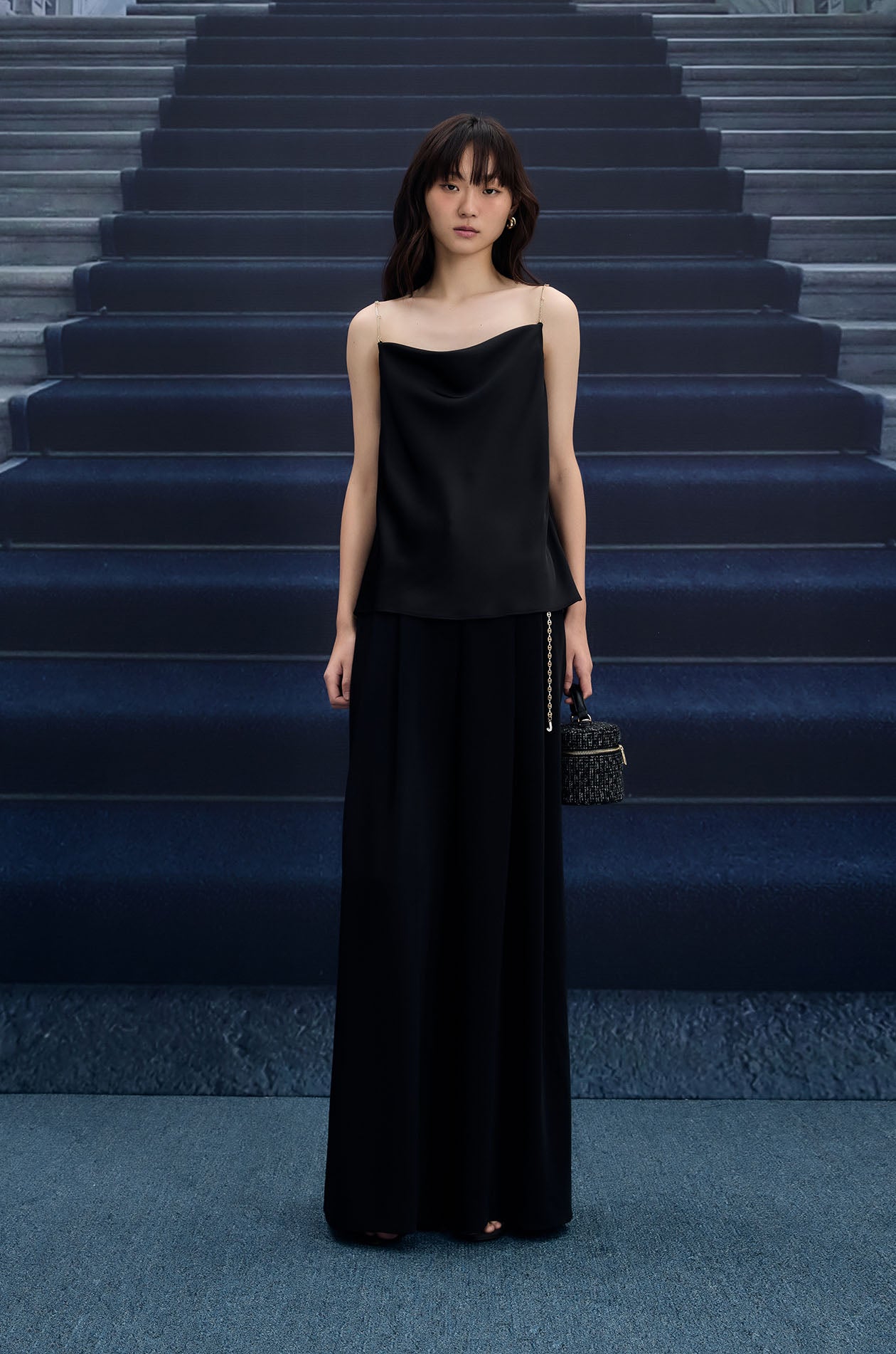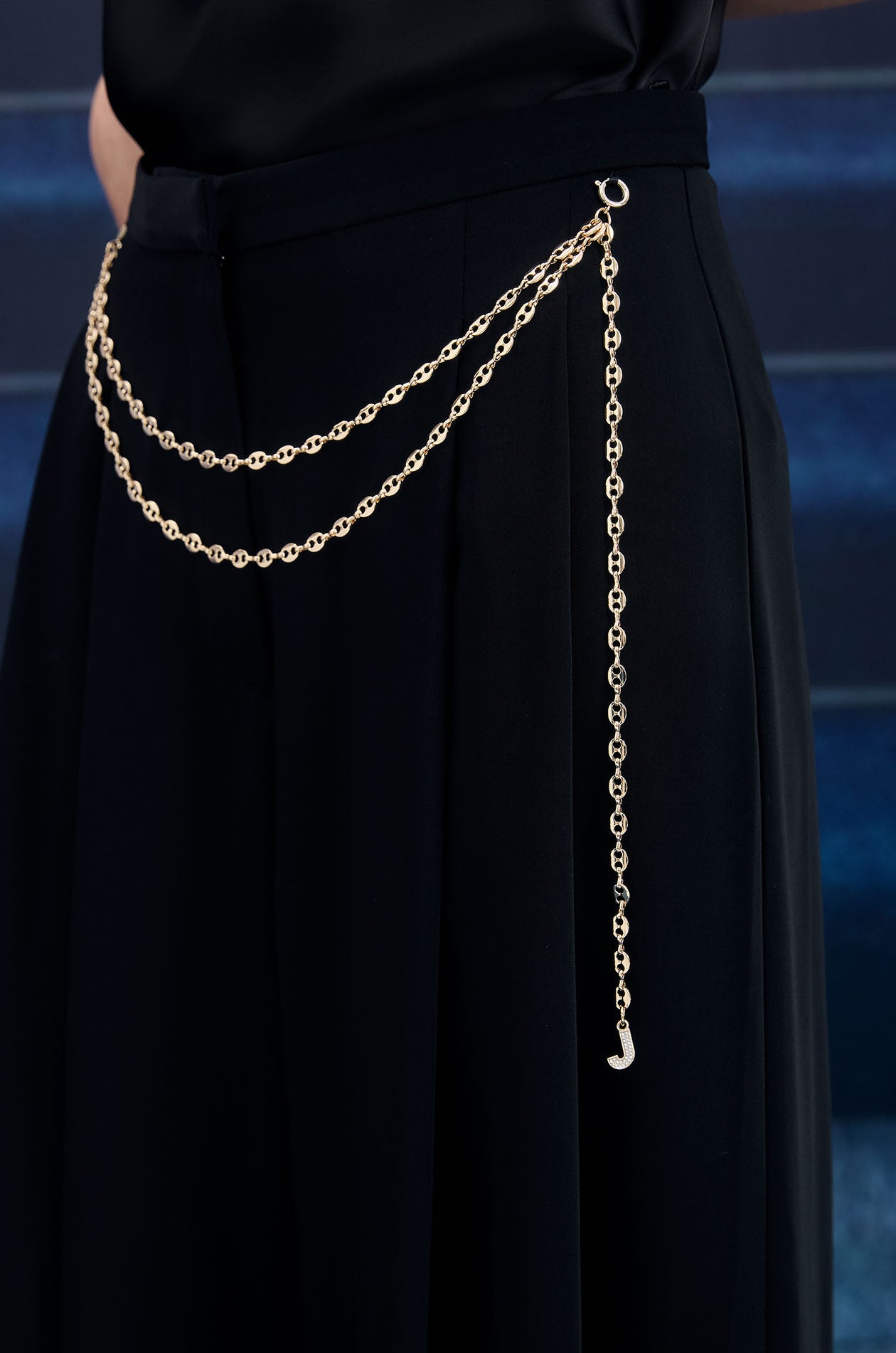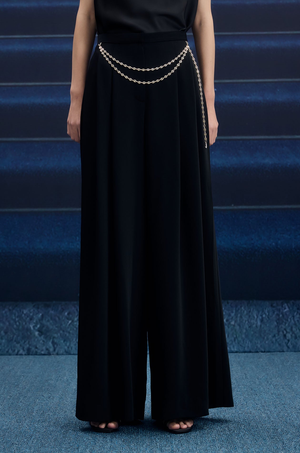 Mid-rise palazzo pants in lightweight fabric. Ultra-wide legs with front pleats and removable layered chain embellishments. Front hook and zip closure. Available in black.