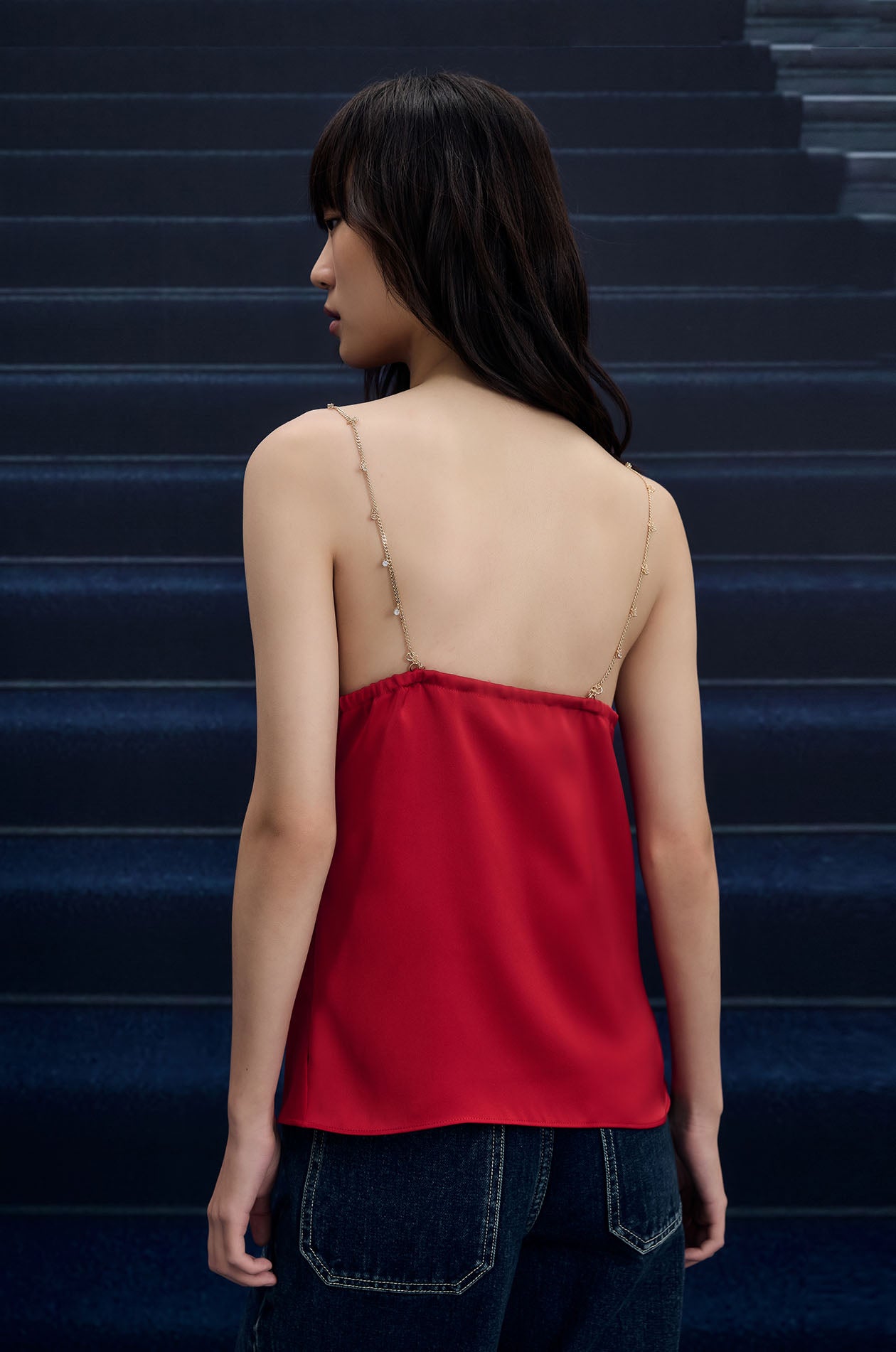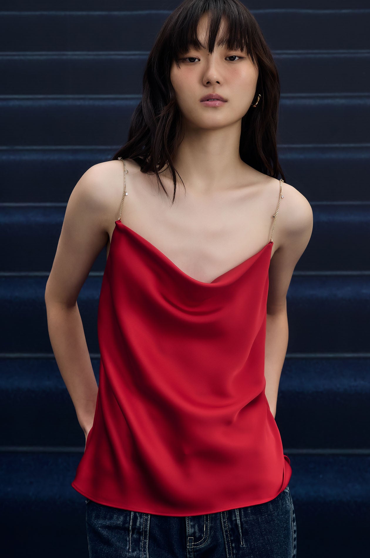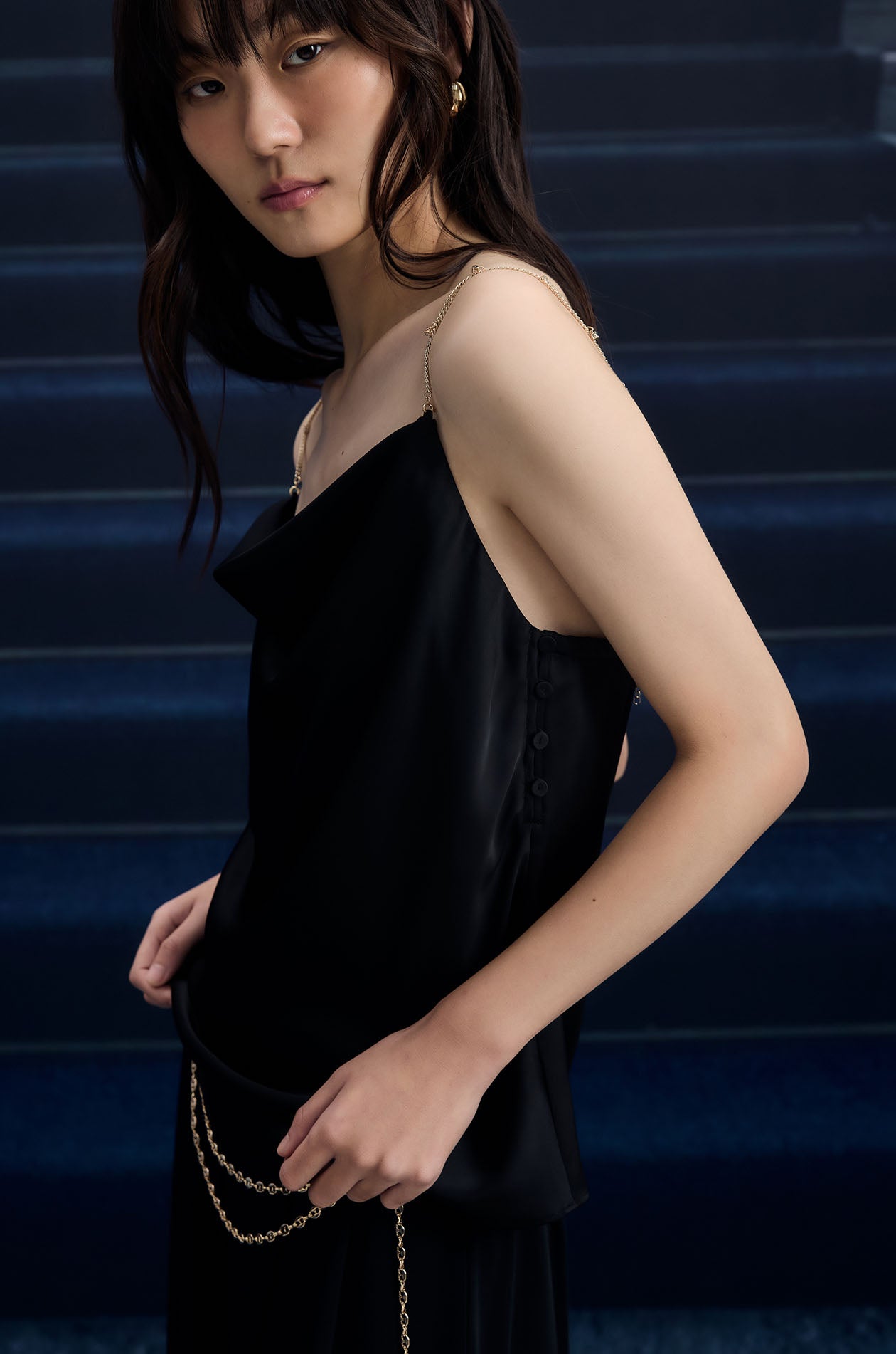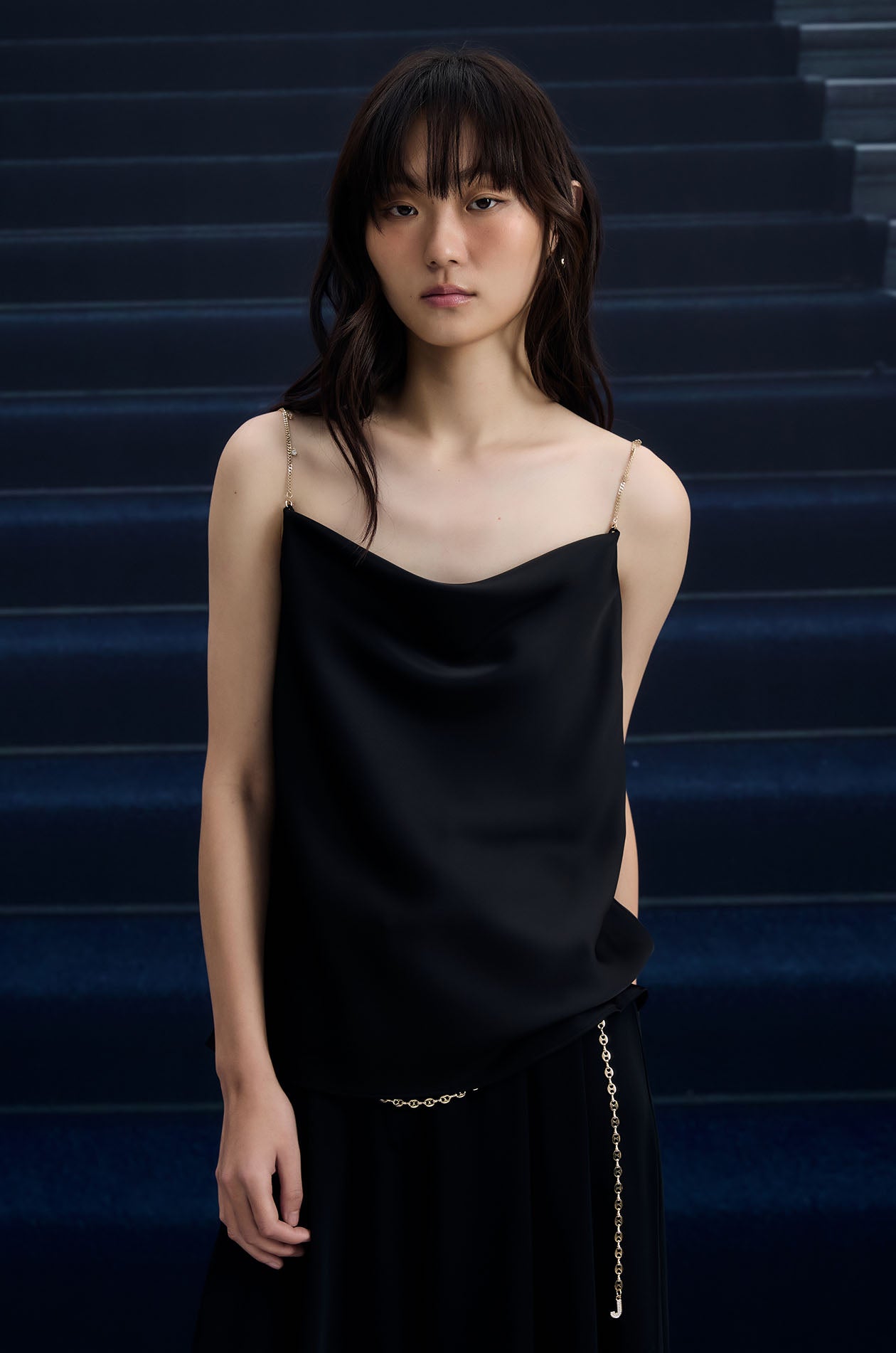 Strappy cami top in satin. Cowl neckline and removable chain straps with rhinestones embellishment. Side button closure. Available in black and red.