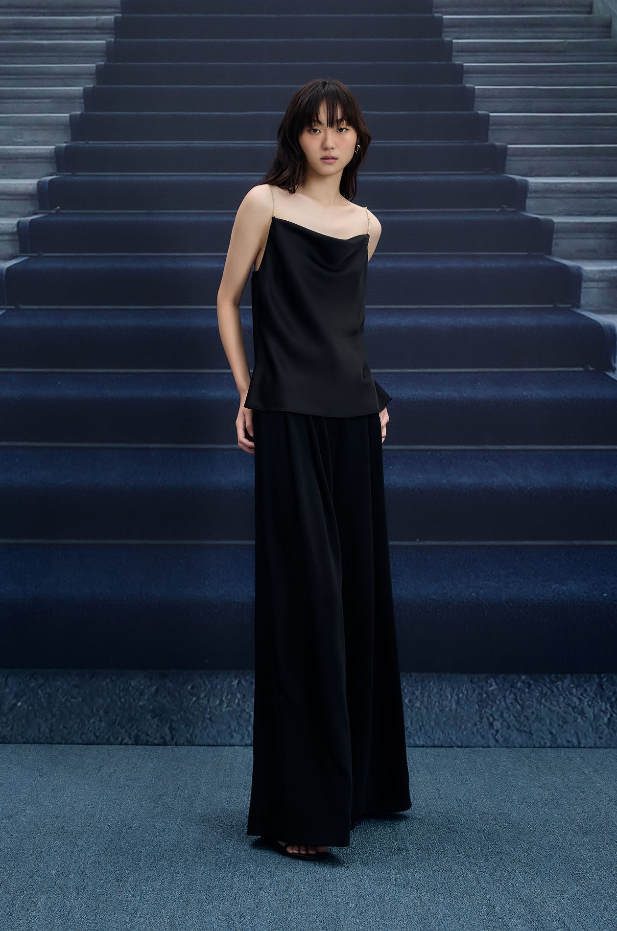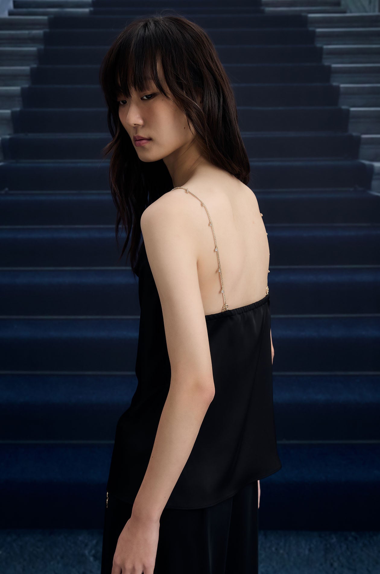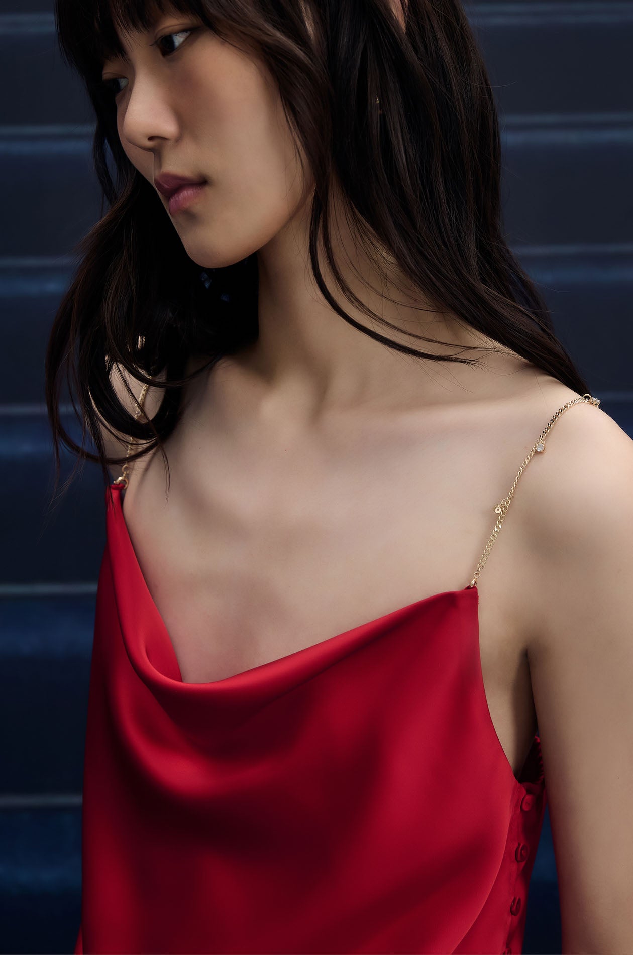 Strappy cami top in satin. Cowl neckline and removable chain straps with rhinestones embellishment. Side button closure. Available in black and red.