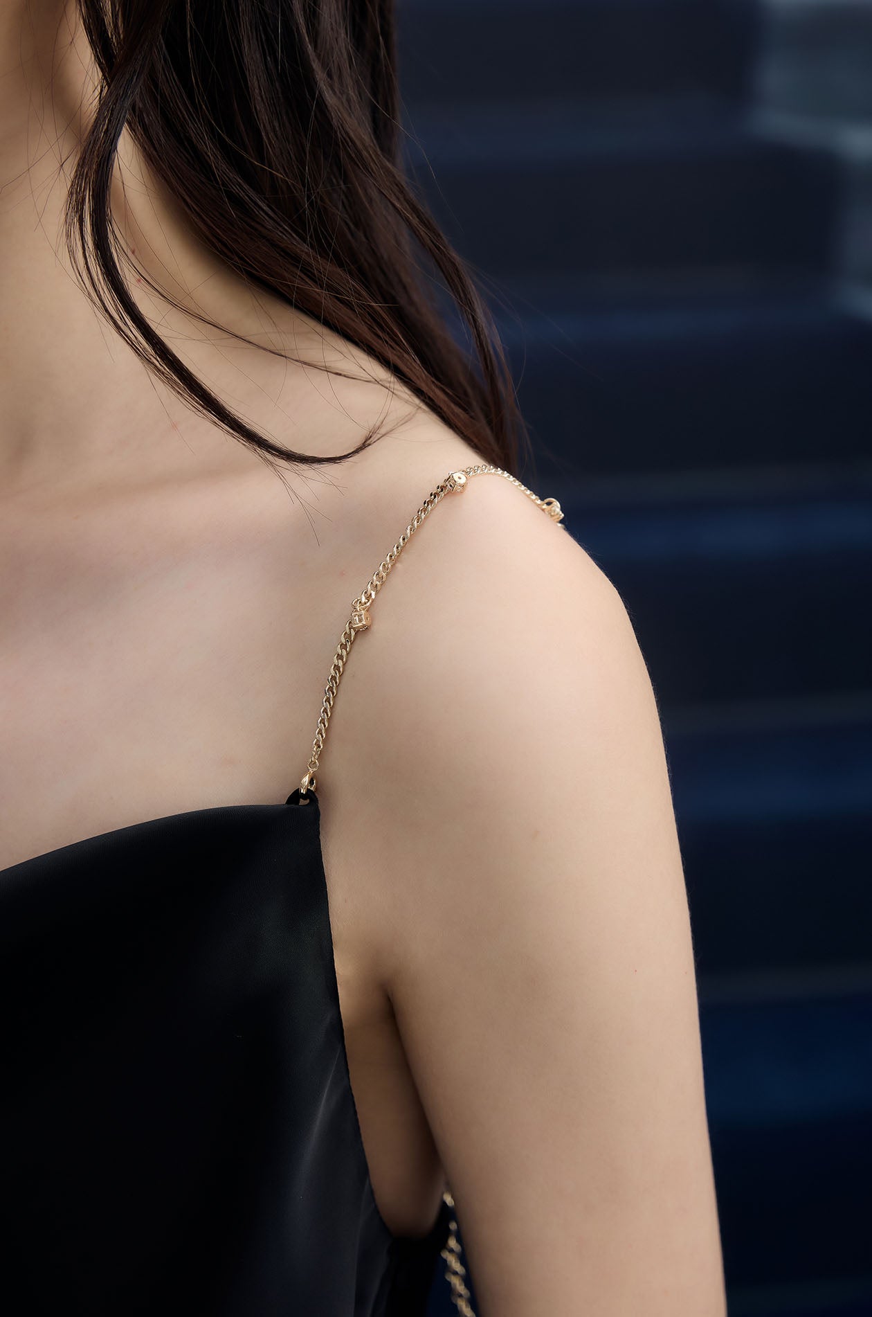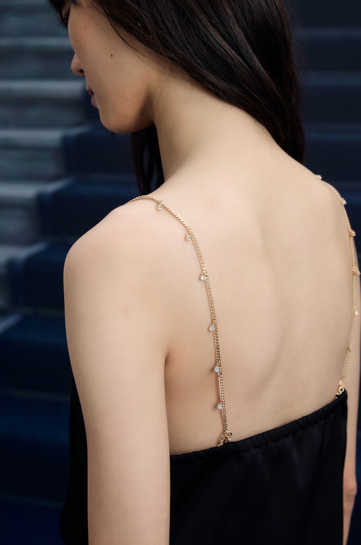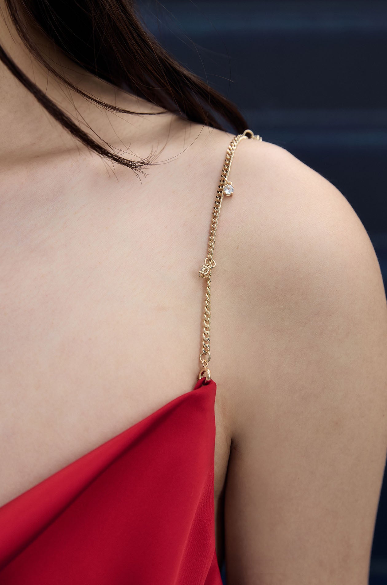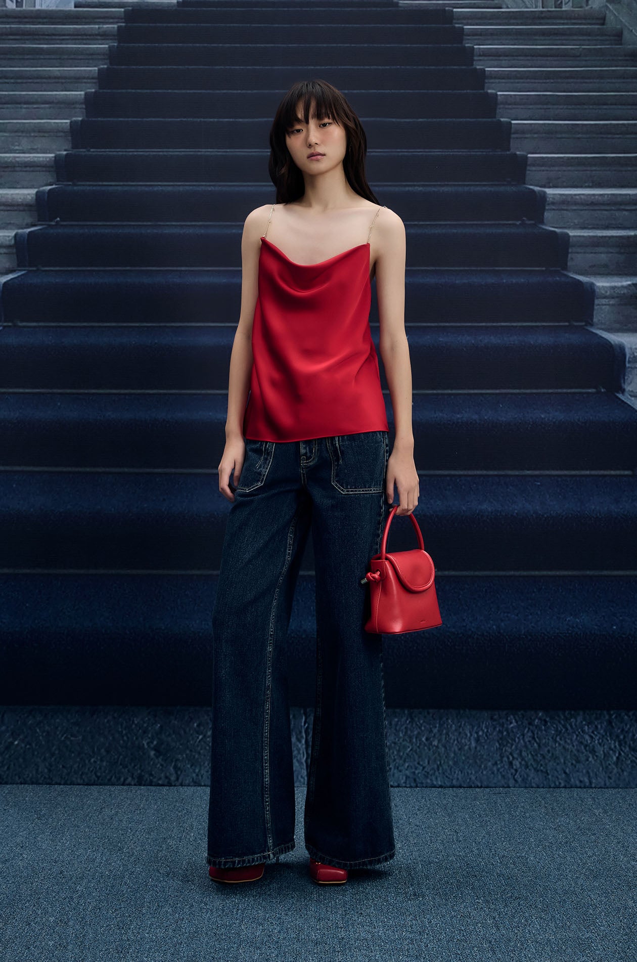 Strappy cami top in satin. Cowl neckline and removable chain straps with rhinestones embellishment. Side button closure. Available in black and red.