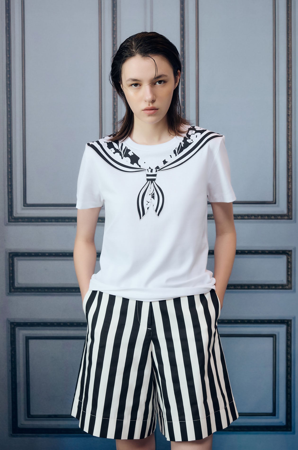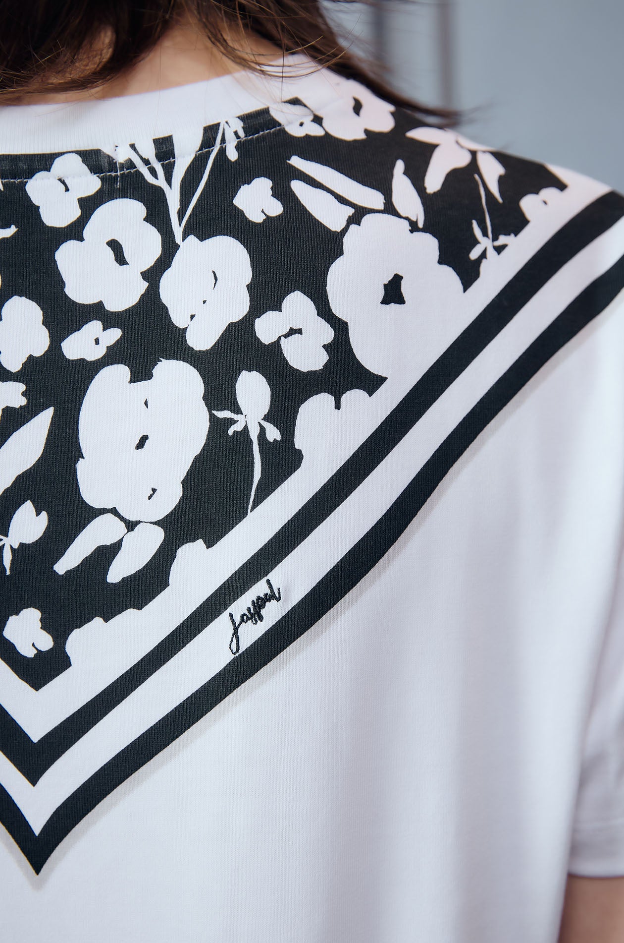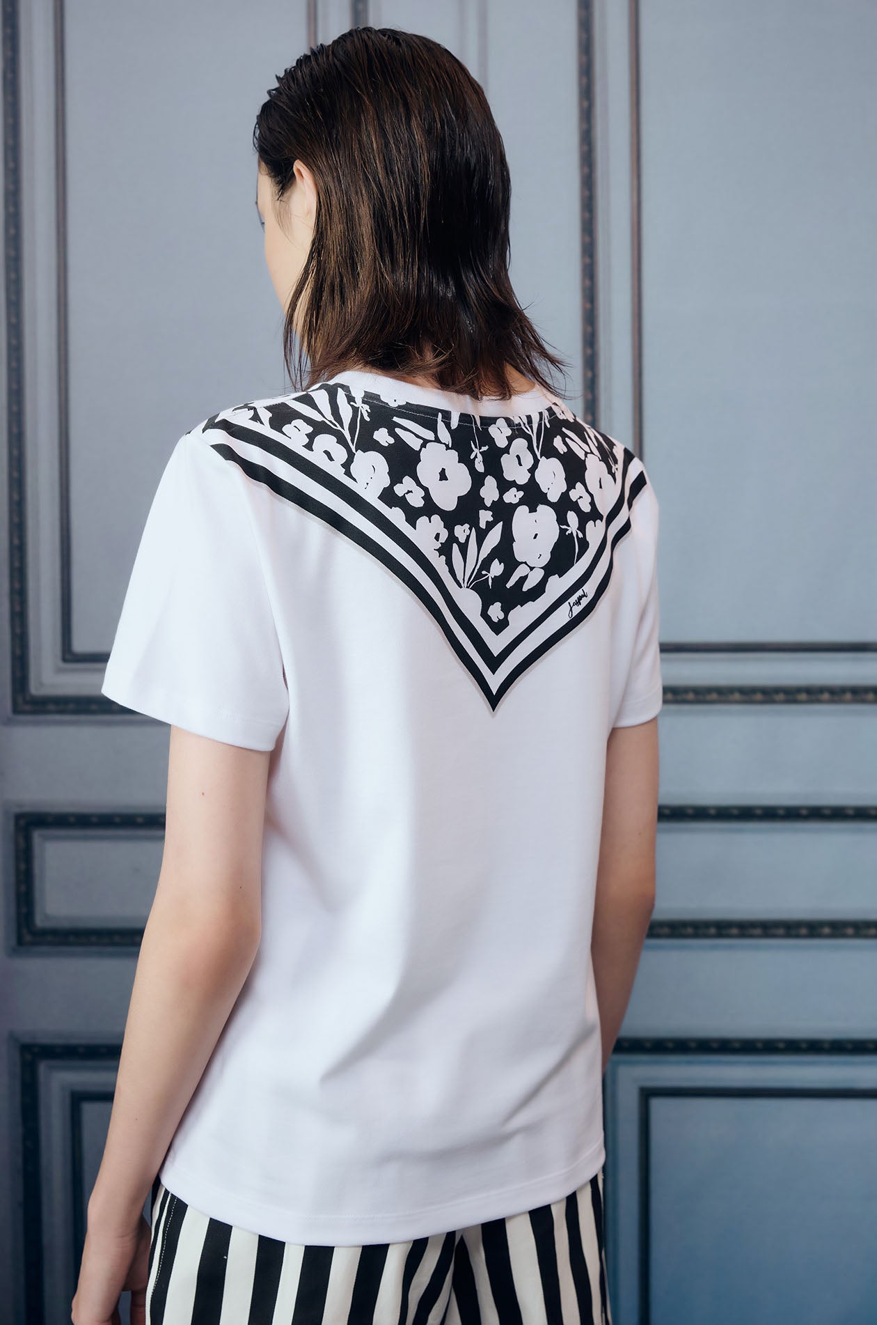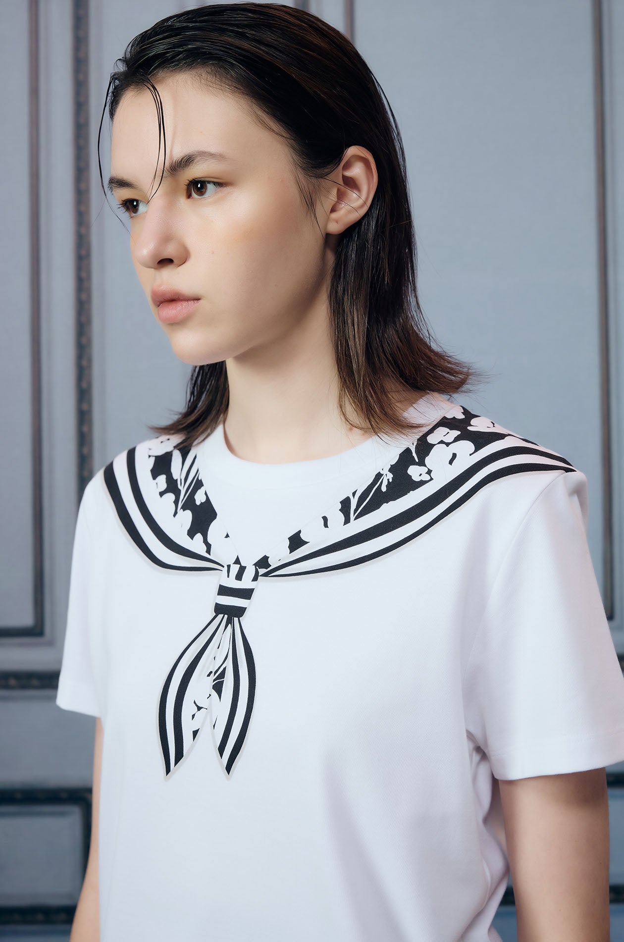 Short-sleeved T-shirt in cotton jersey. Regular fit with straight cut, round neckline, and graphic tied-scarf print. Available in white.