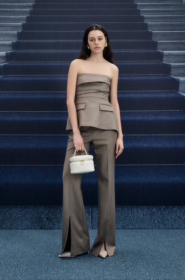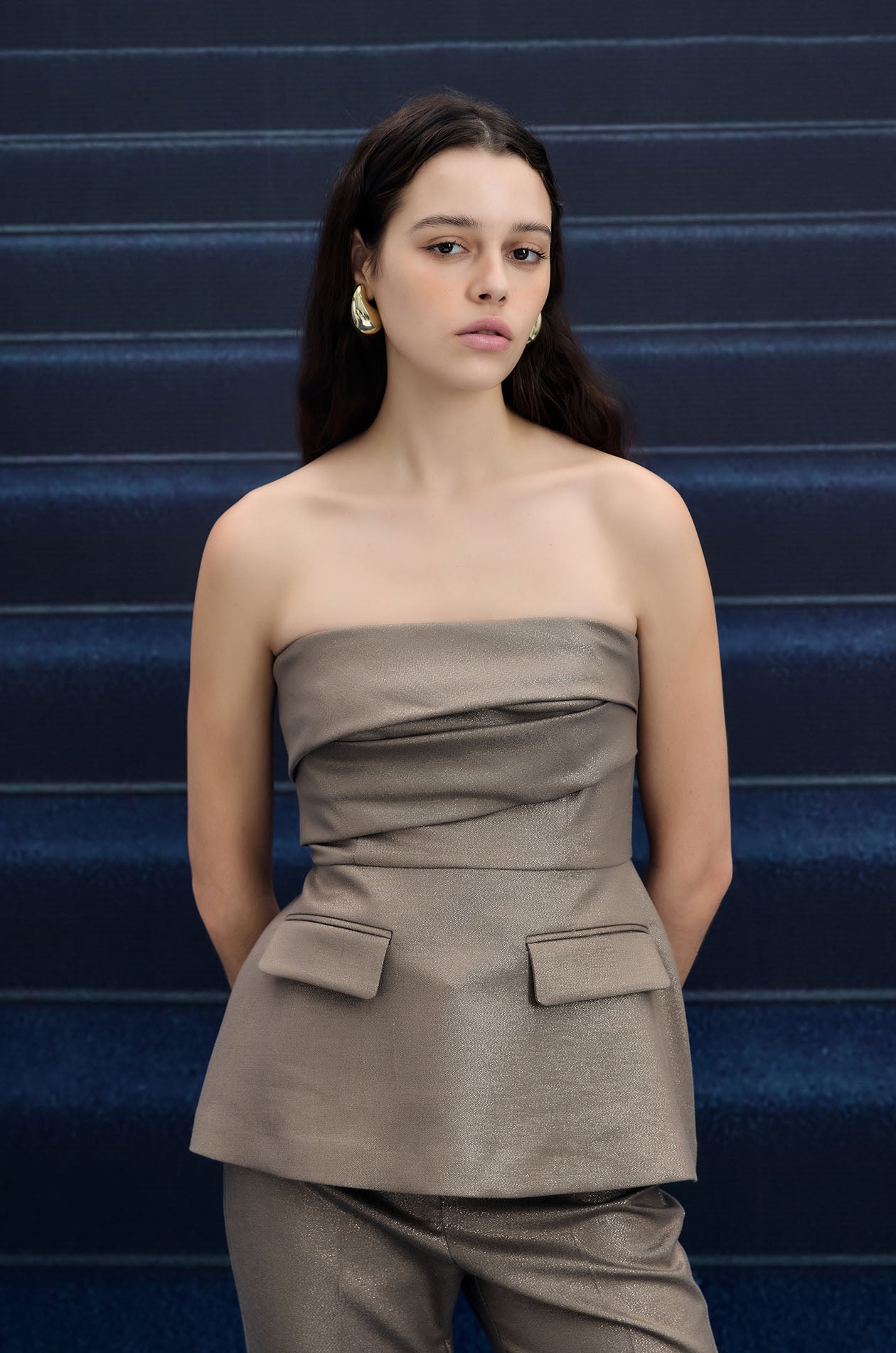 Strapless top in metallic fabric. Hourglass silhouette with straight neckline, draped panel, and faux pockets. Back zip closure. Available in beige.