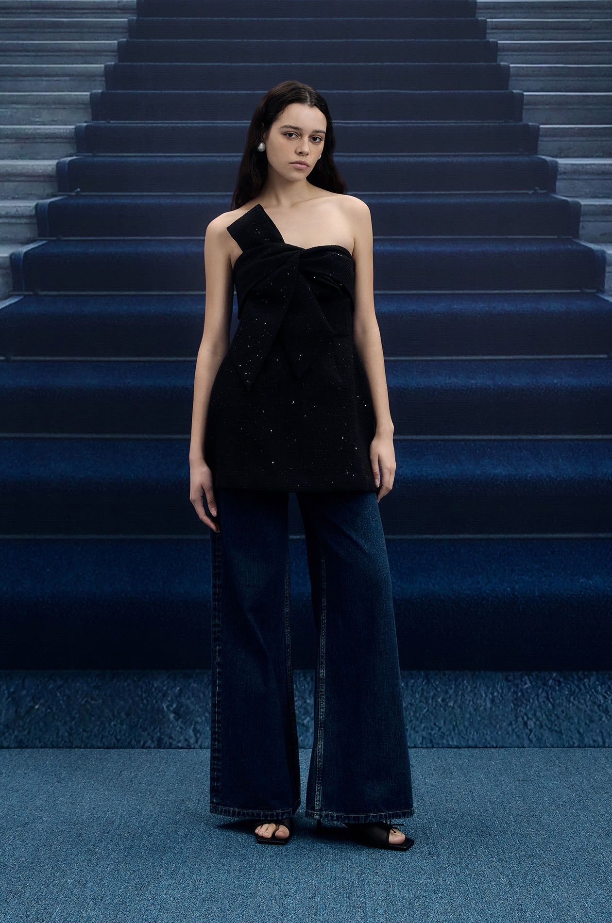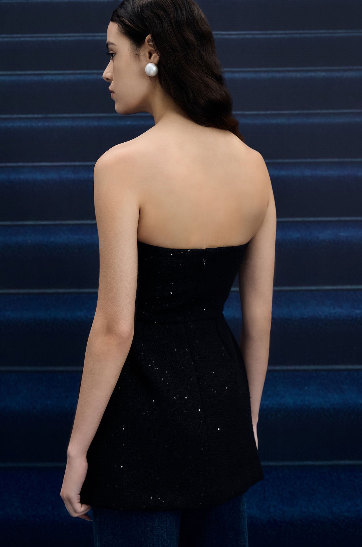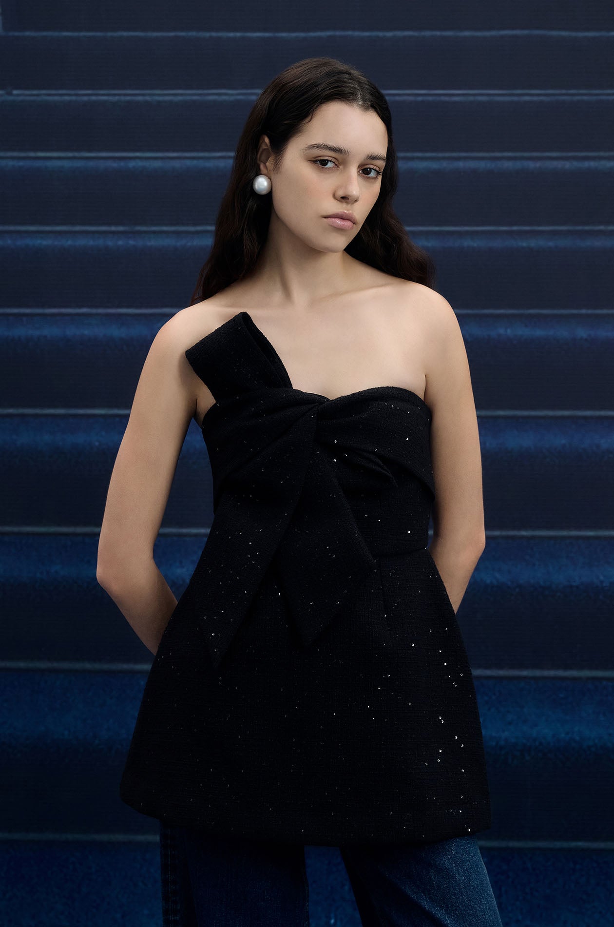 Strapless mini dress in cotton blend fabric with sequins embellishment. Hourglass silhouette with draped panel in bow design. Back zip closure. Available in black.