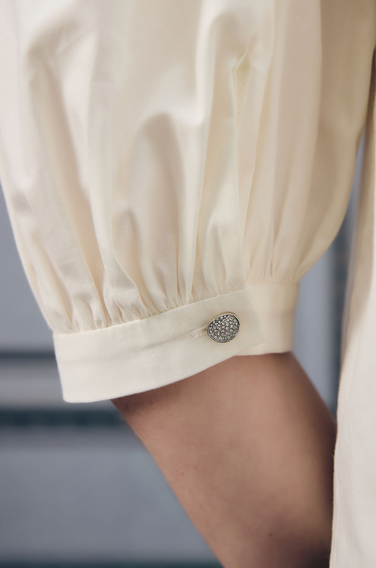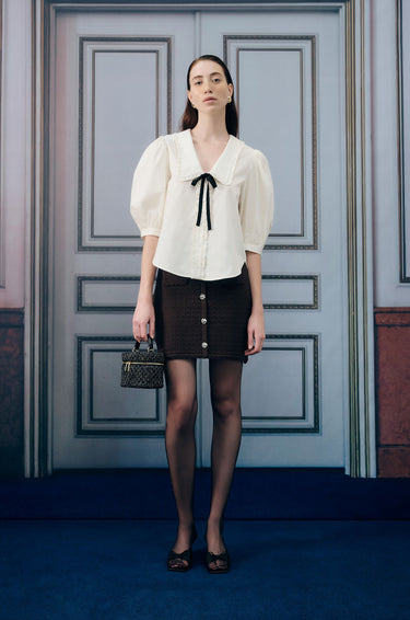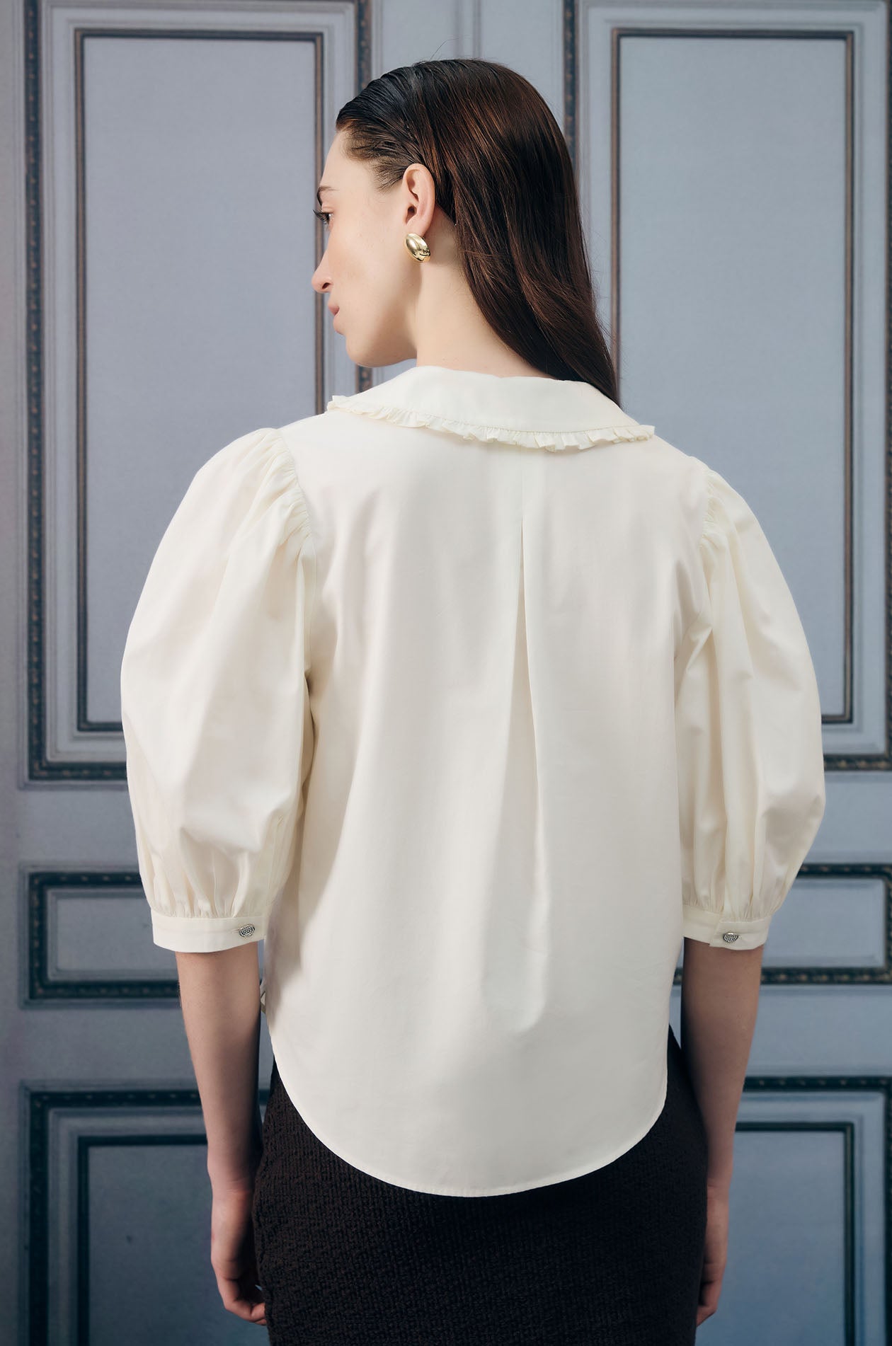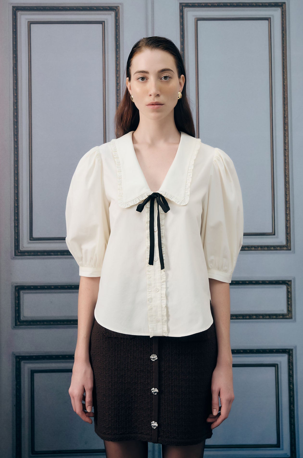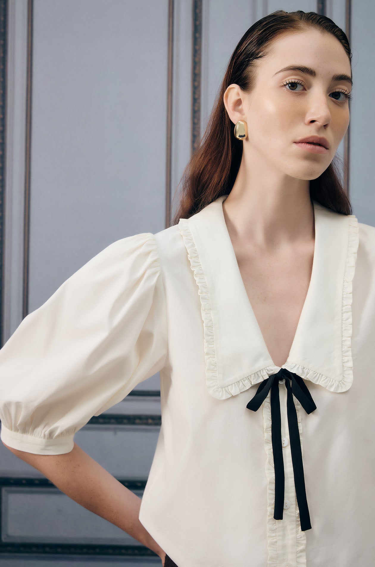 Short-puff-sleeved blouse in cotton poplin. Relaxed fit with peter pan collar, ruffle edges, and contrast ribbon. Front button closure. Available in off-white.