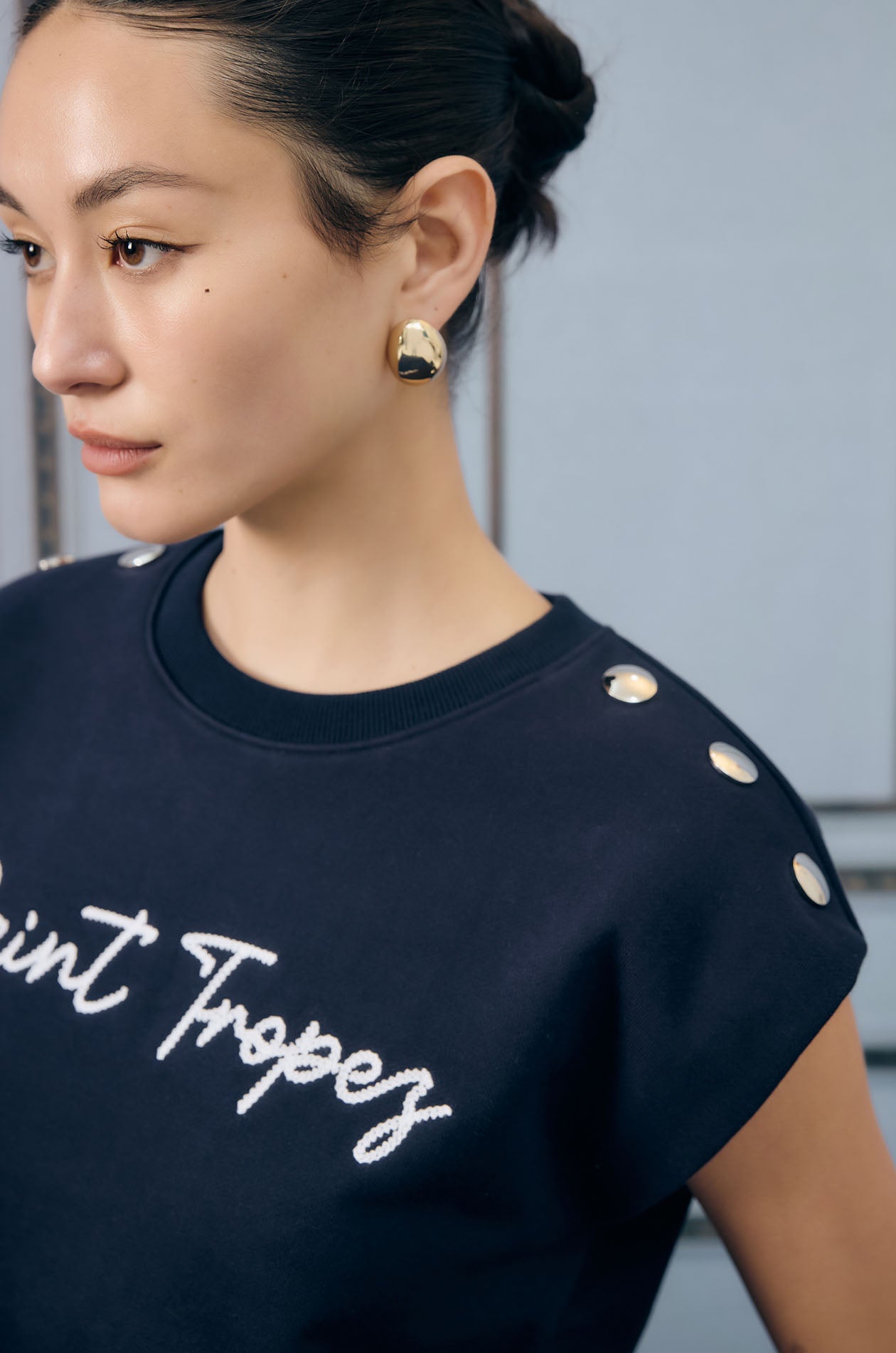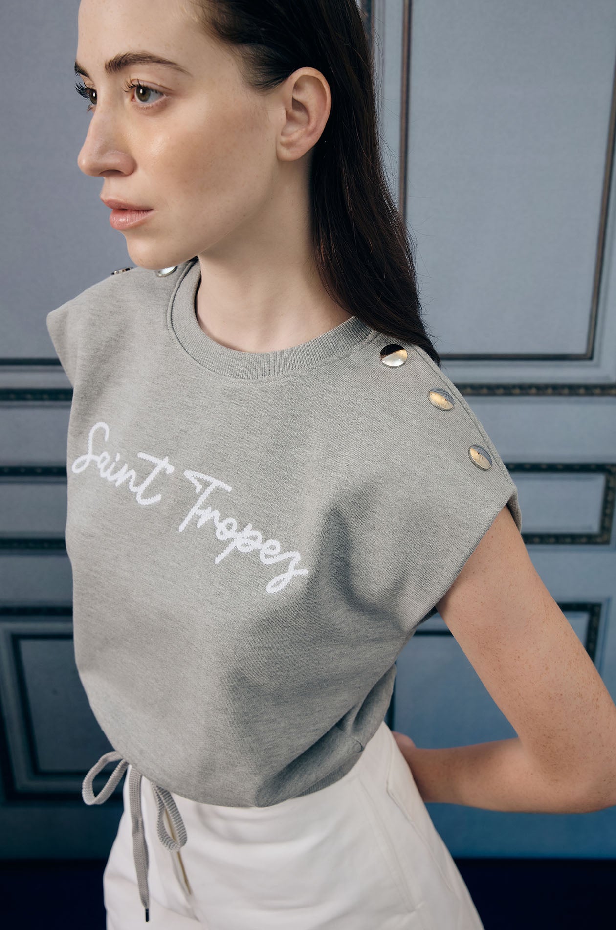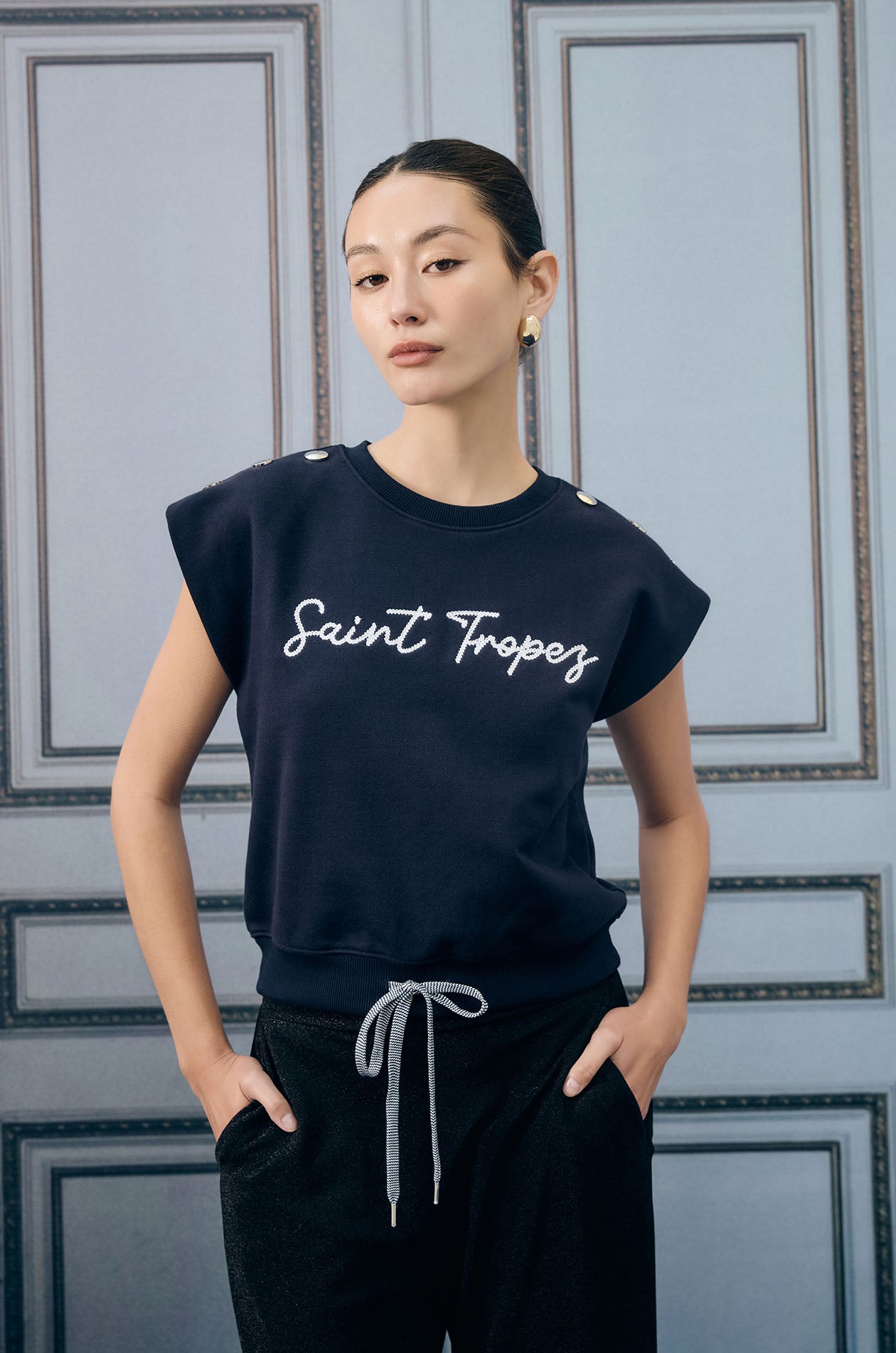 Cap-sleeved pullover top in sweat fabric. Relaxed fit with ribbed round neckline and drawstring hem for a sporty touch. Plaques applique at both shoulders. Available in grey and navy.