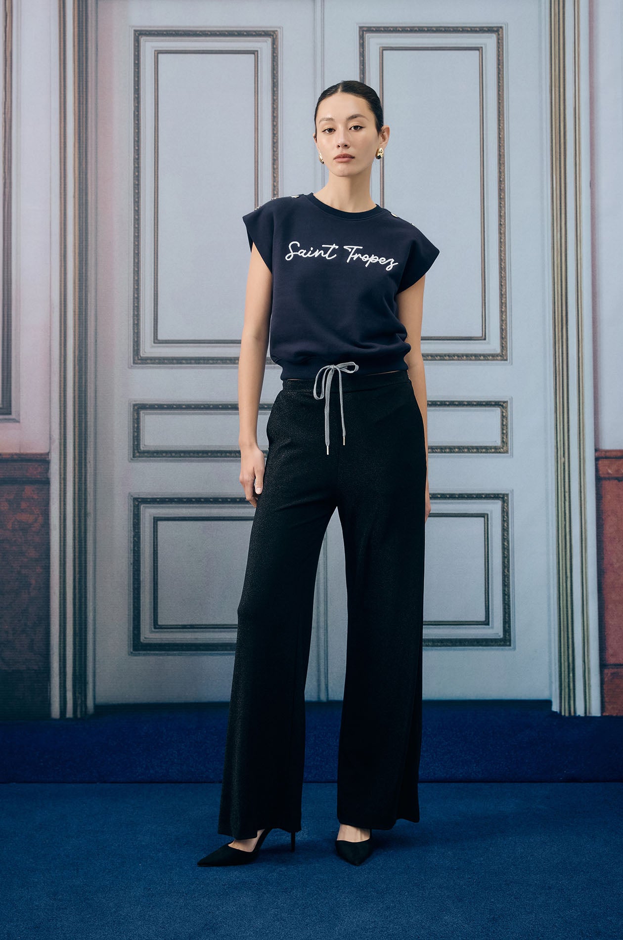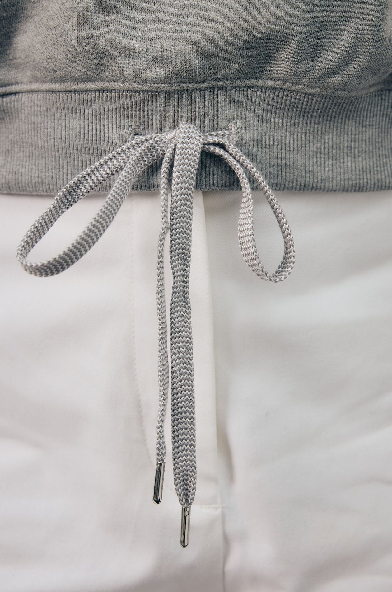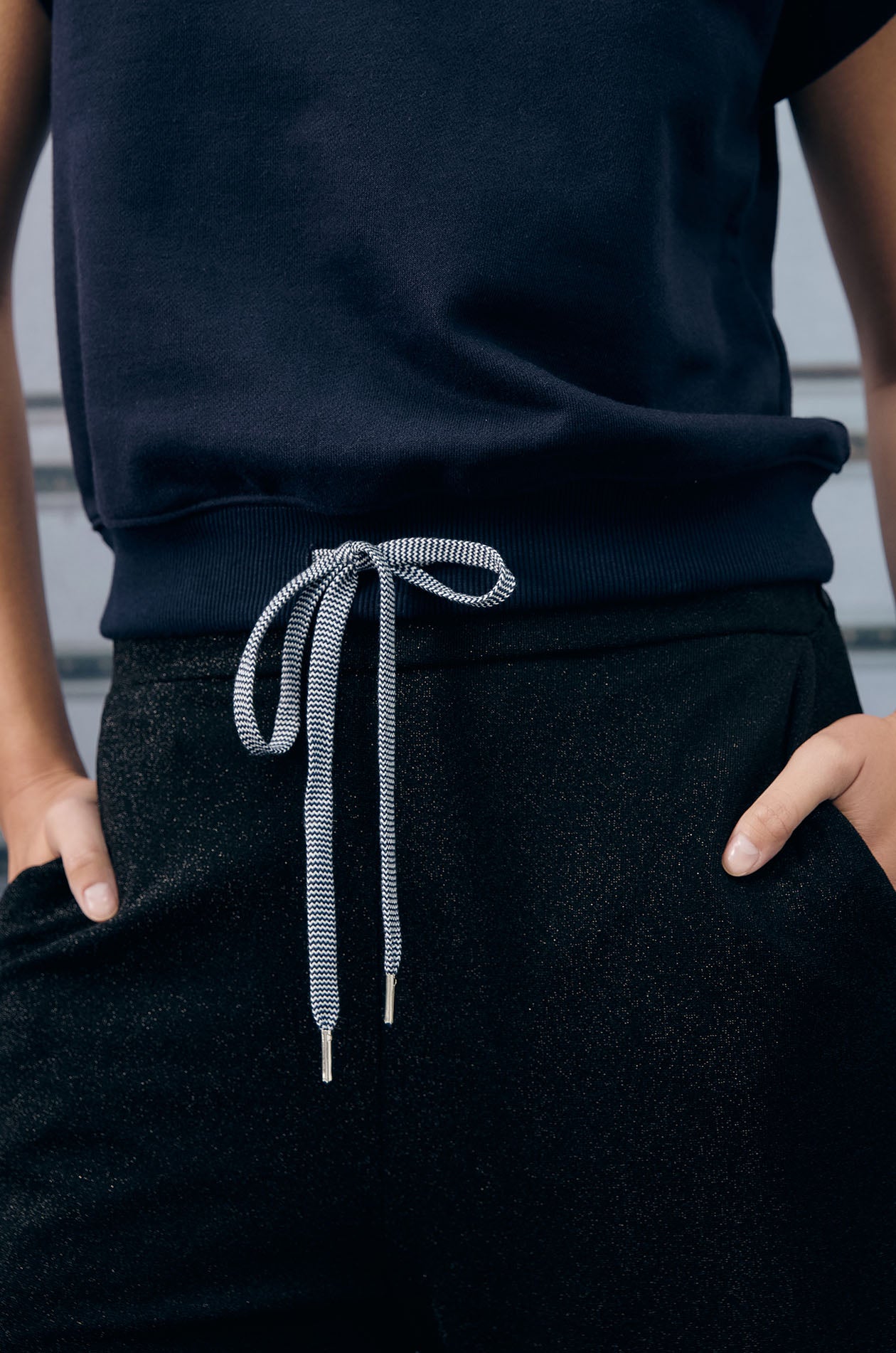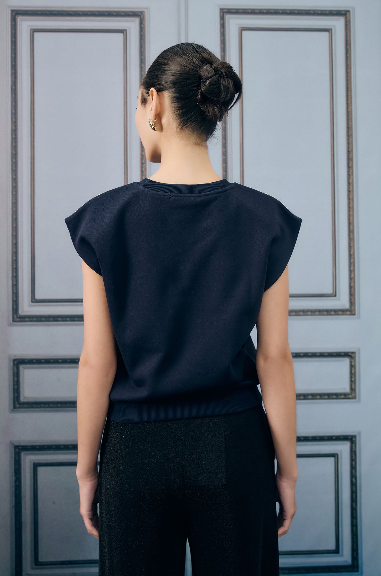 Cap-sleeved pullover top in sweat fabric. Relaxed fit with ribbed round neckline and drawstring hem for a sporty touch. Plaques applique at both shoulders. Available in grey and navy.