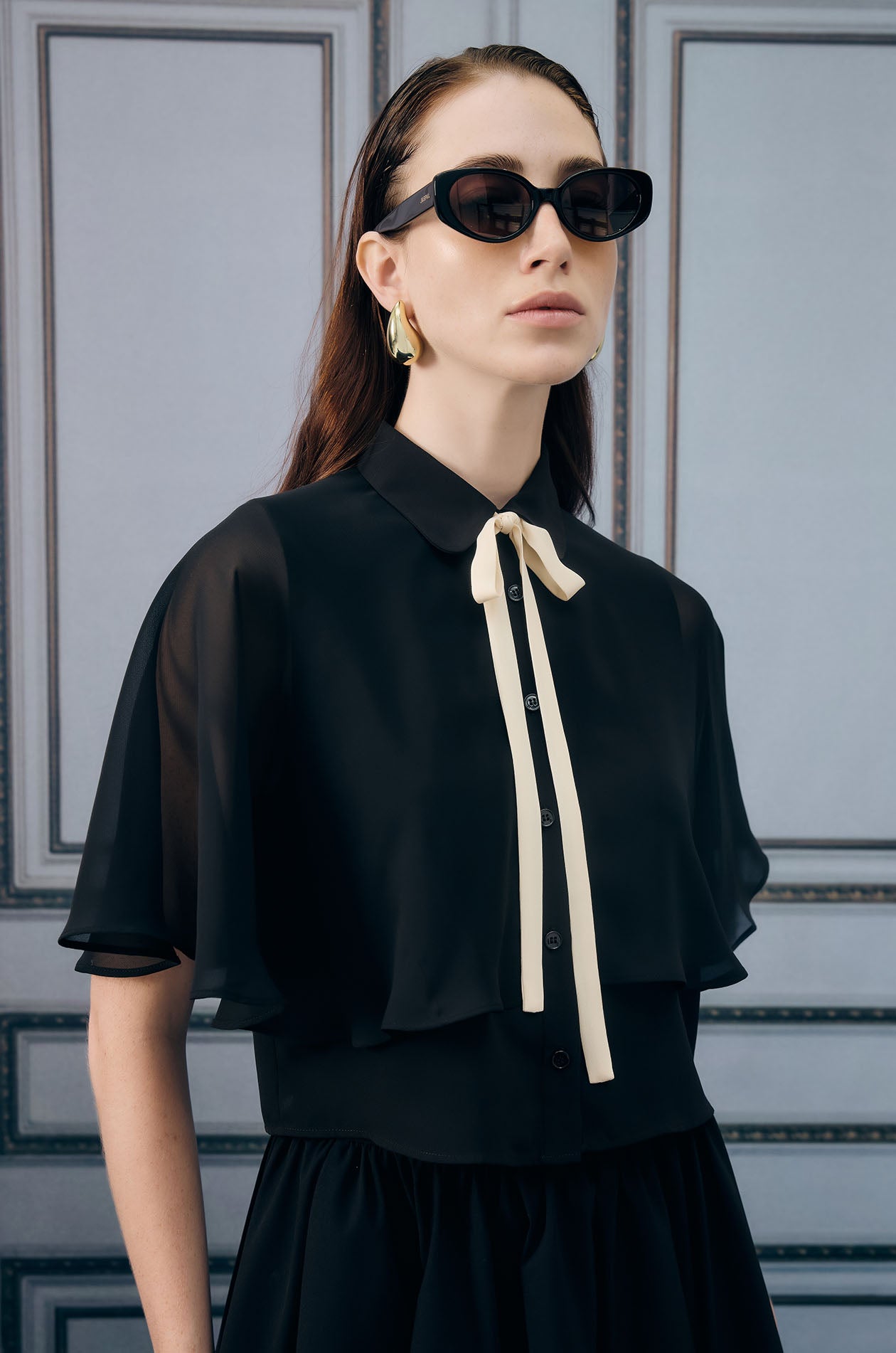Sleeveless blouse in chiffon. Round collar with contrast ribbon and cape detail. Demi-sheer with partial lining. Front button closure. Available in black.