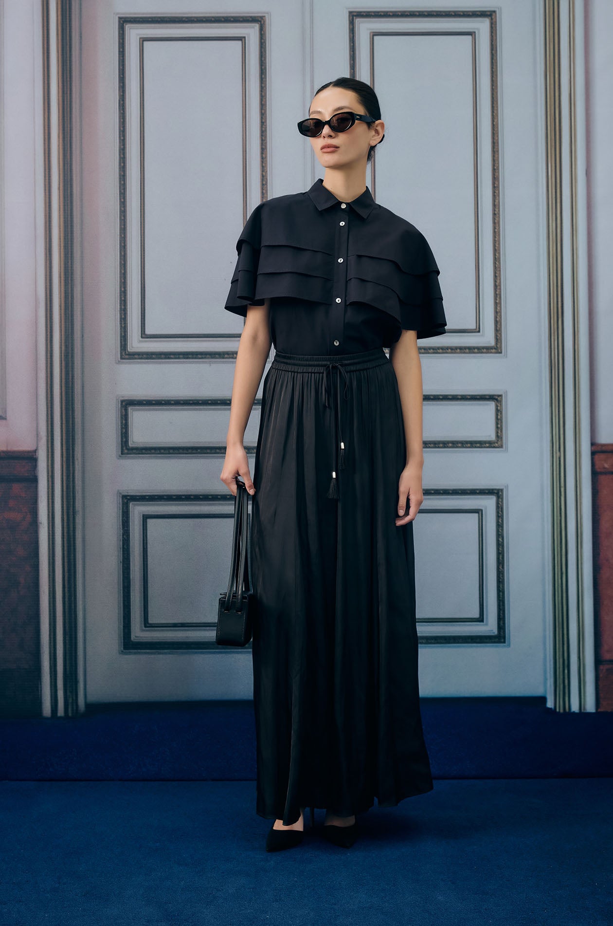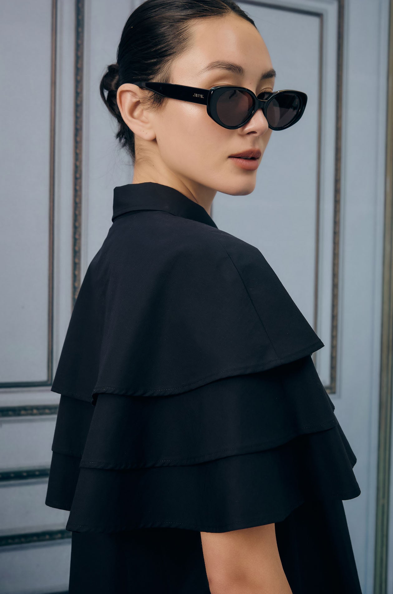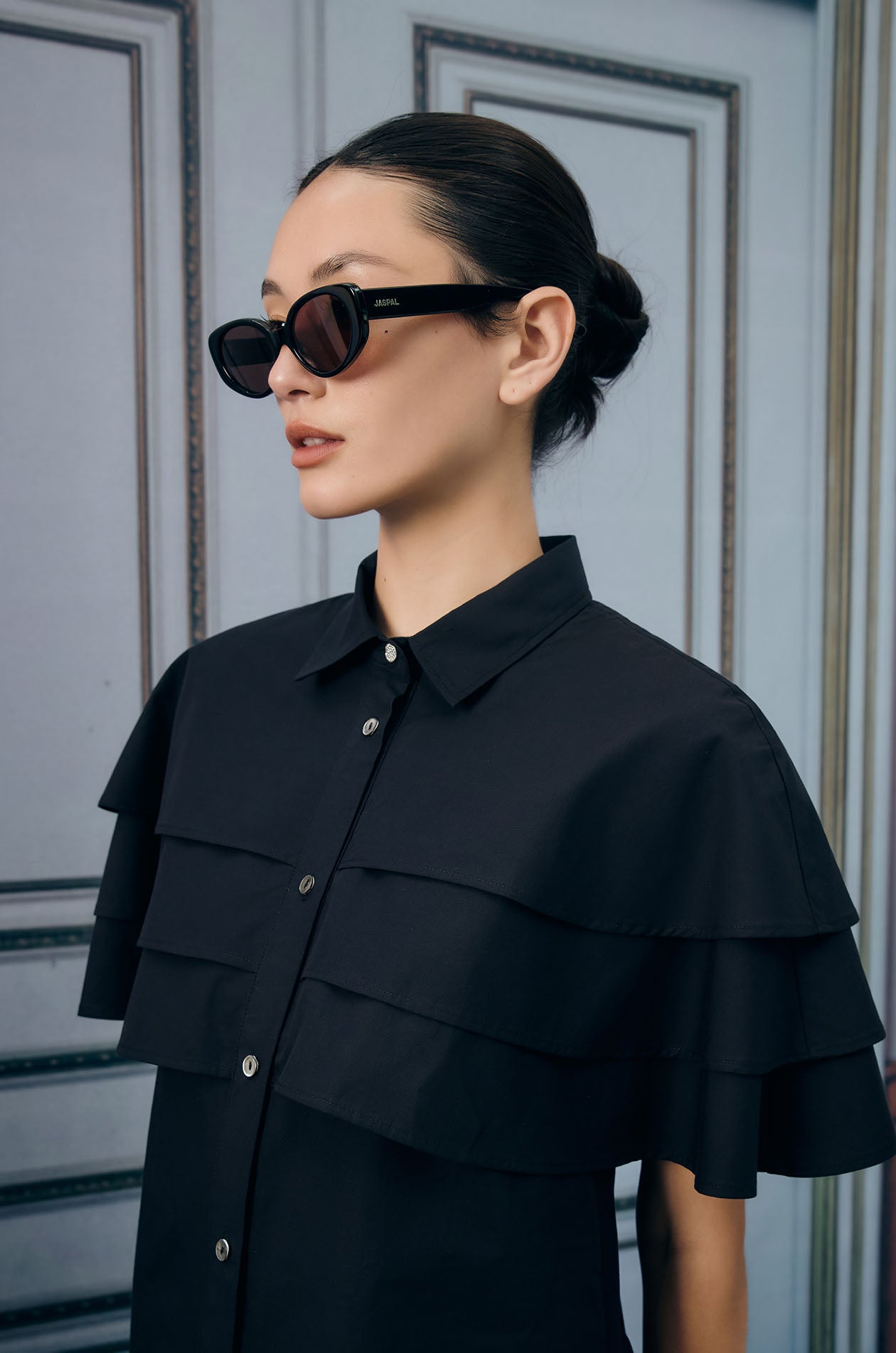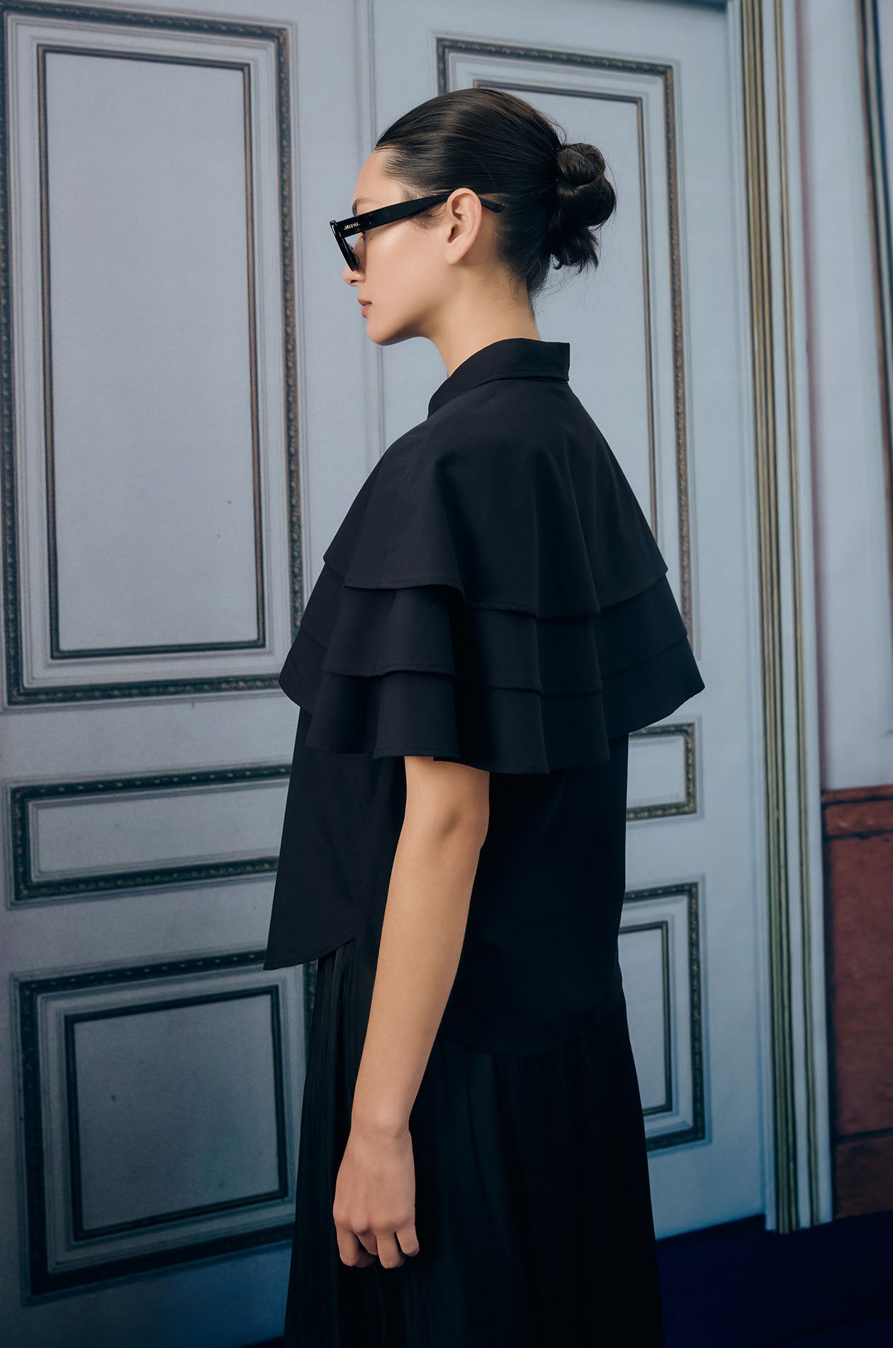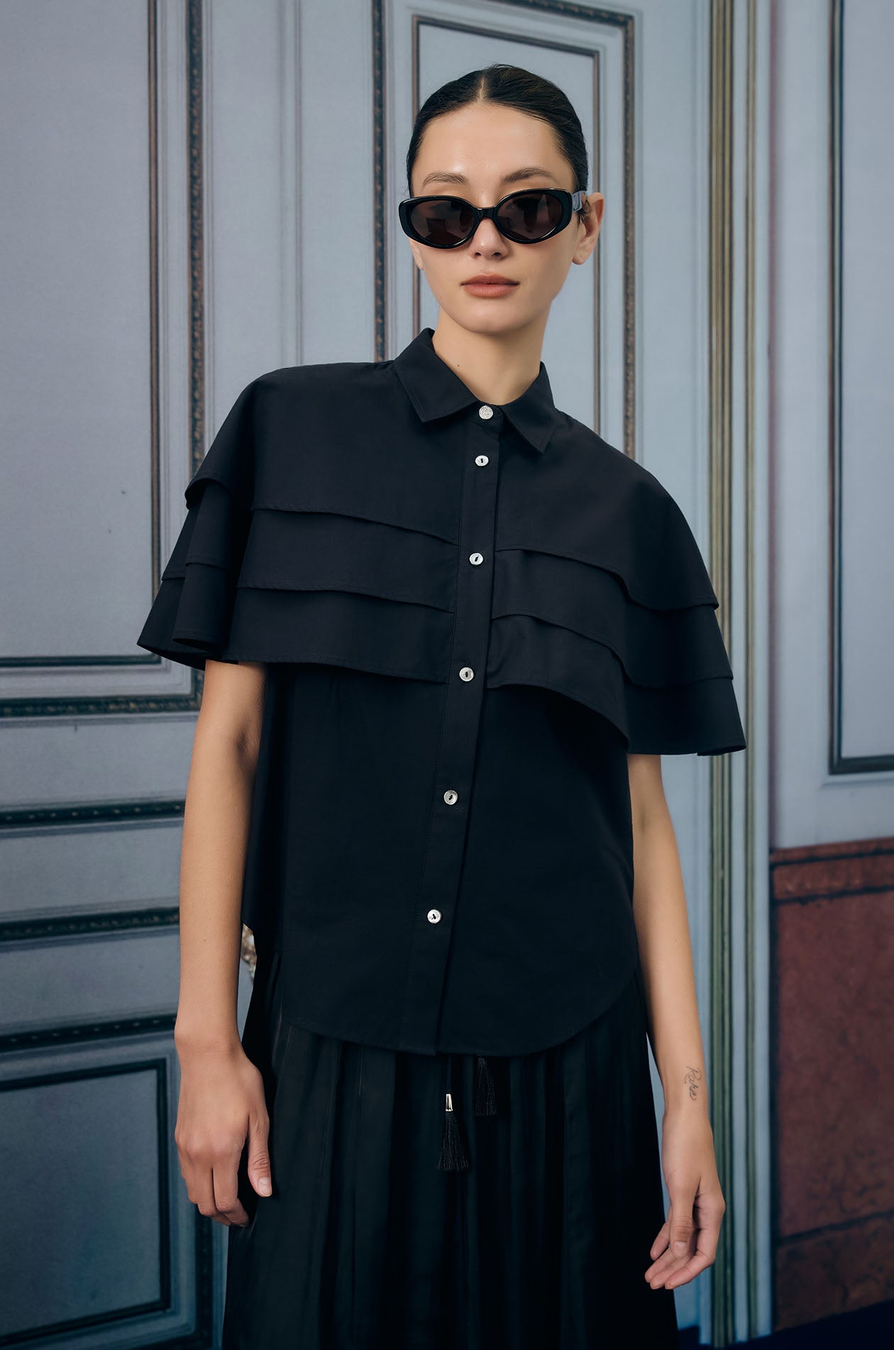 Sleeveless blouse in cotton poplin. Regular fit with classic collar and layered cape. Front button closure. Available in black.