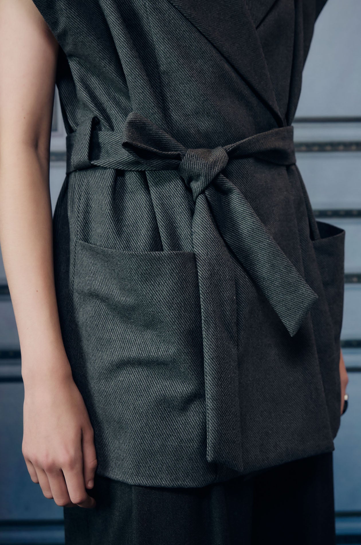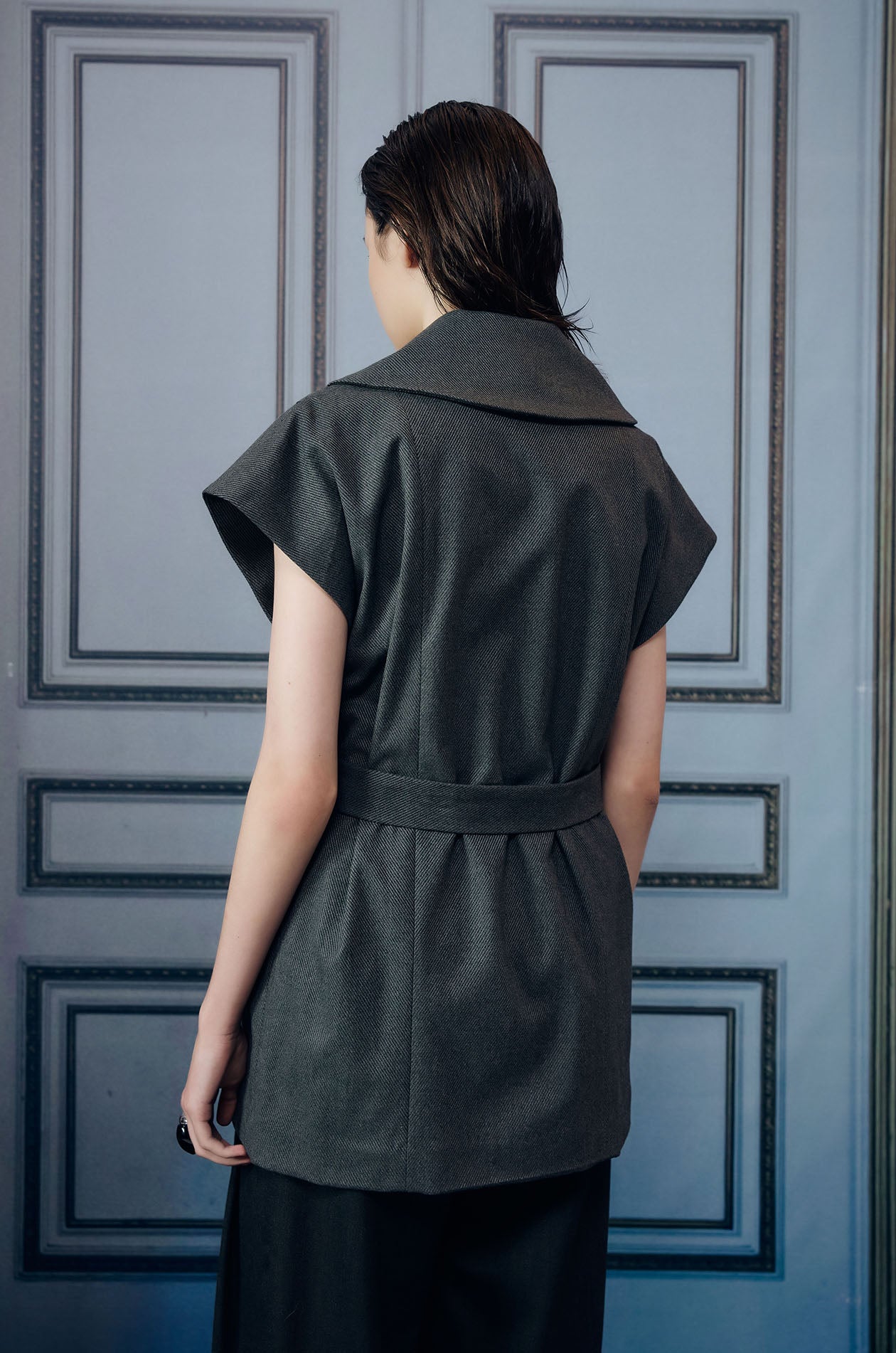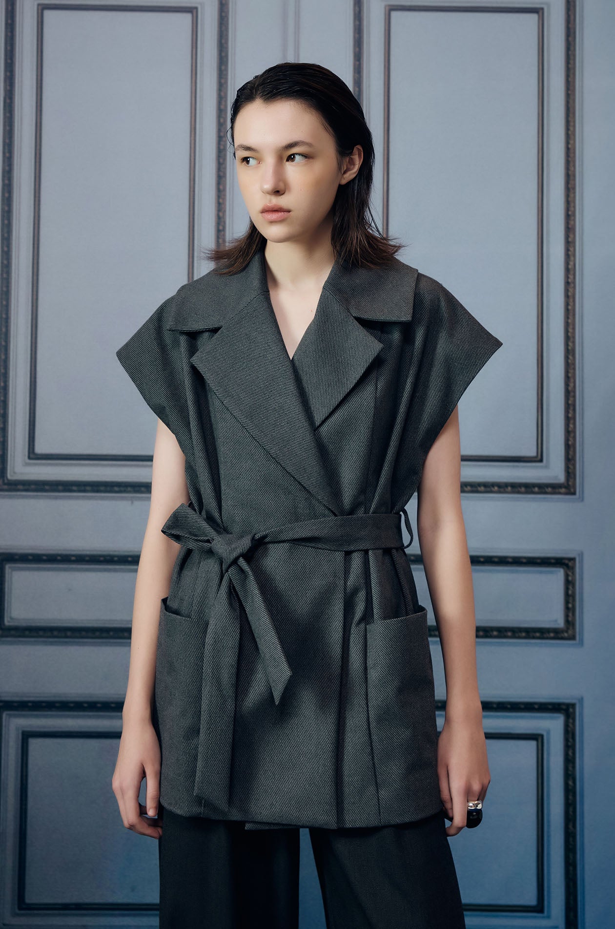 Double-breasted sleeveless blazer in crepe twill. Oversized fit with notch lapel, front pockets, and matching waist tie. Available in dark grey and cream.