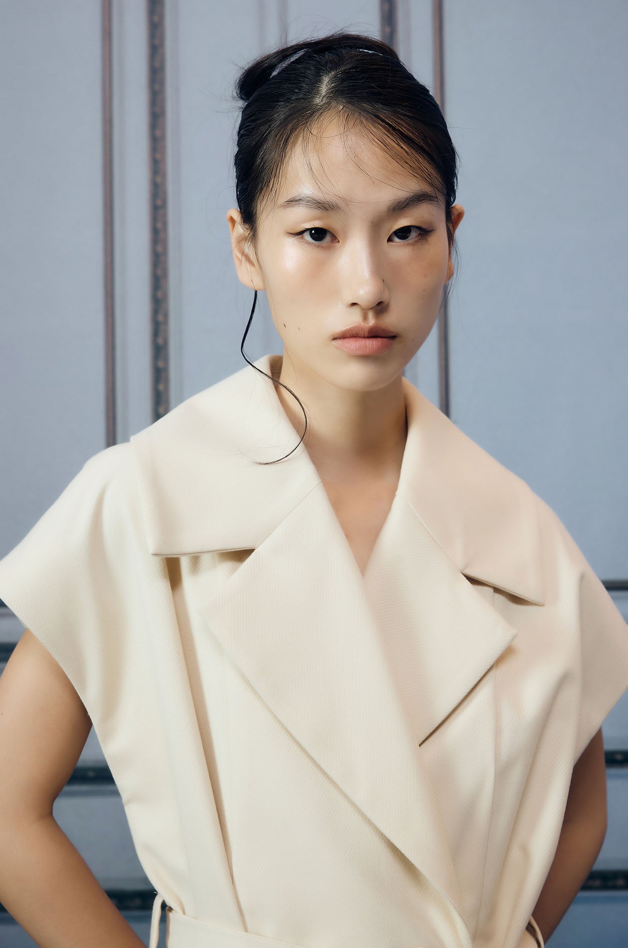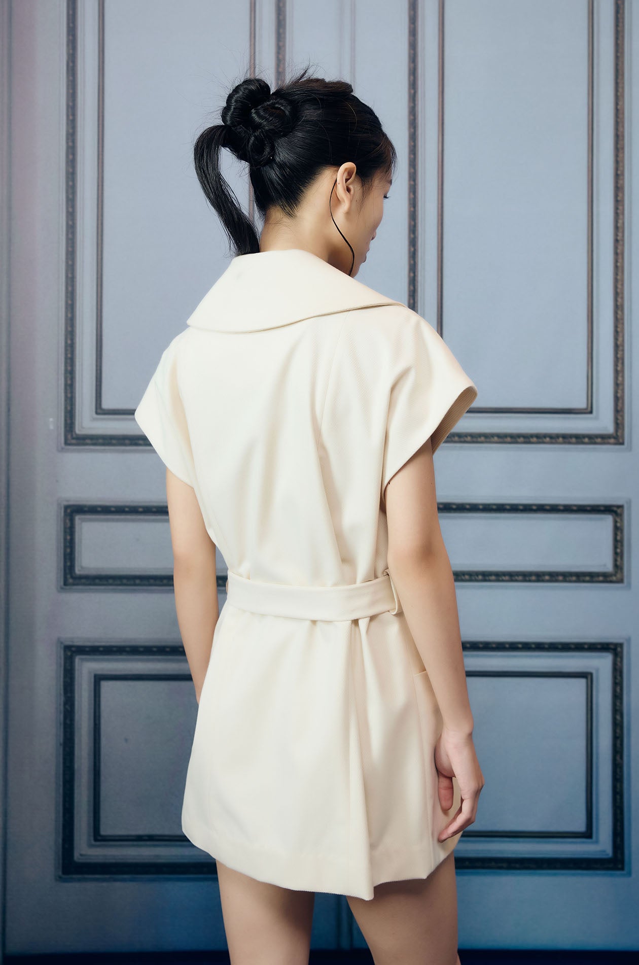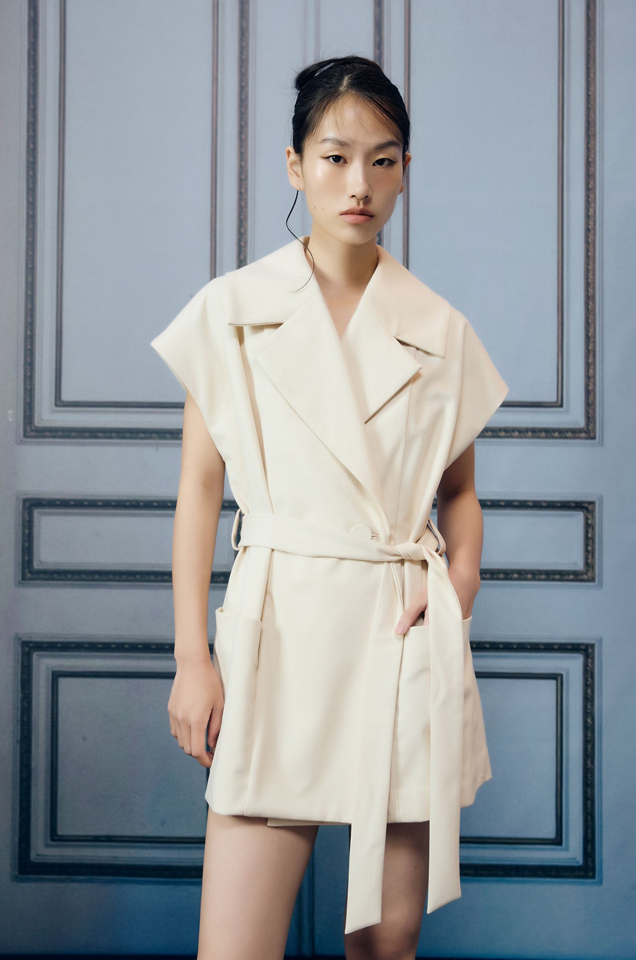 Double-breasted sleeveless blazer in crepe twill. Oversized fit with notch lapel, front pockets, and matching waist tie. Available in dark grey and cream.