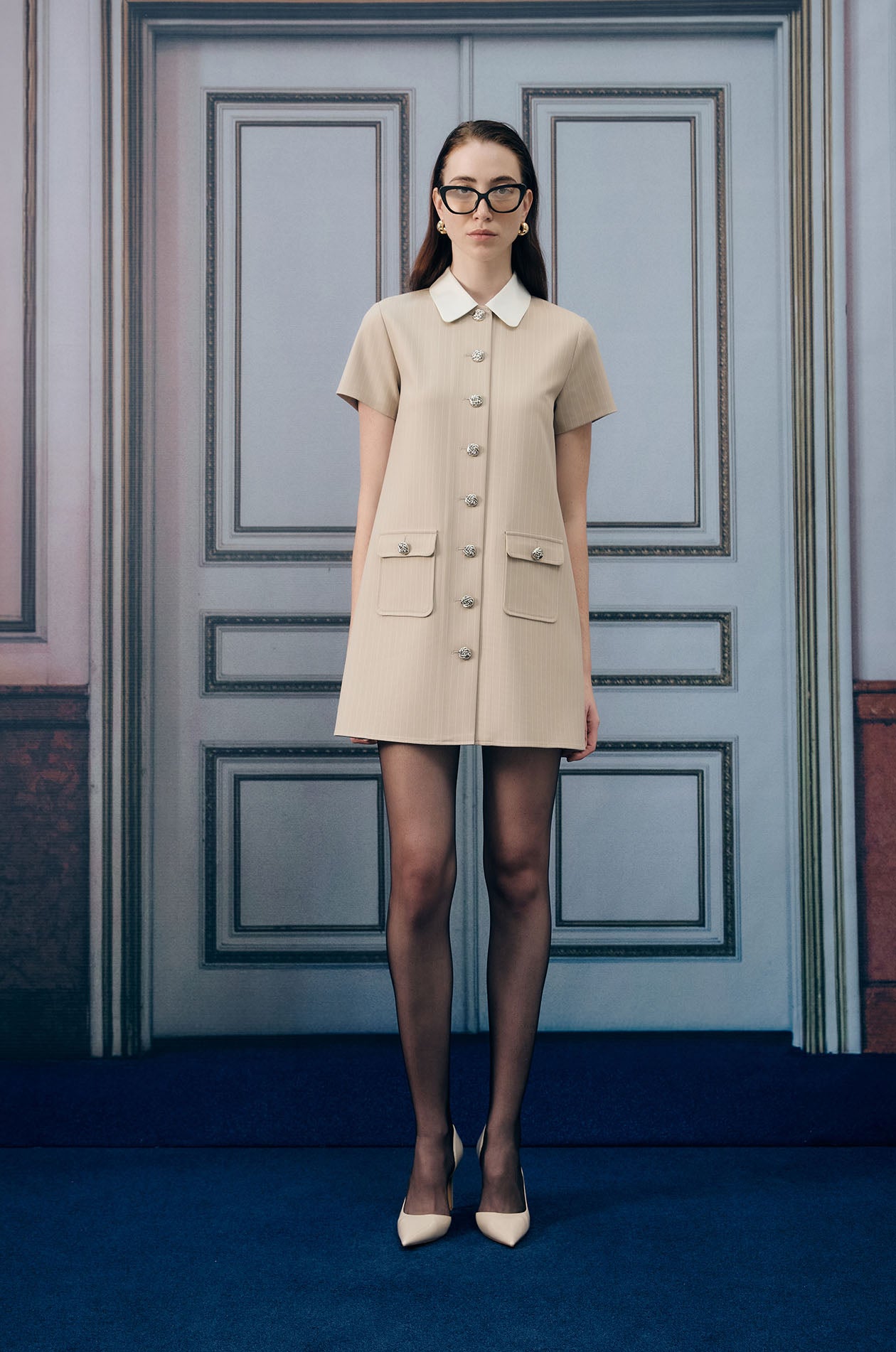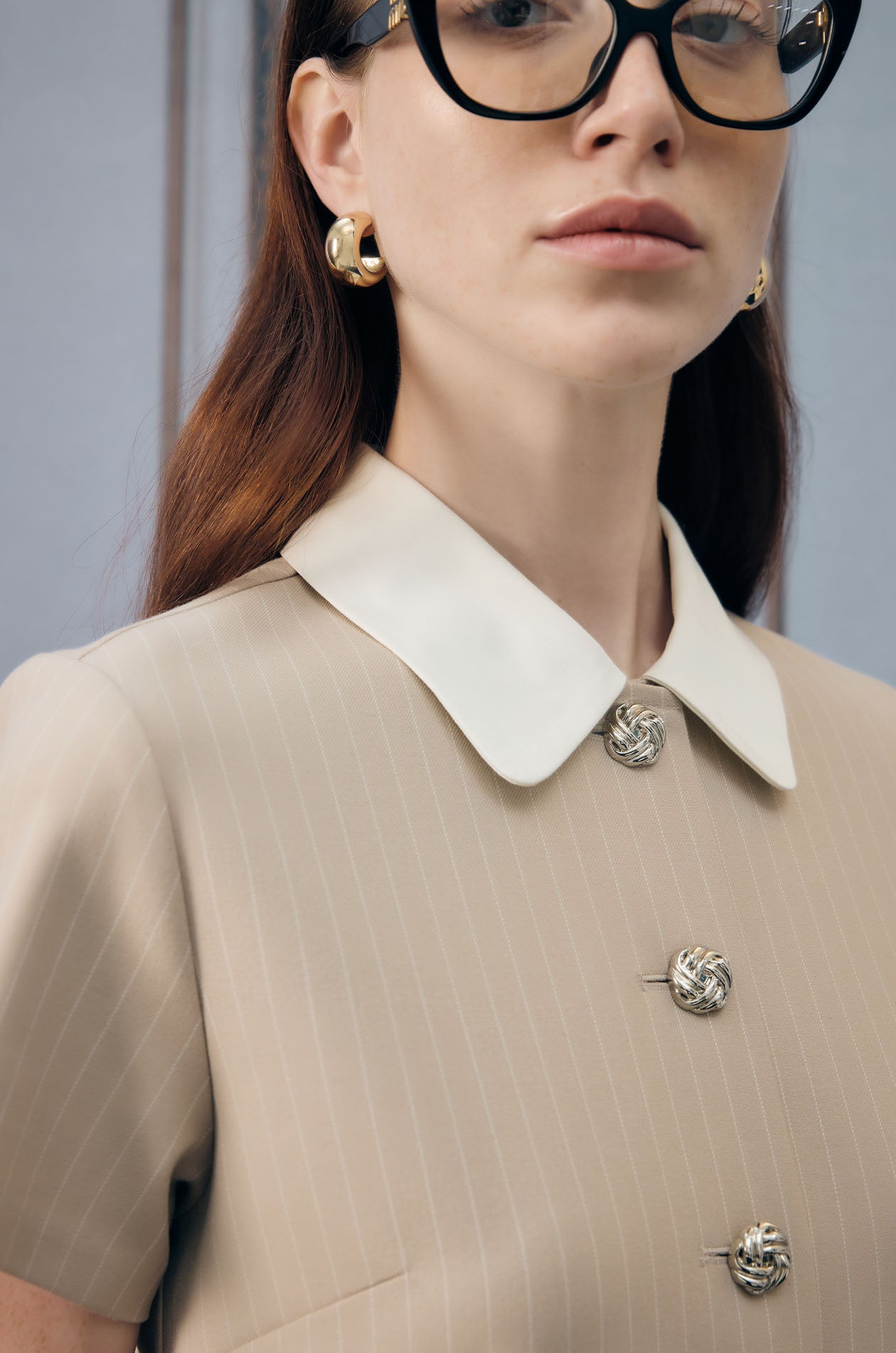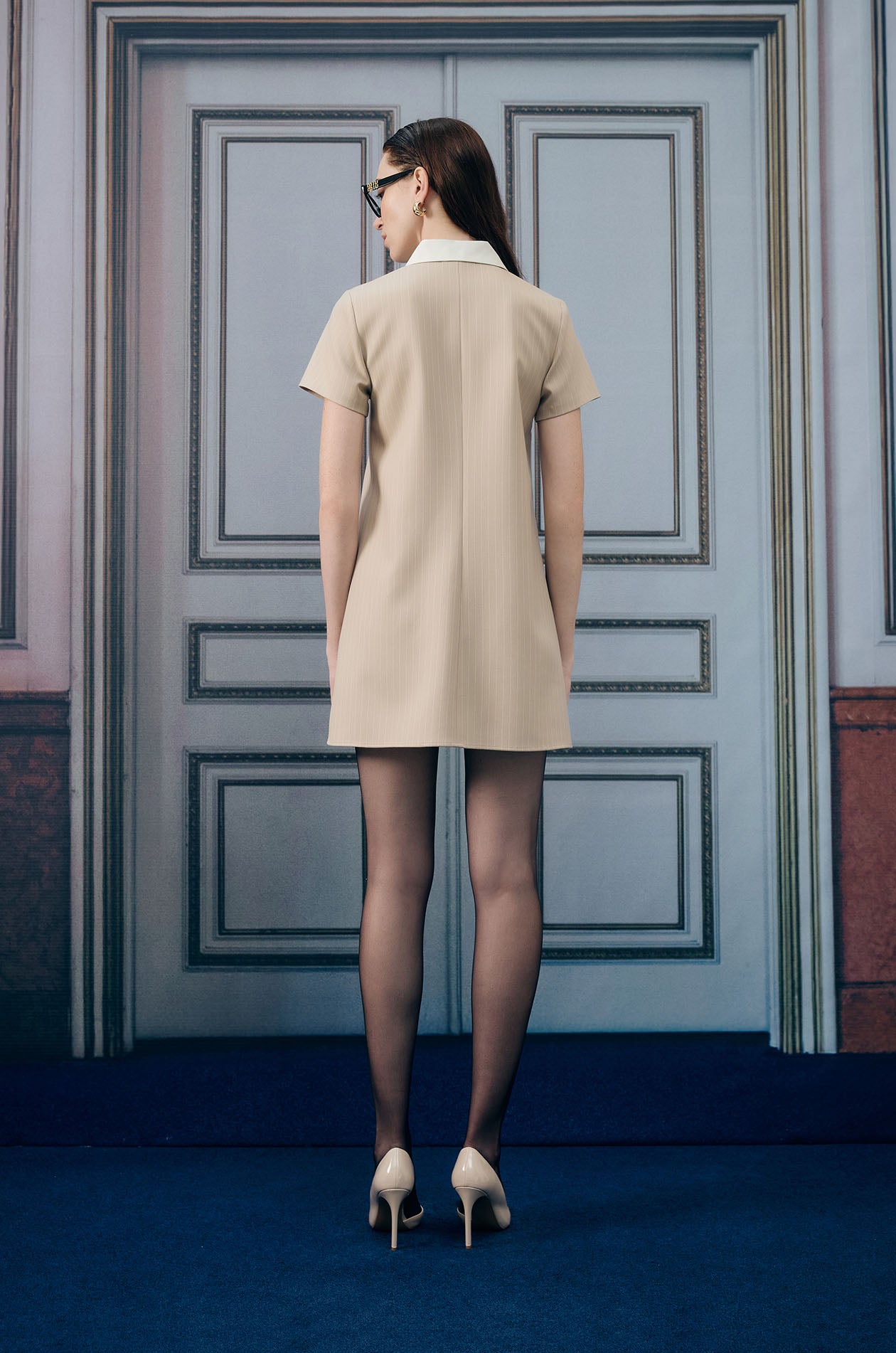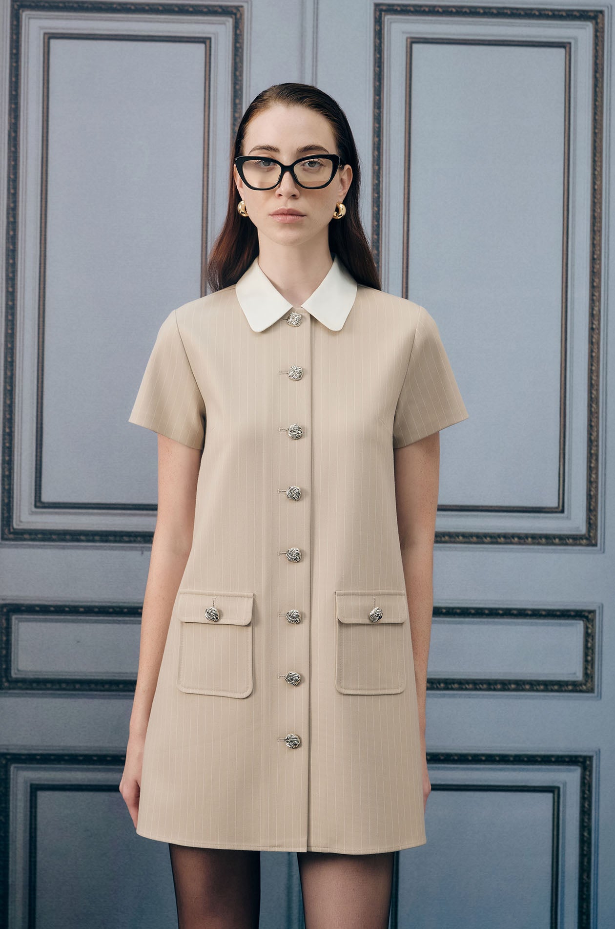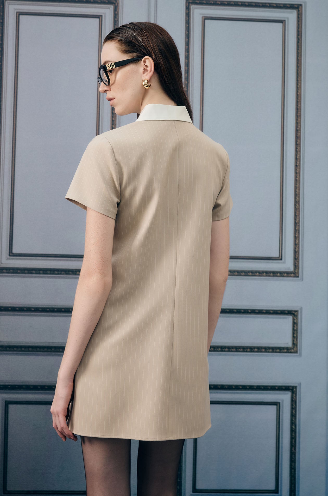 Short-sleeved mini dress in crepe twill with pinstripes. Shift silhouette with classic collar and front pockets. Front button closure. Available in beige.