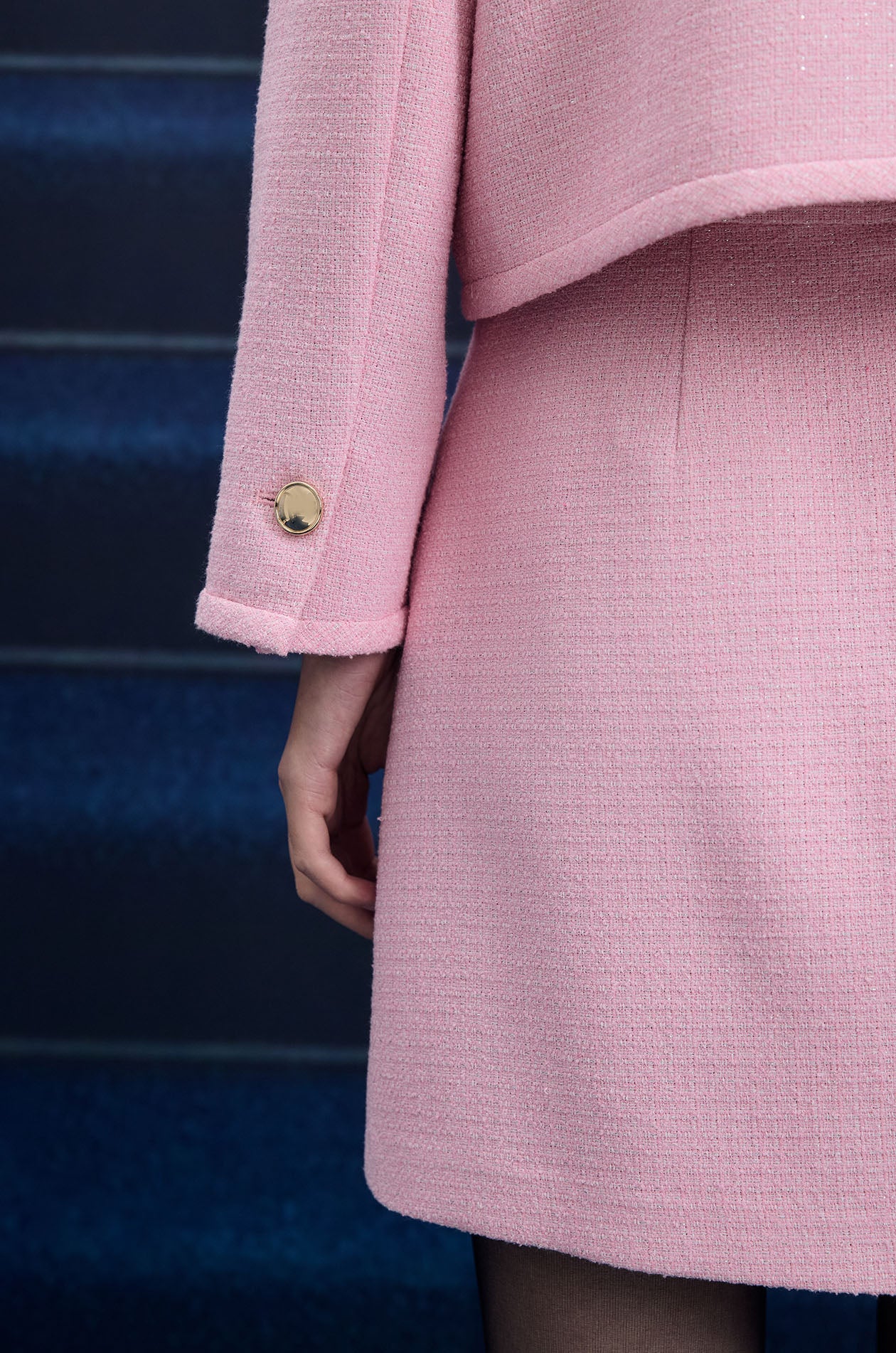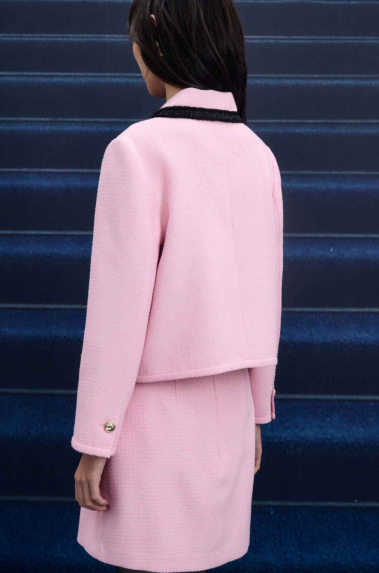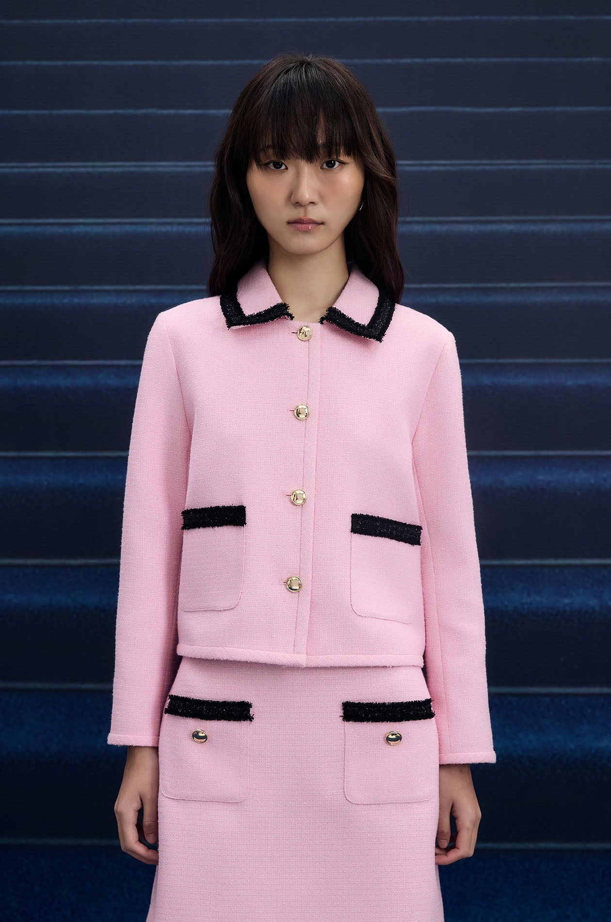 Lady jacket in metallic tweed. Accented with black tweed trim. Regular fit with spread collar and front pockets. Front button closure. Available in pink.