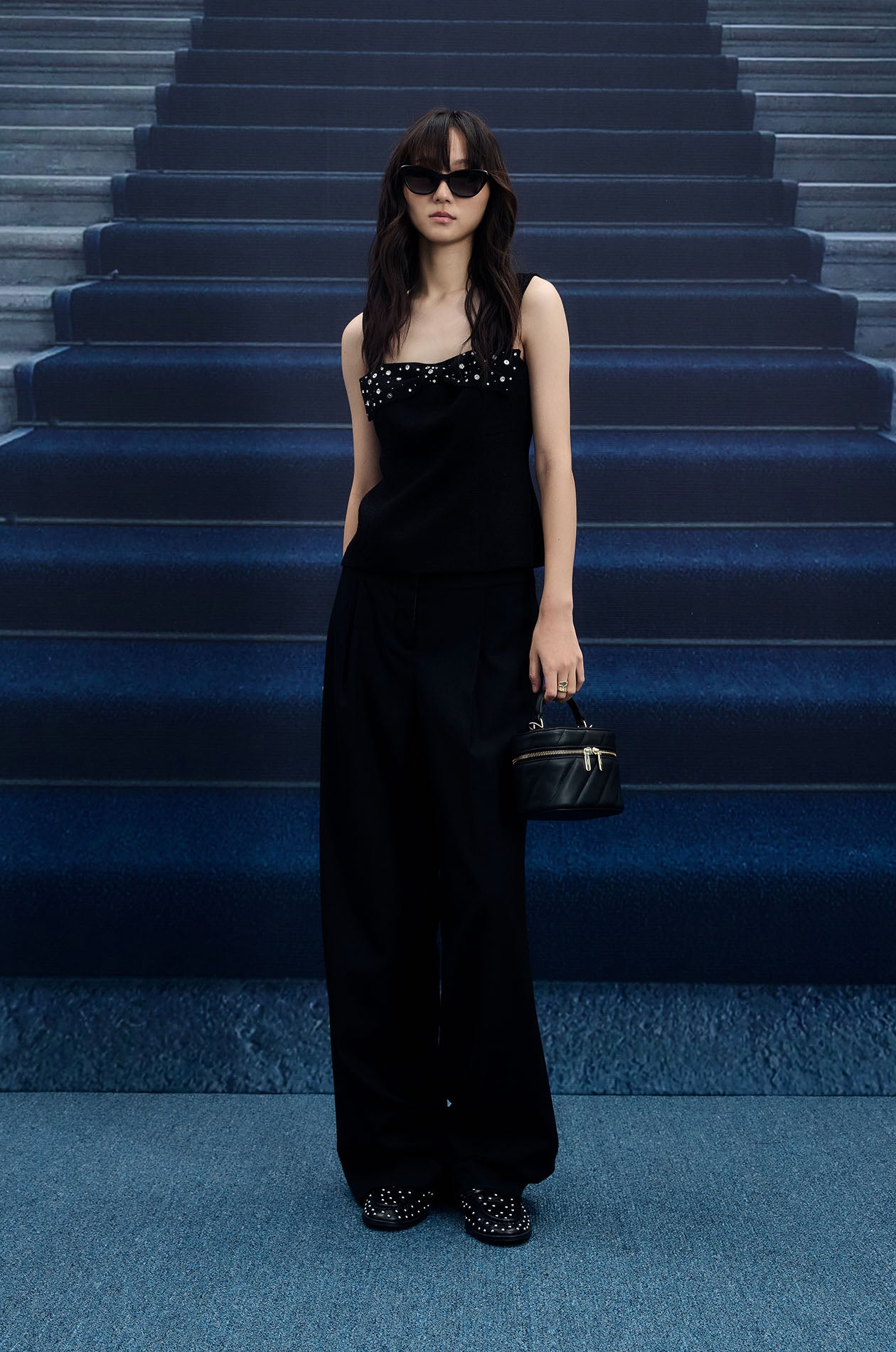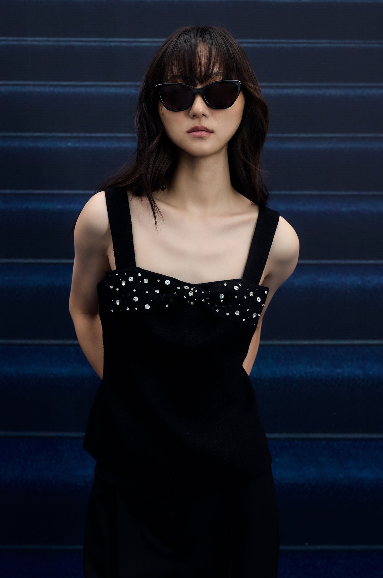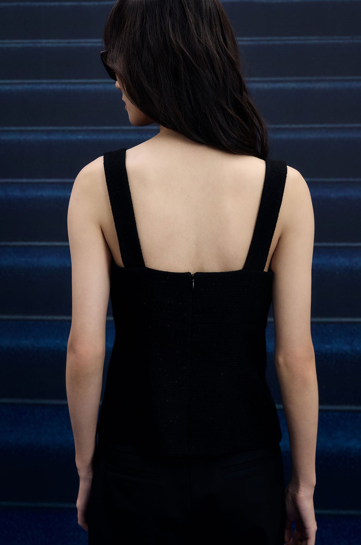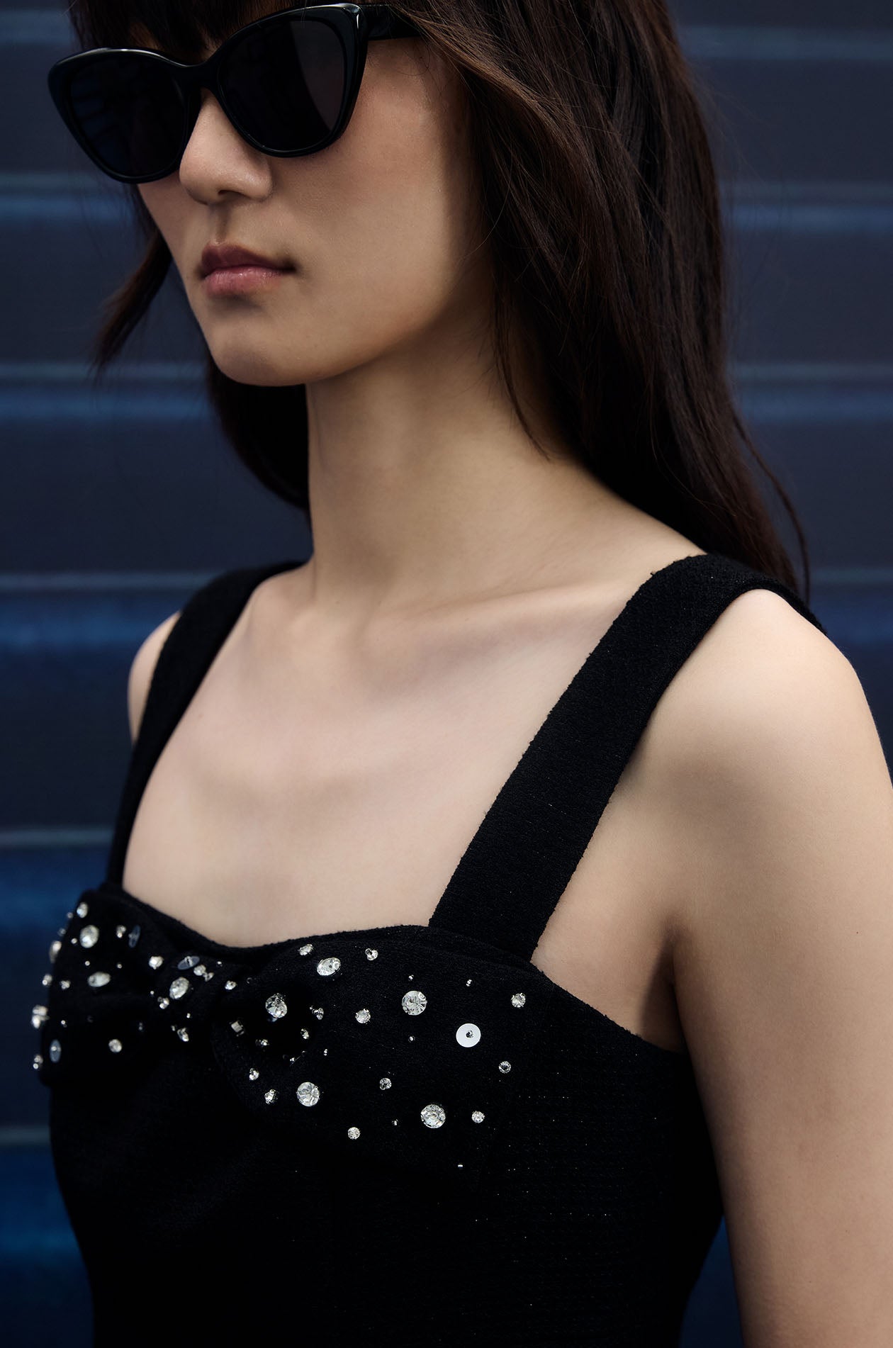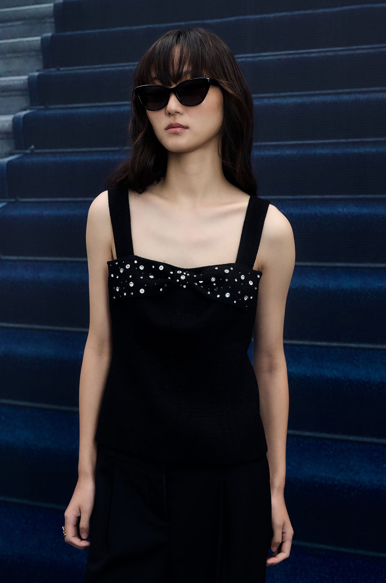 Strappy top in boucle fabric. Straight neckline with bow accent and rhinestones embellishment. Back zip closure. Available in black.
