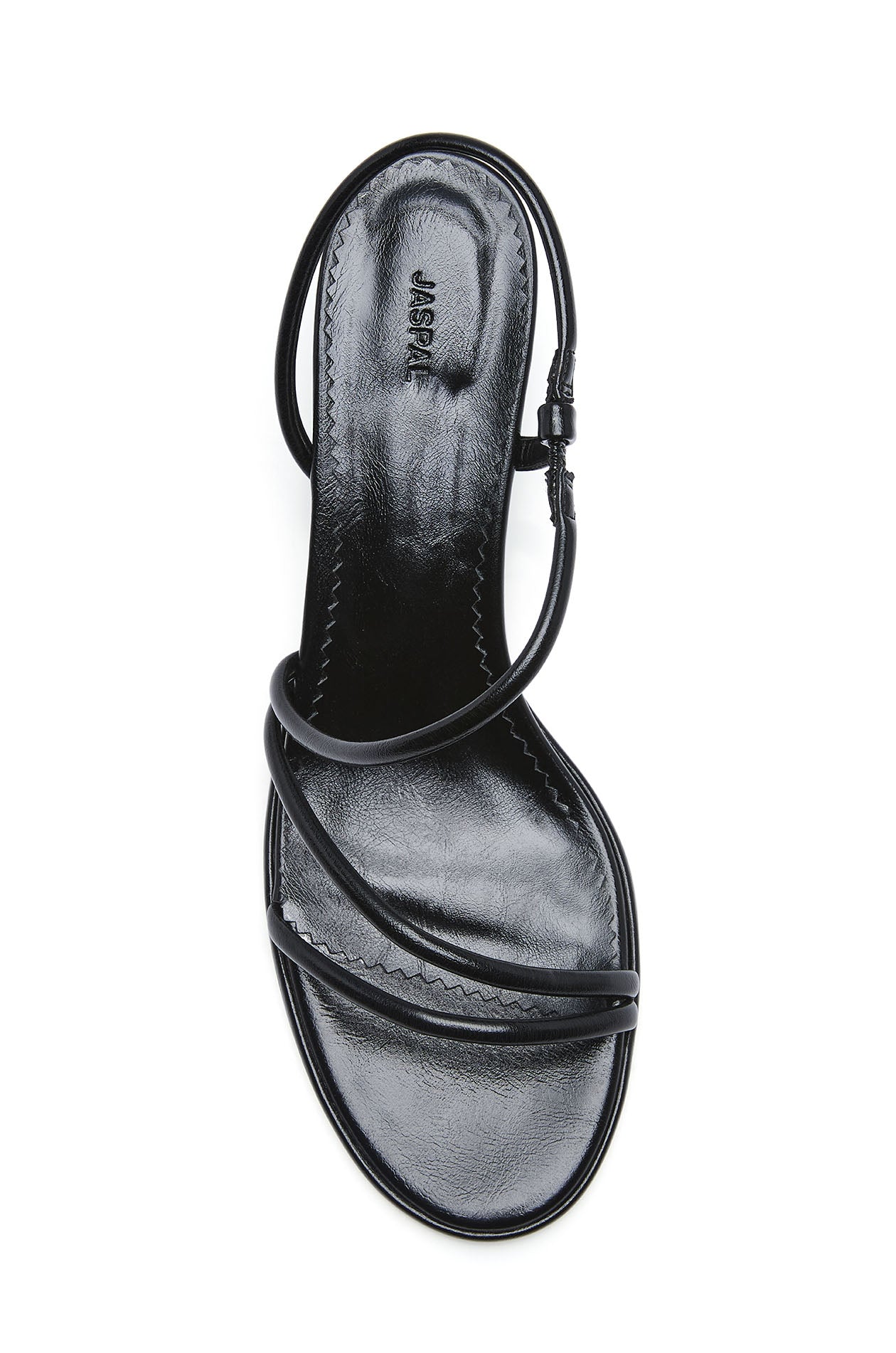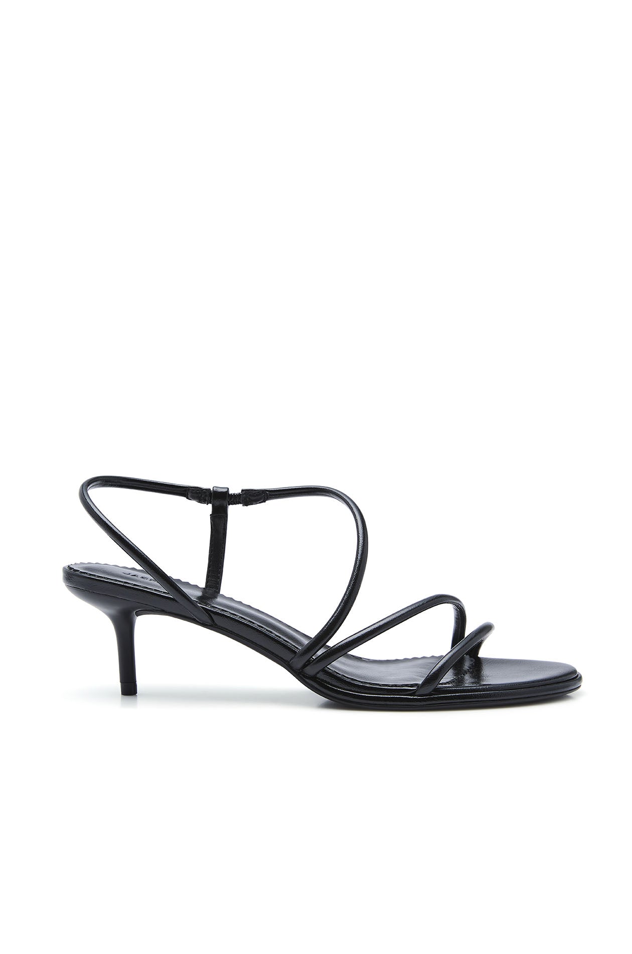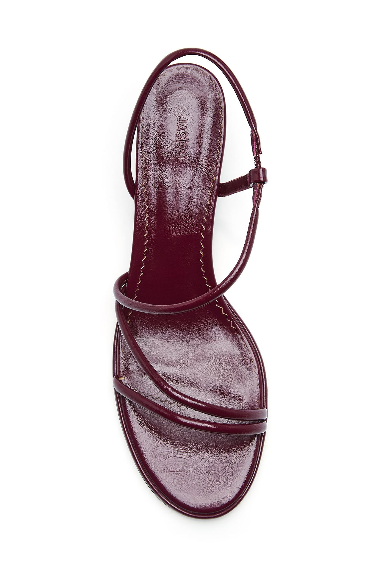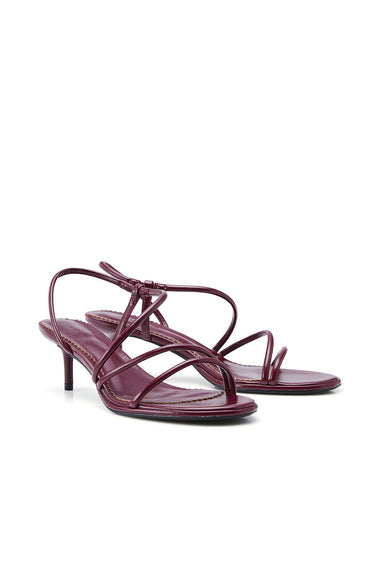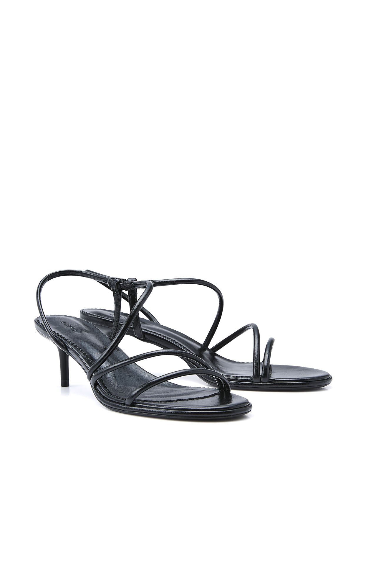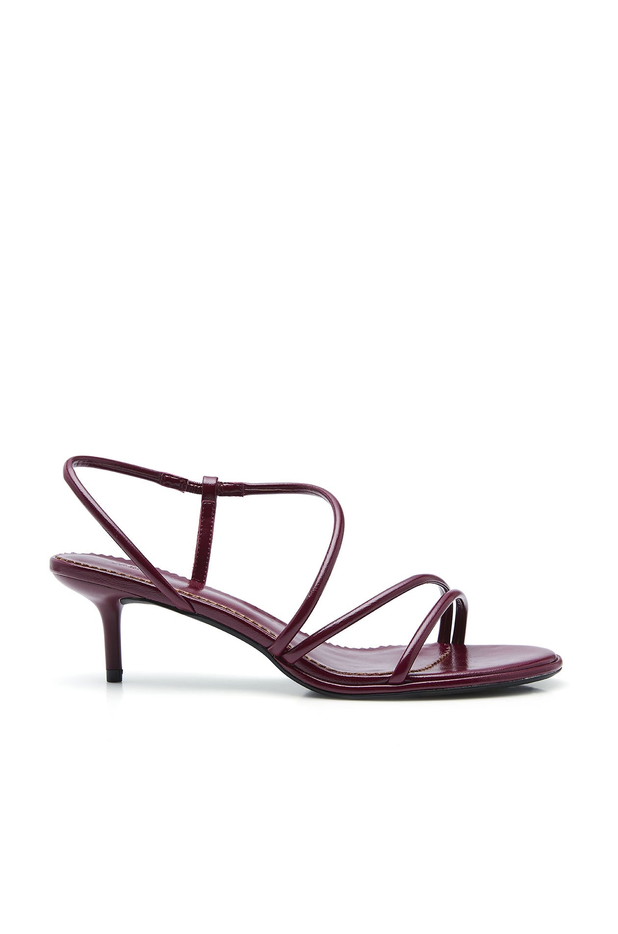 Round-toe sandals in faux leather with skinny straps. Mid heeled. Available in black and red.