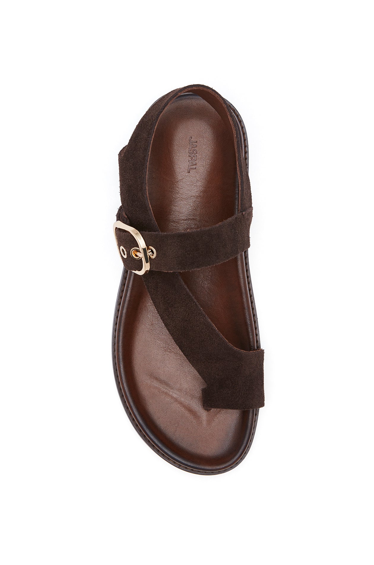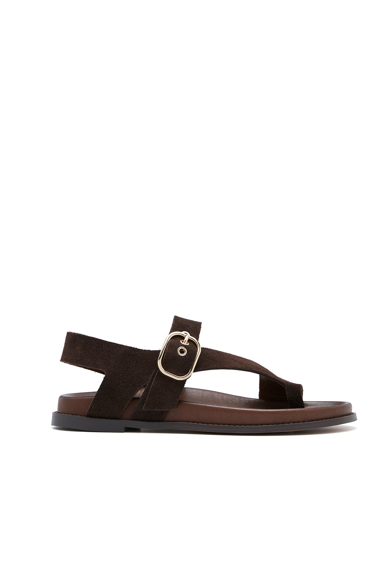 Open round-toe sandals in cow leather with belt buckle strap and toe ring. Available in brown.