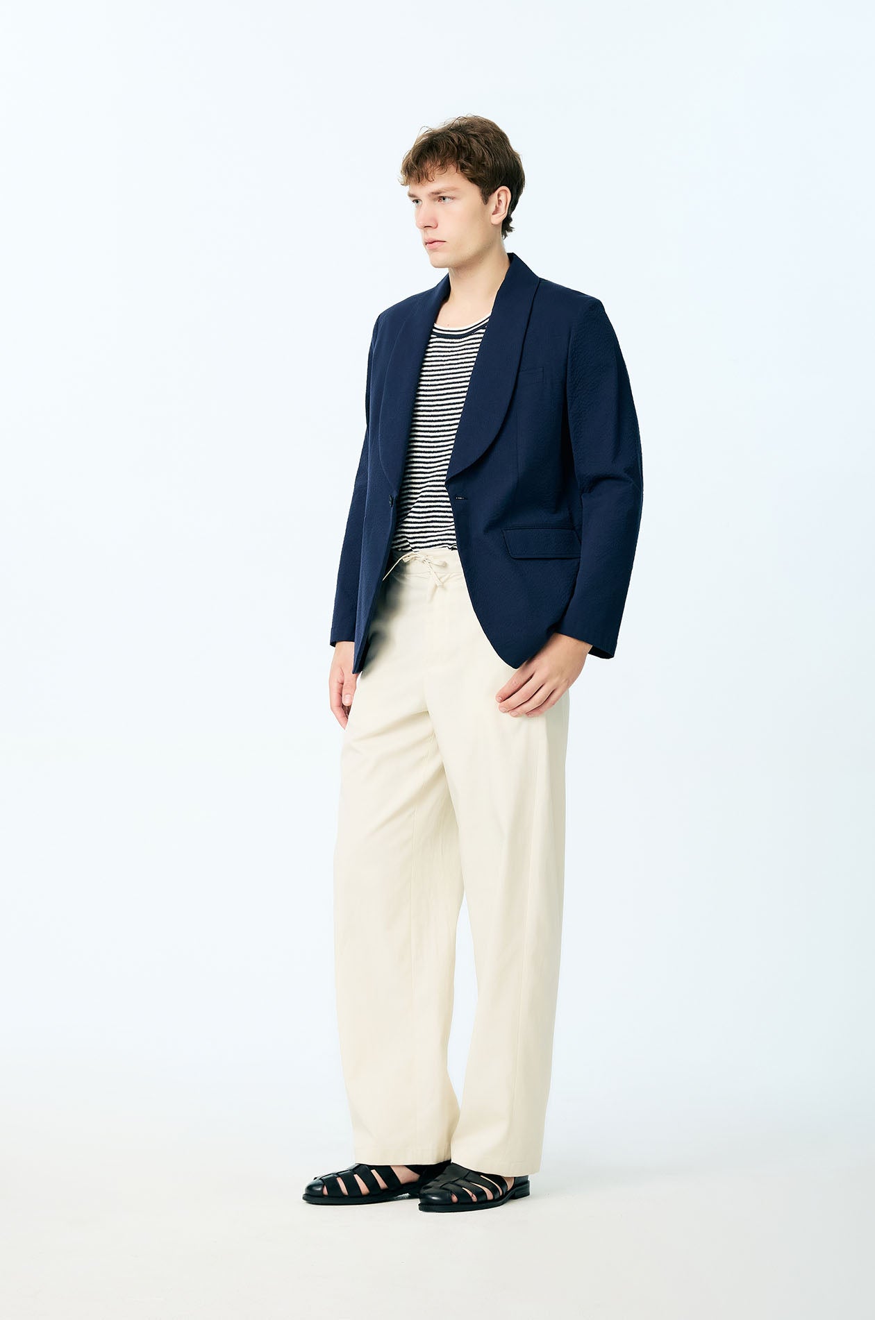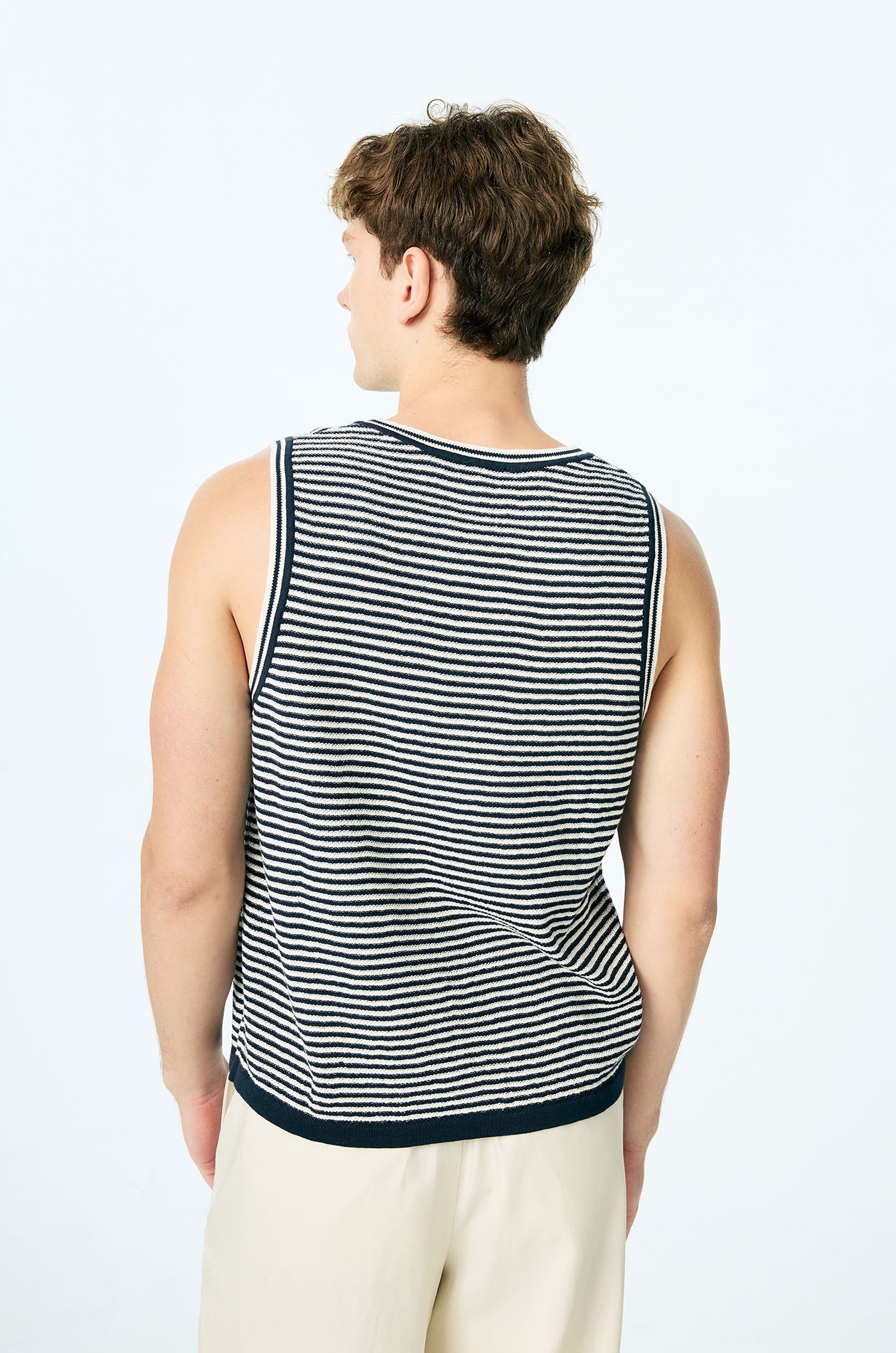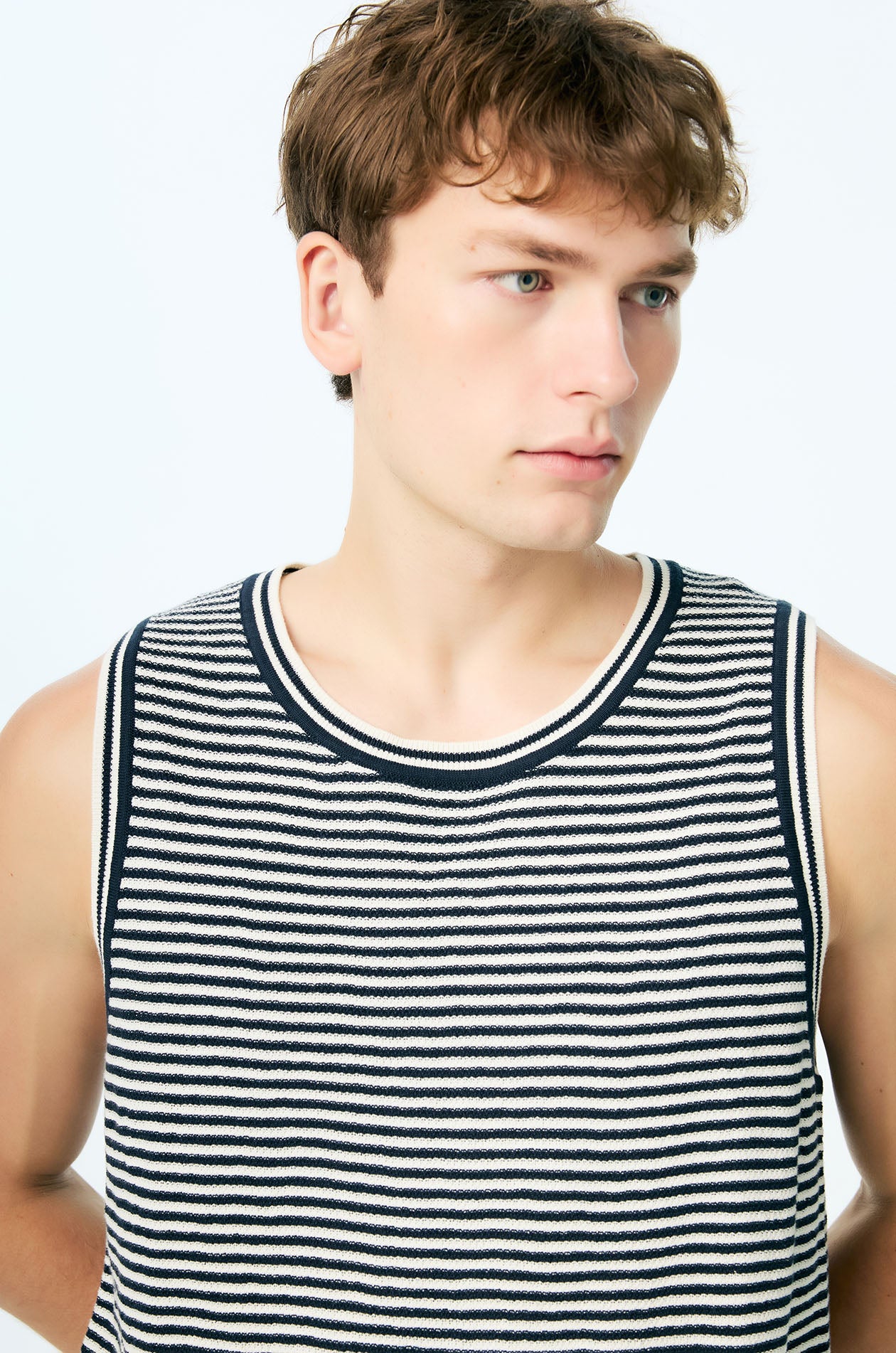 Round-neck tank top crafted from textured knit with clean striped detailing. Designed in a relaxed silhouette for an easy, modern layer. Available in navy.