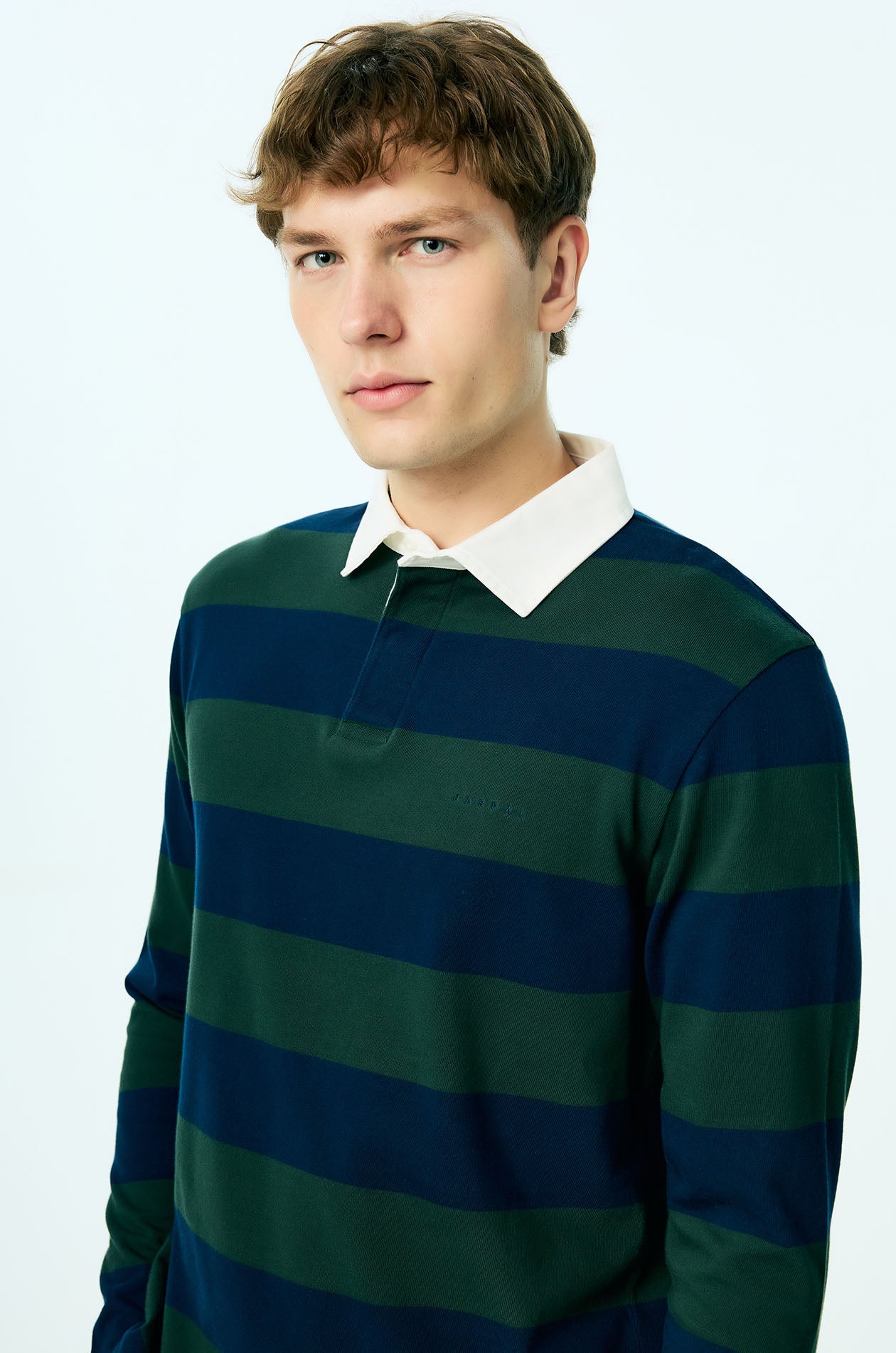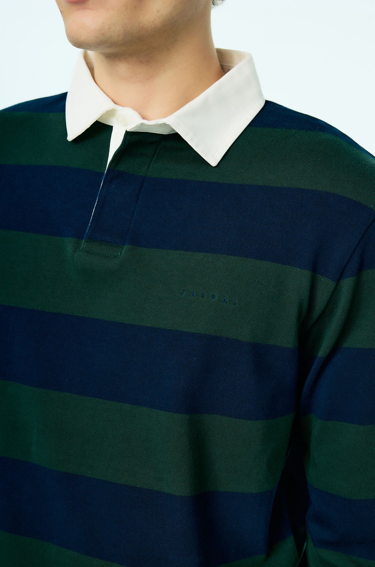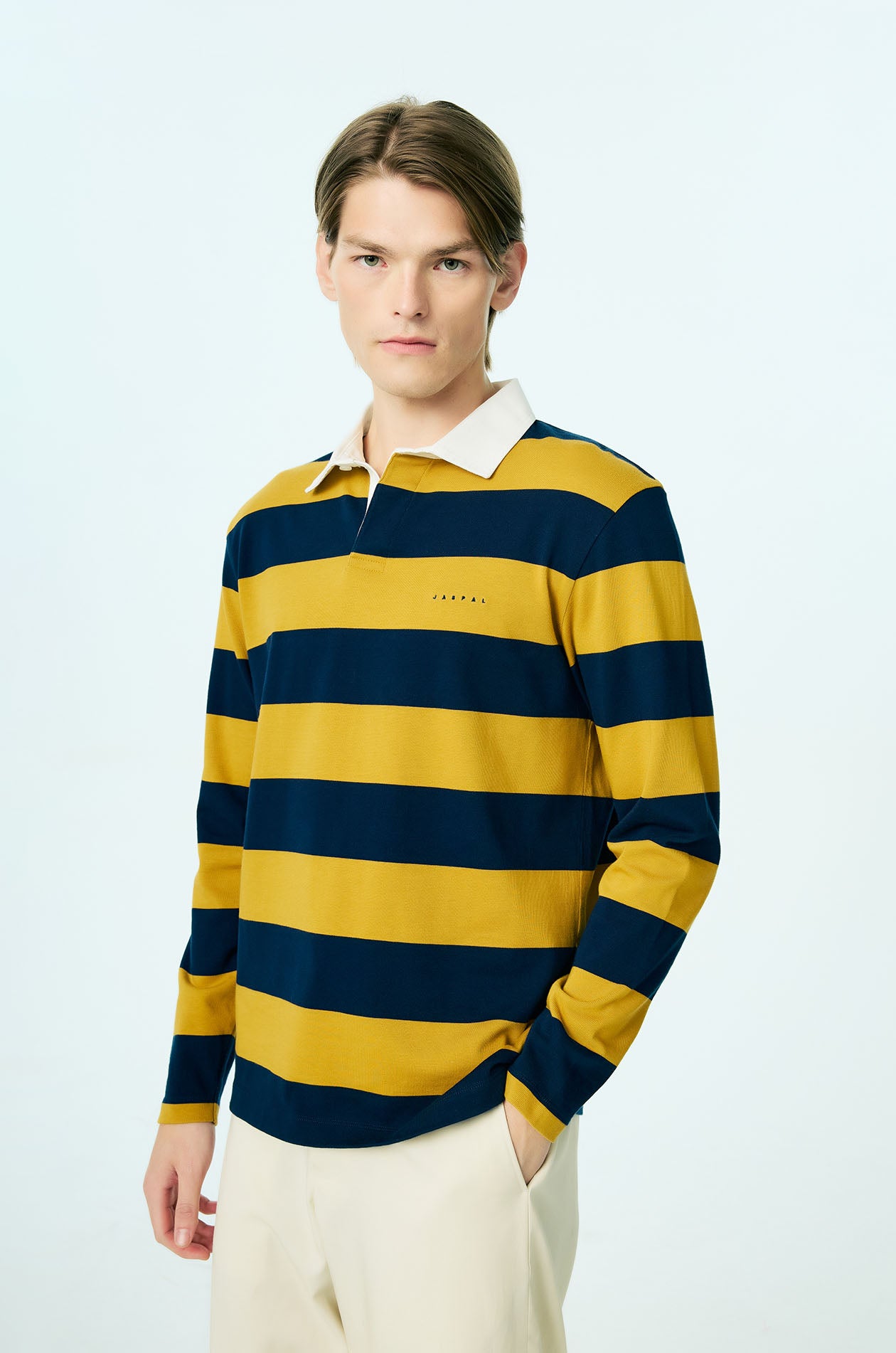 This long-sleeved rugby polo shirt is crafted from soft cotton jersey, offering a comfortable hand feel with a relaxed, easy drape. Designed in a relaxed fit, it features bold awning stripe detailing that brings graphic impact to the silhouette, balanced by a classic collar for timeless structure. Minimal Jaspal lettering at the chest provides a discreet contemporary signature, completing this elevated casual piece.Available in dark green and Mustard yellow.
