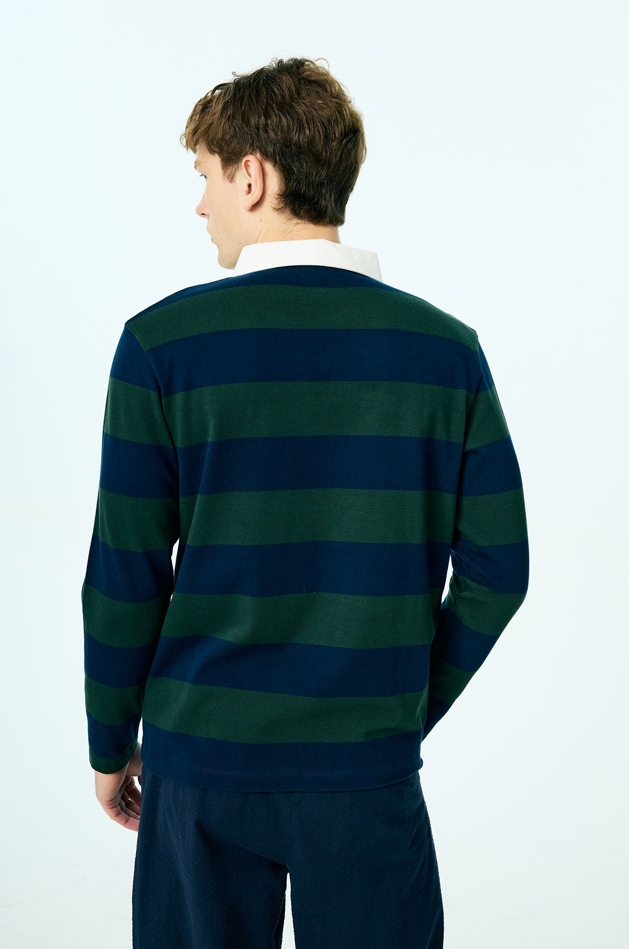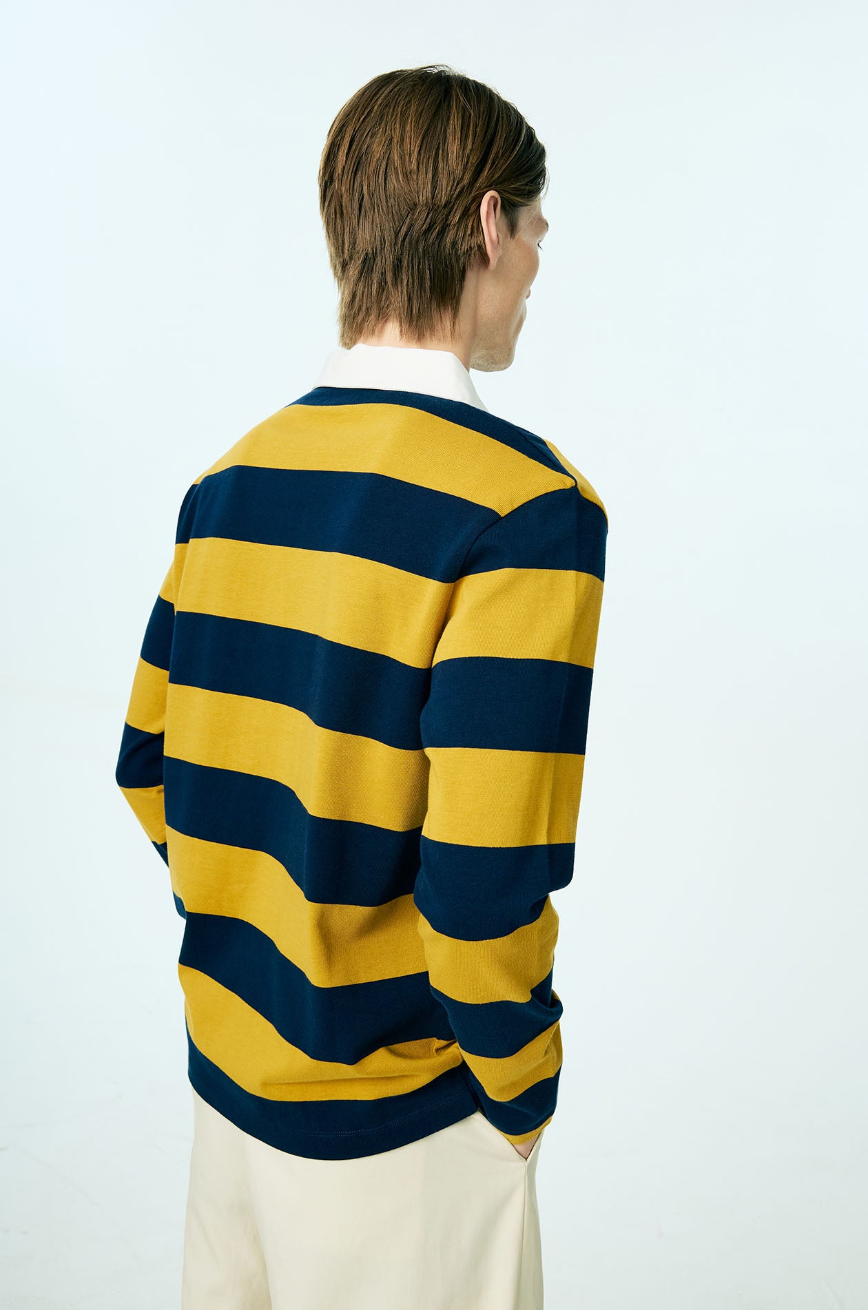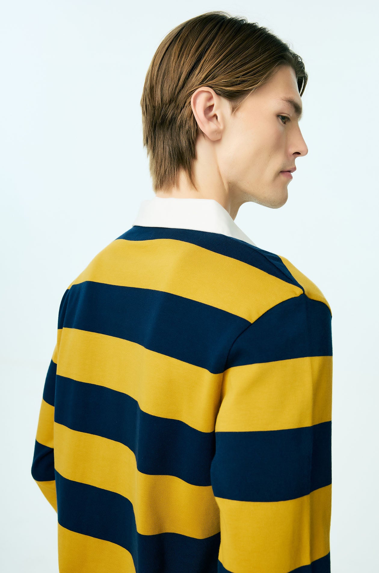 This long-sleeved rugby polo shirt is crafted from soft cotton jersey, offering a comfortable hand feel with a relaxed, easy drape. Designed in a relaxed fit, it features bold awning stripe detailing that brings graphic impact to the silhouette, balanced by a classic collar for timeless structure. Minimal Jaspal lettering at the chest provides a discreet contemporary signature, completing this elevated casual piece.Available in dark green and Mustard yellow.