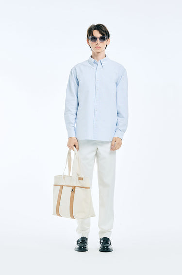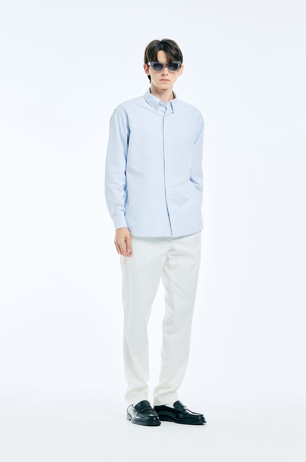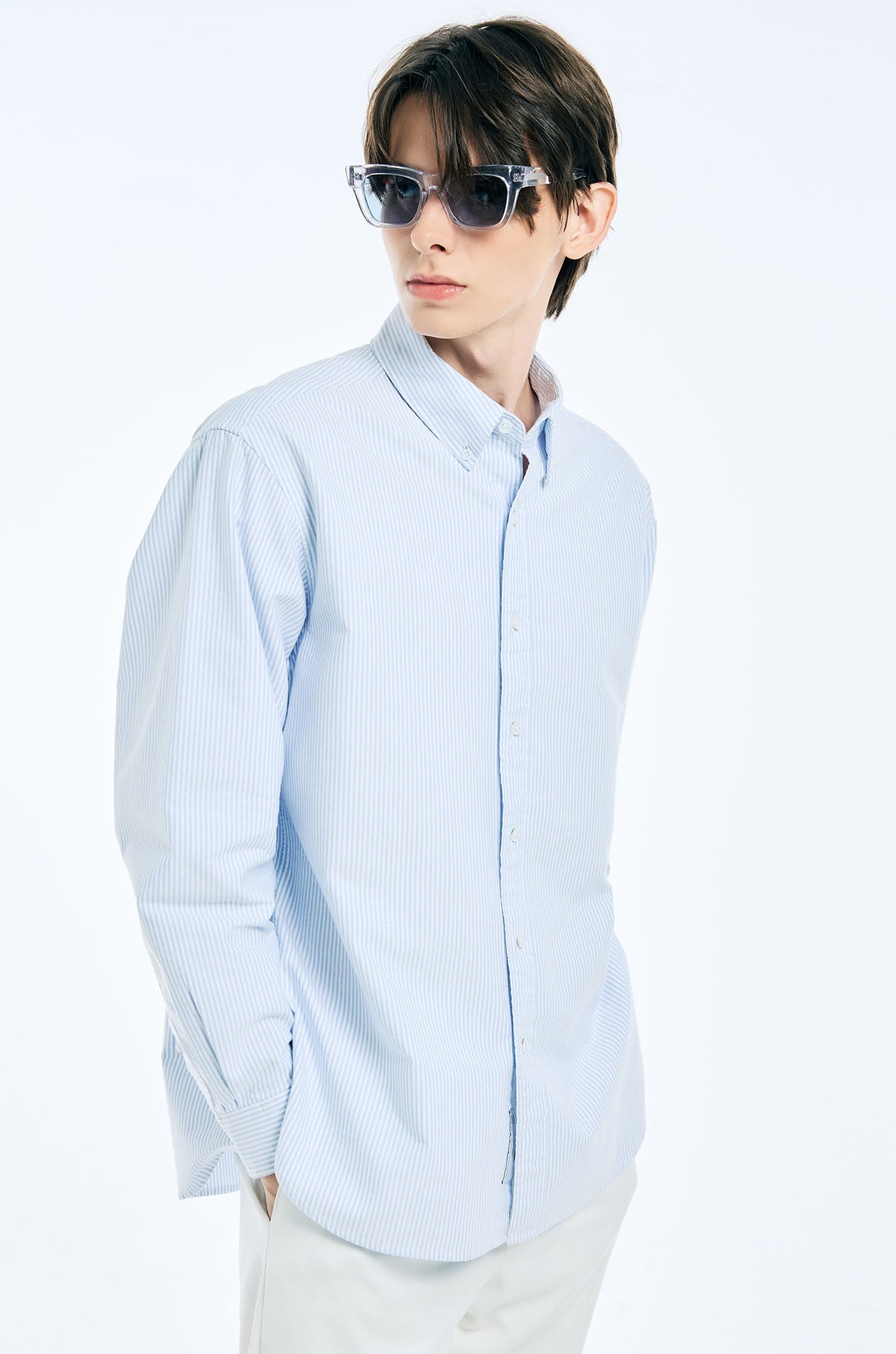Long-sleeved shirt in oxford with stripes. Relaxed fit with button-down collar and Jaspal logo embroidery at the chest. Front button closure. Available in blue.