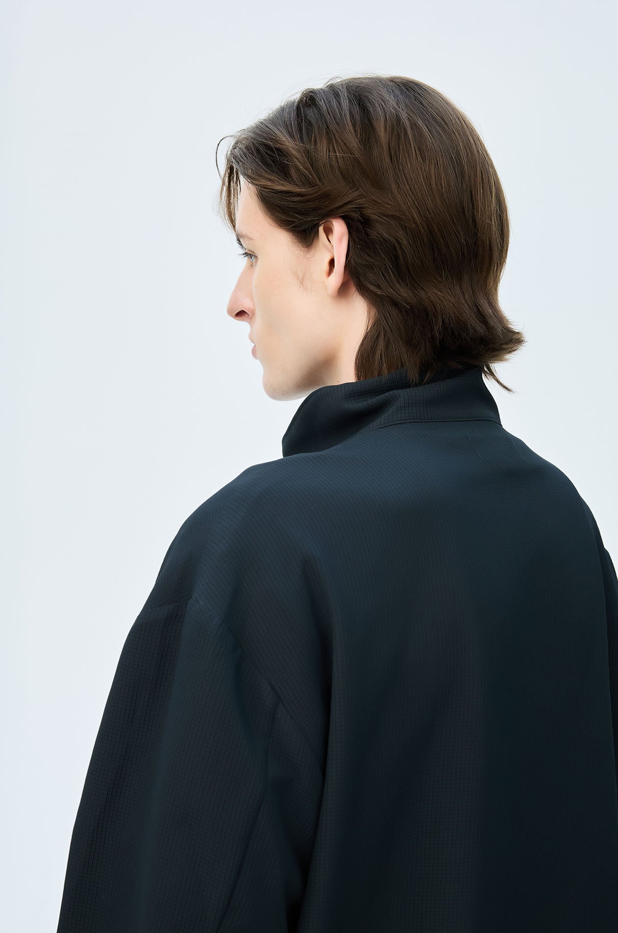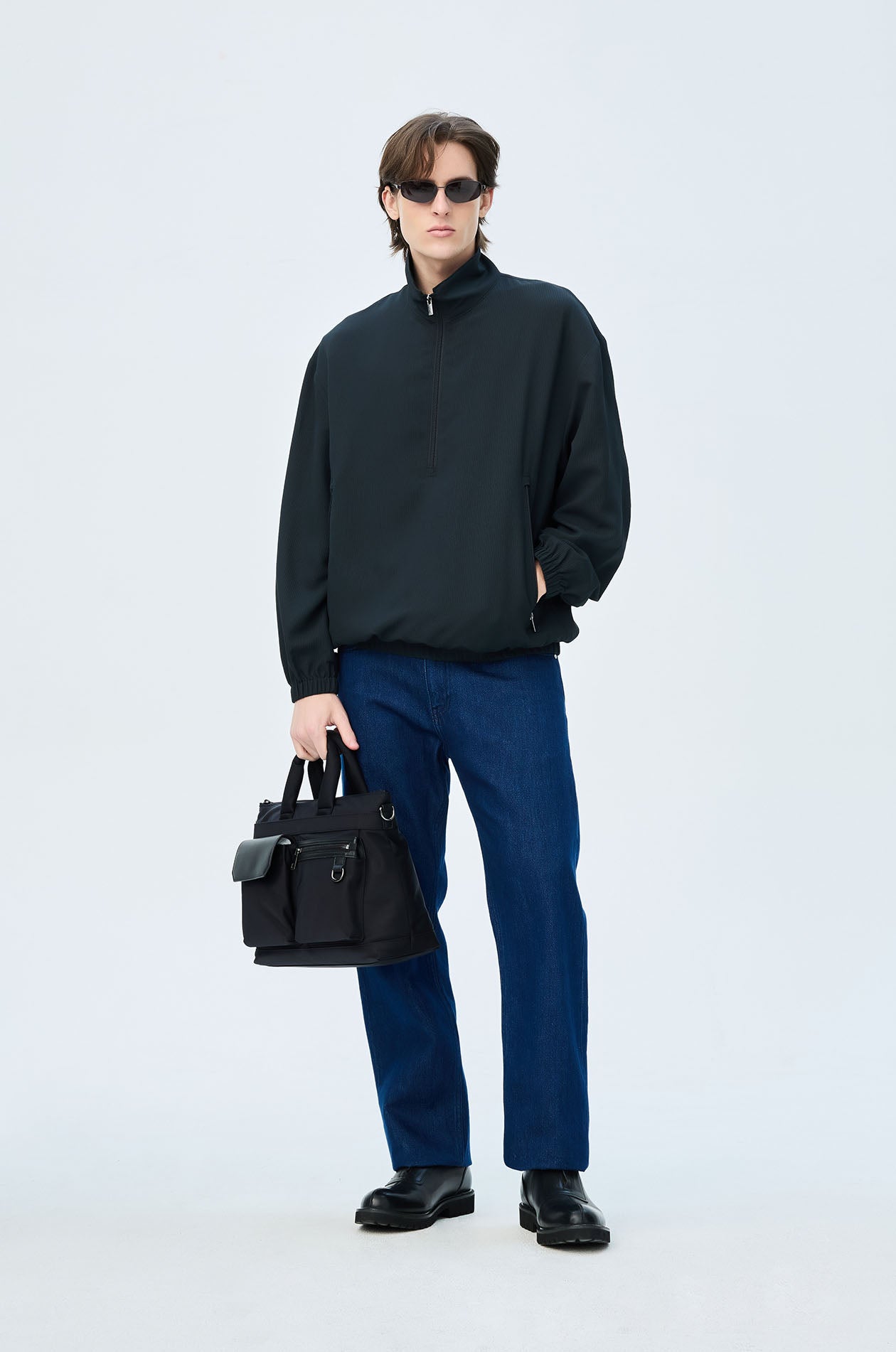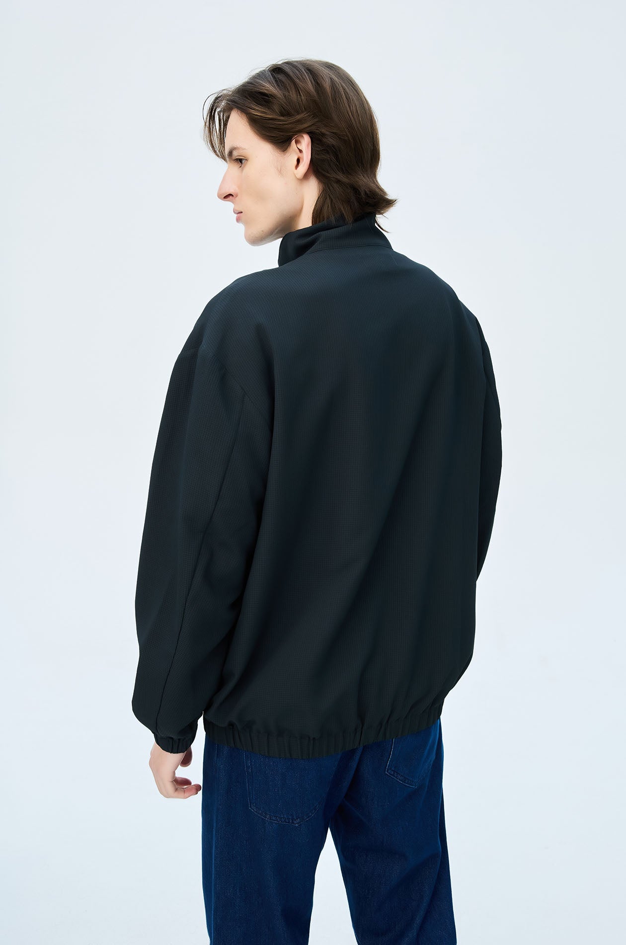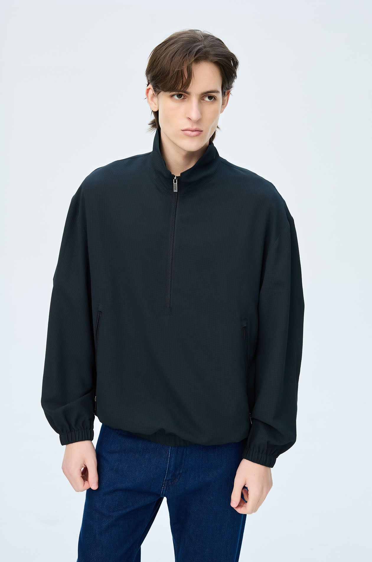 Pullover jacket in textured lightweight fabric. Oversized fit with funnel neck, side pockets, elastic cuffs and hem. Half zip closure. Available in dark navy.