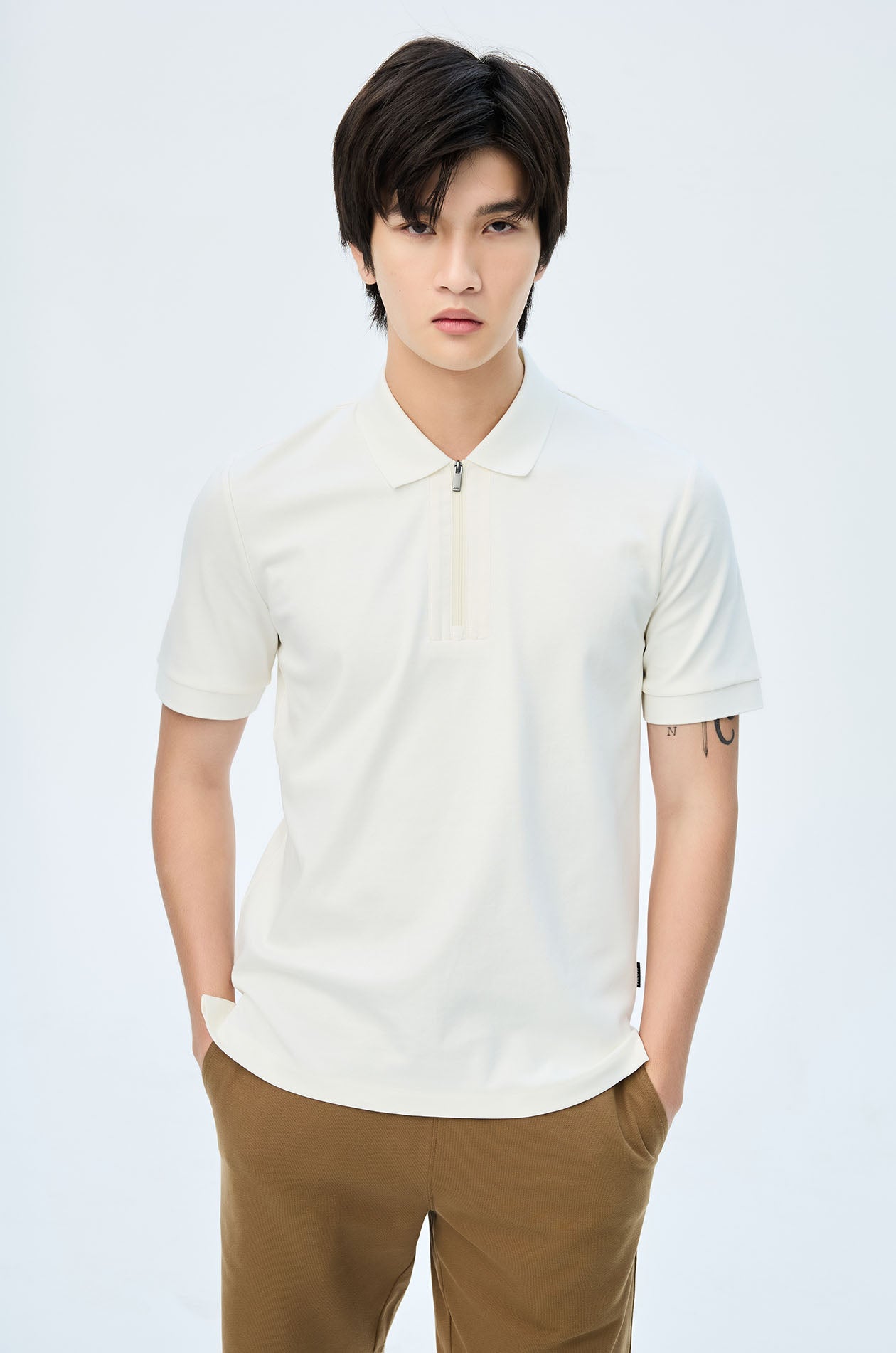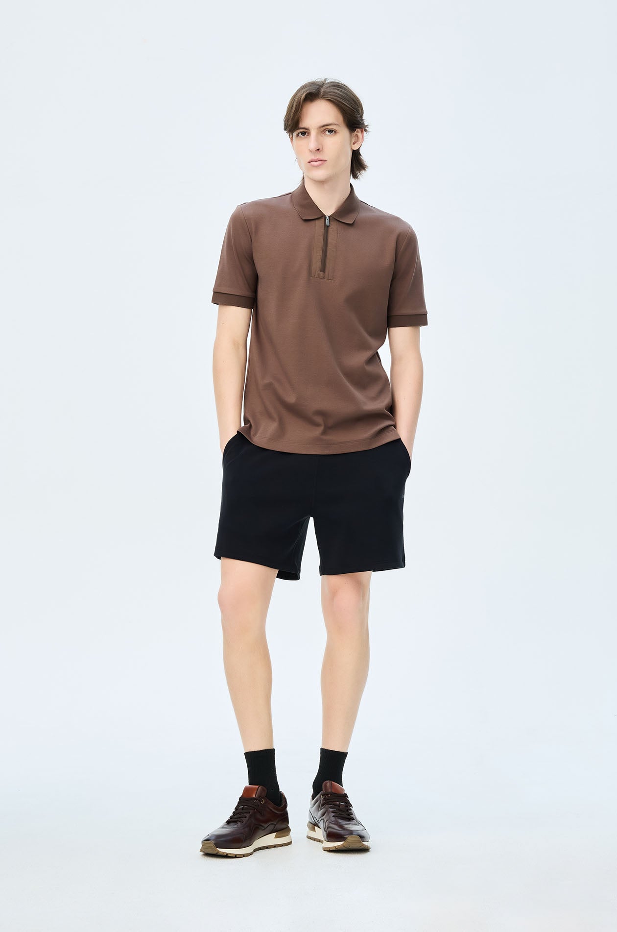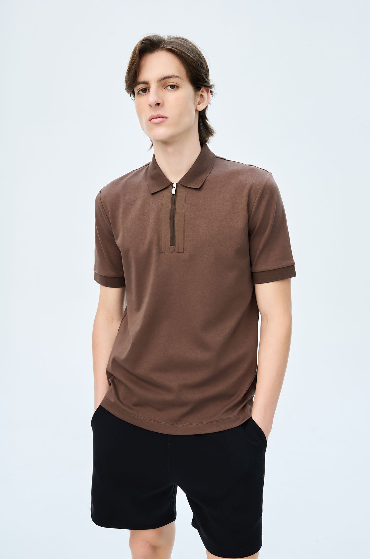 Short-sleeved polo shirt in interlock jersey. Relaxed fit with ribbed collar and cuffs. Front zip closure. Available in off-white and dark brown.