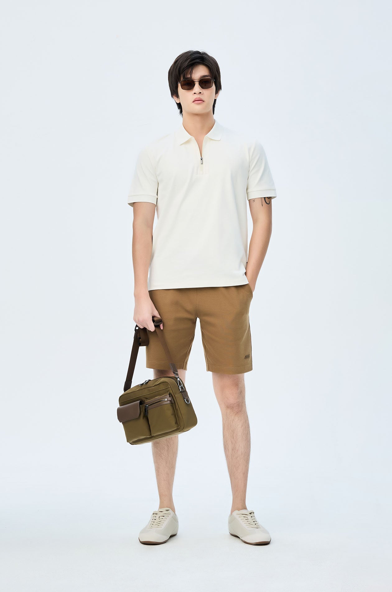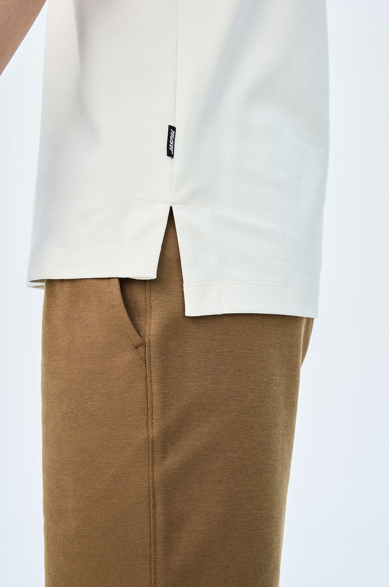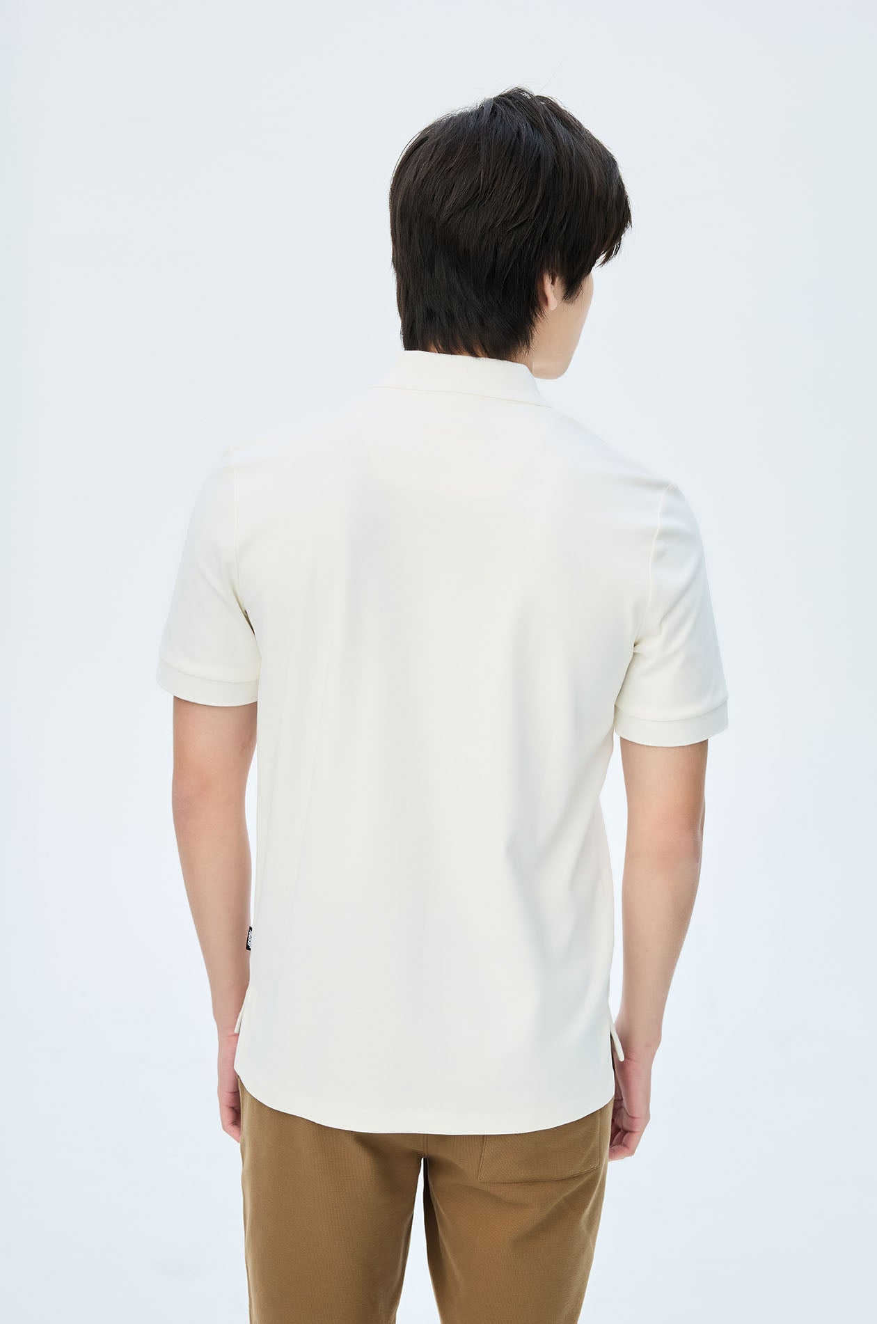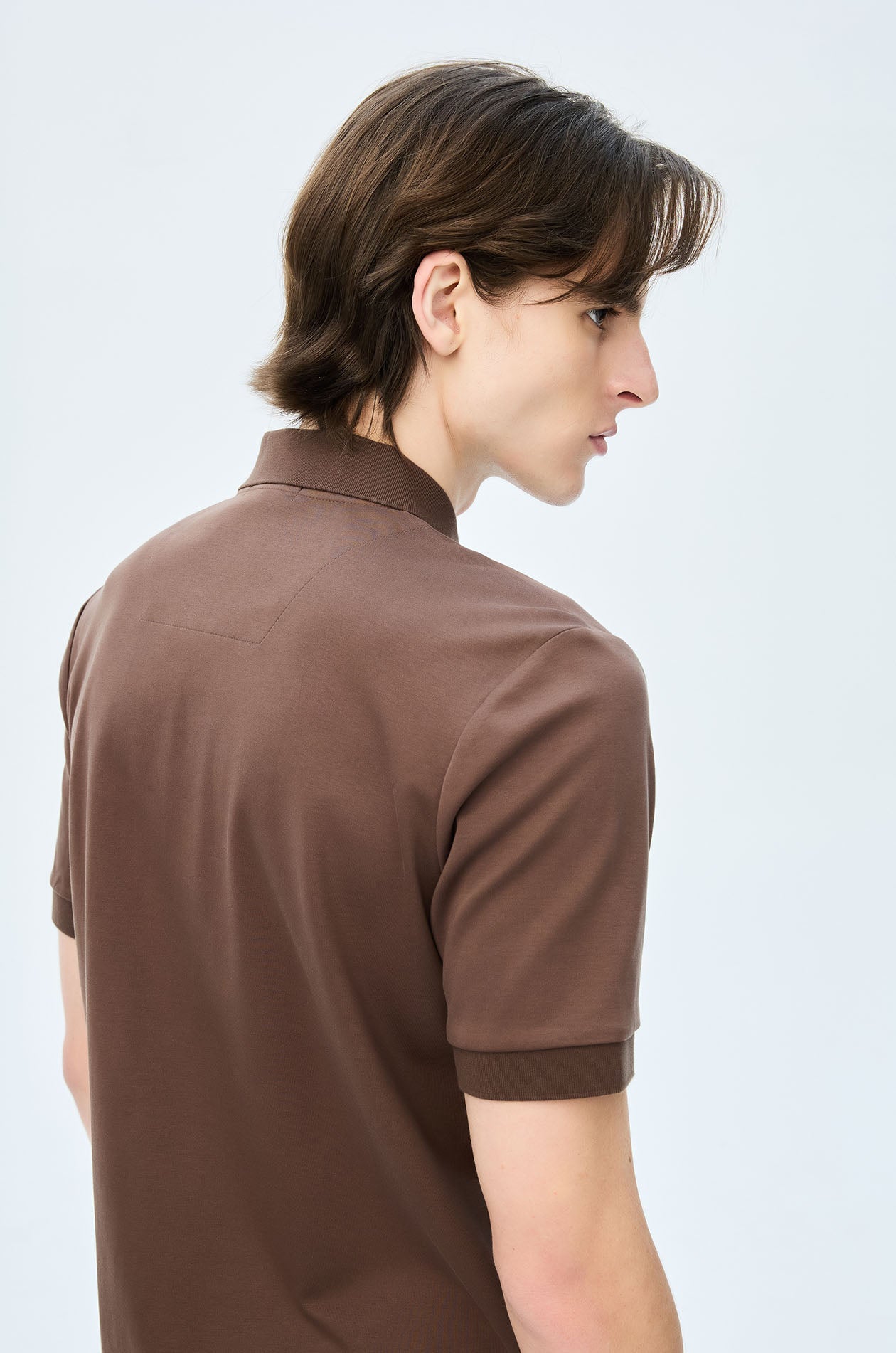 Short-sleeved polo shirt in interlock jersey. Relaxed fit with ribbed collar and cuffs. Front zip closure. Available in off-white and dark brown.