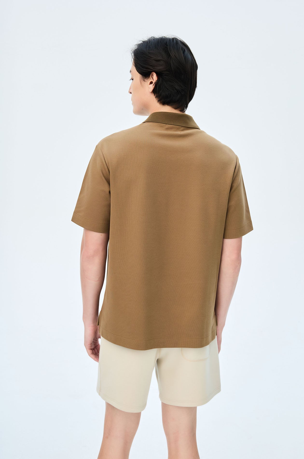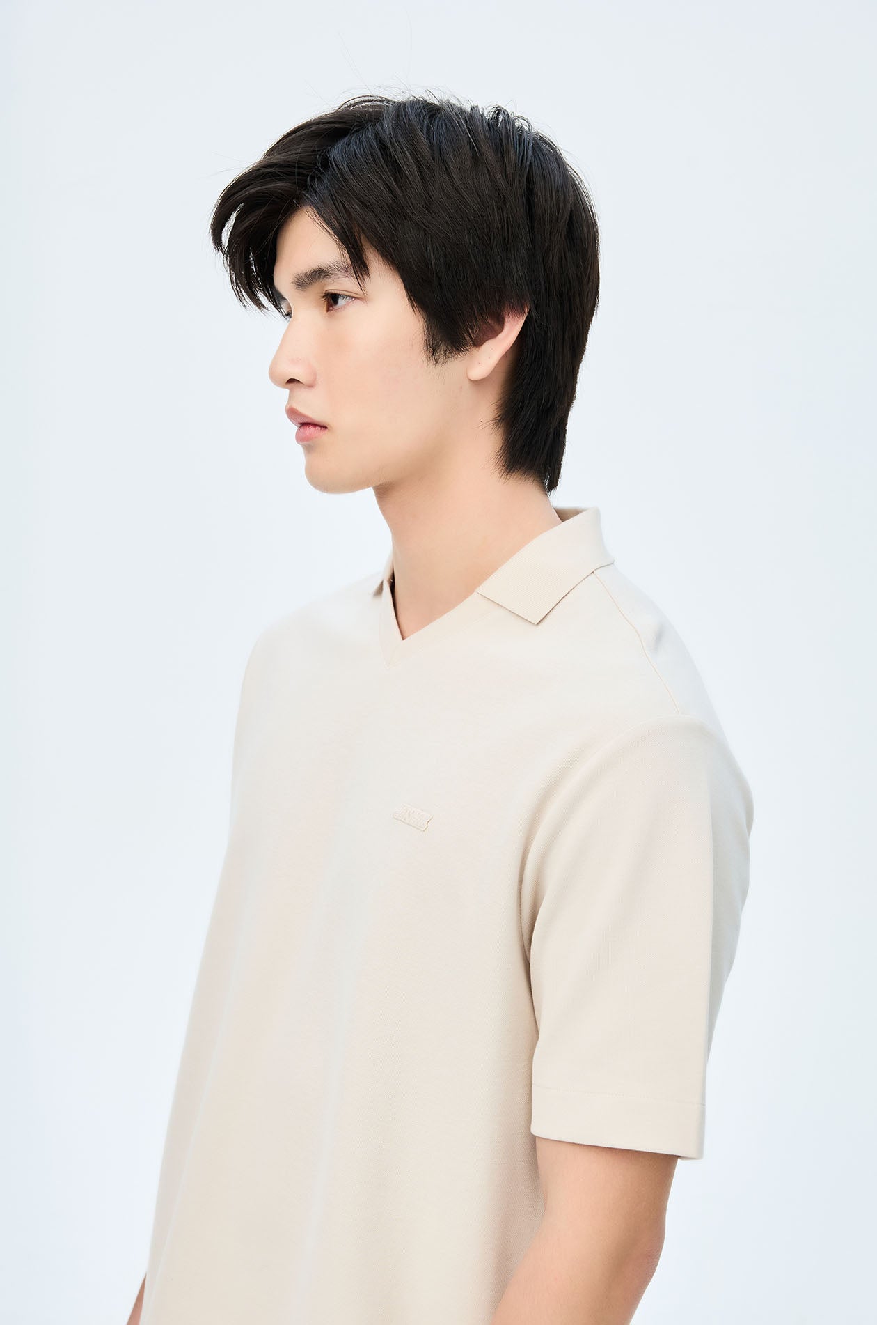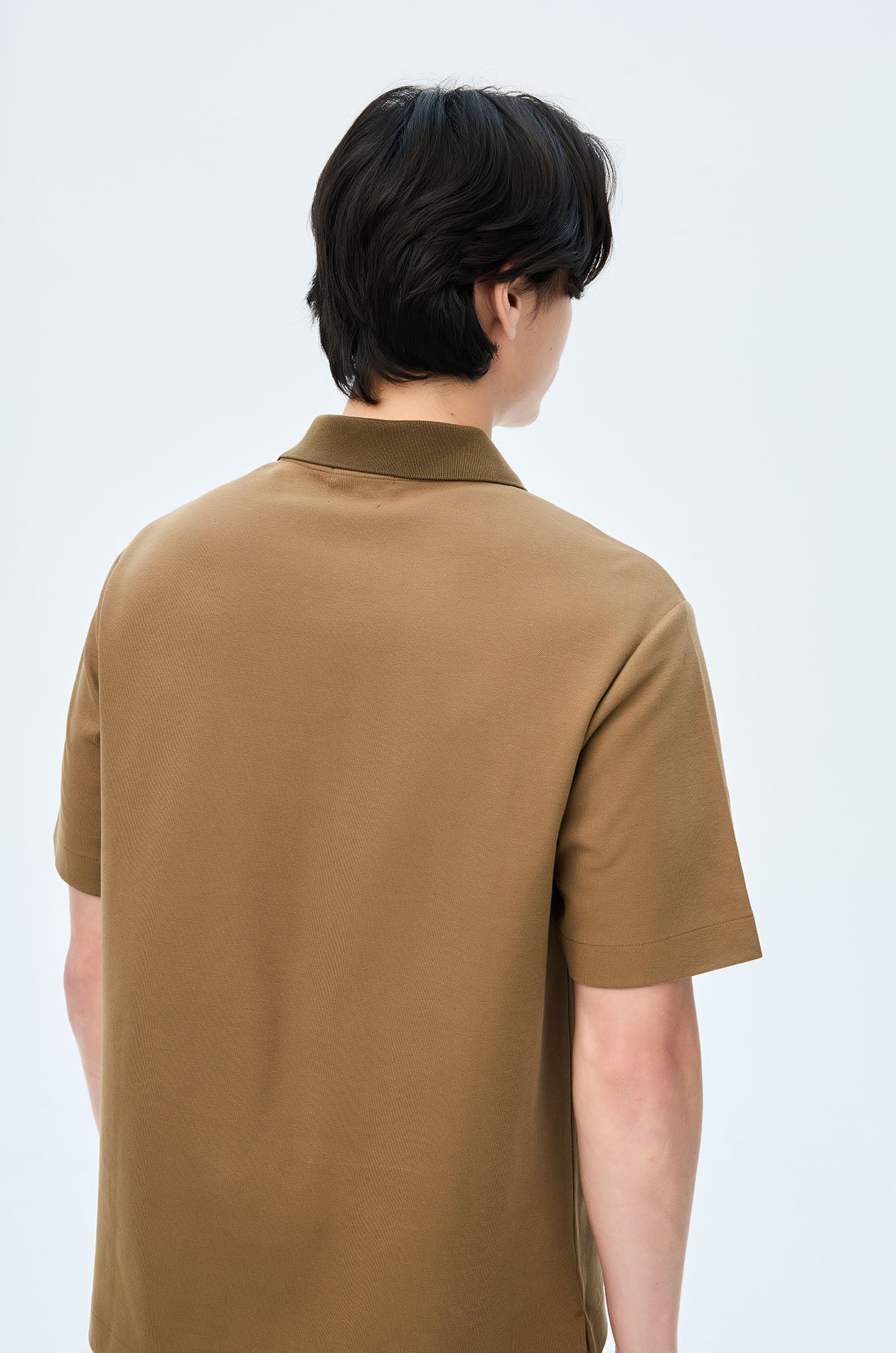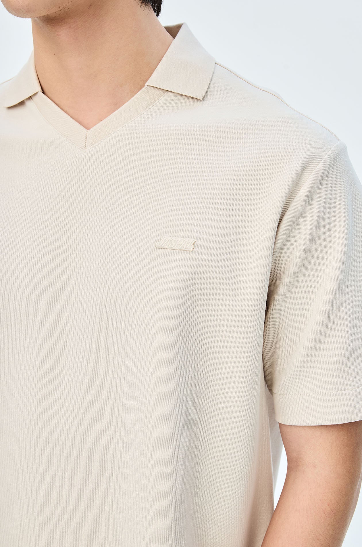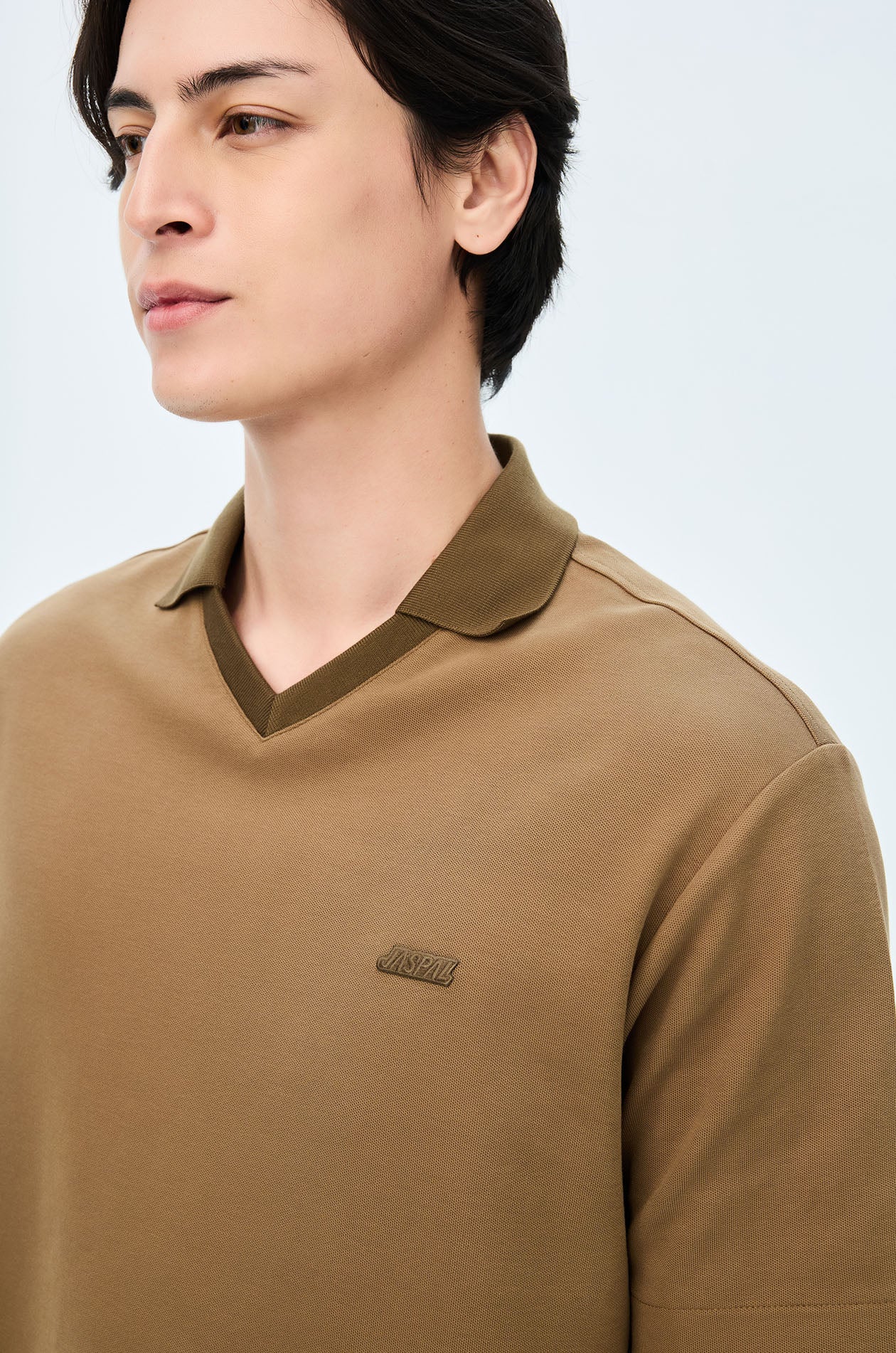 Short-sleeved polo shirt in cotton-blend pique. Relaxed fit with open collar and Jaspal logo at the chest. Available in light beige, navy, and olive brown.