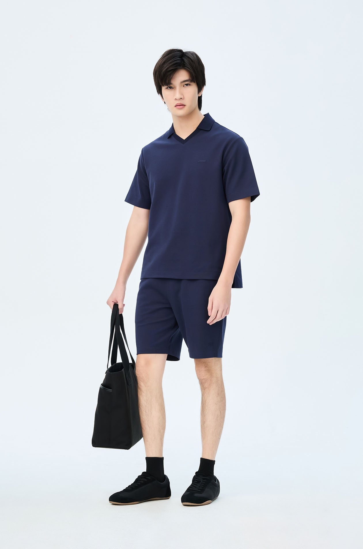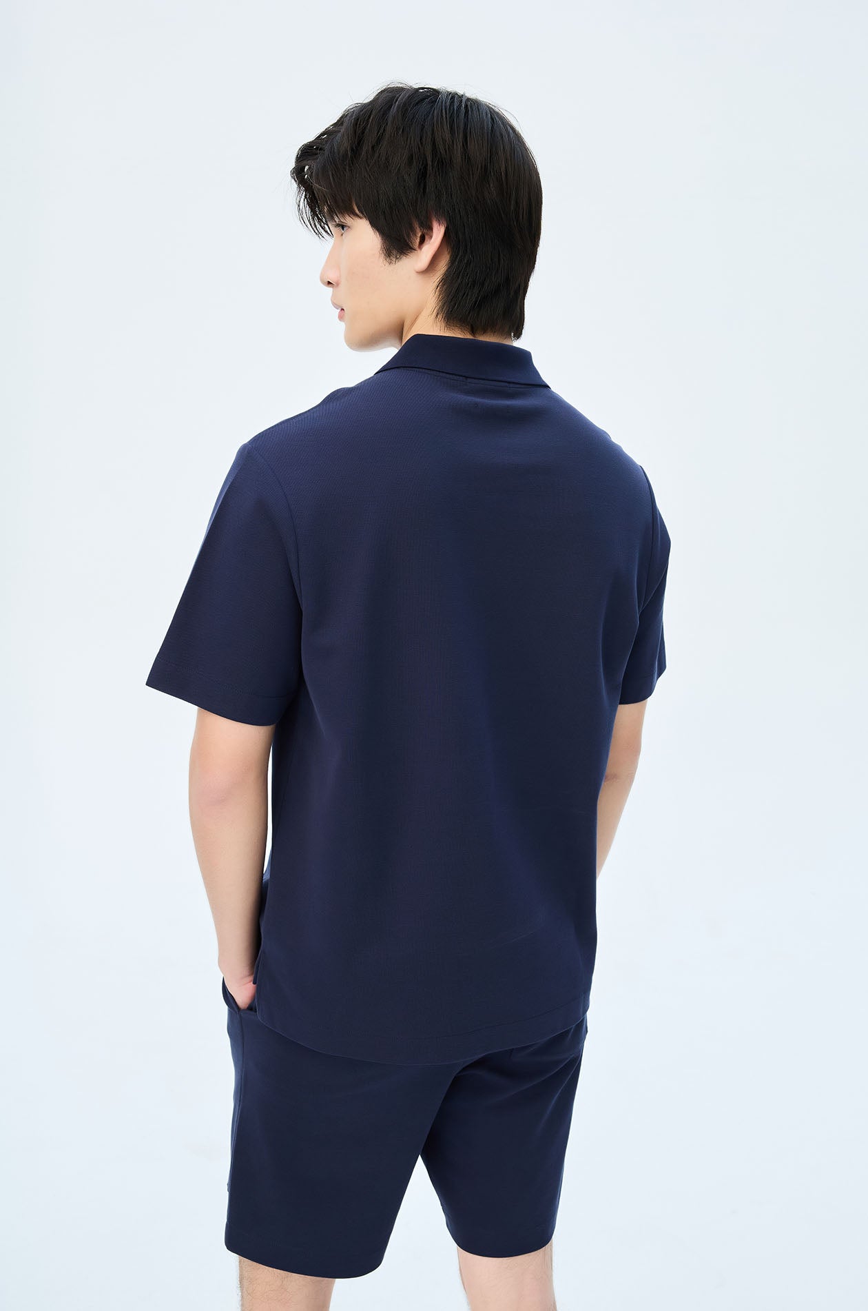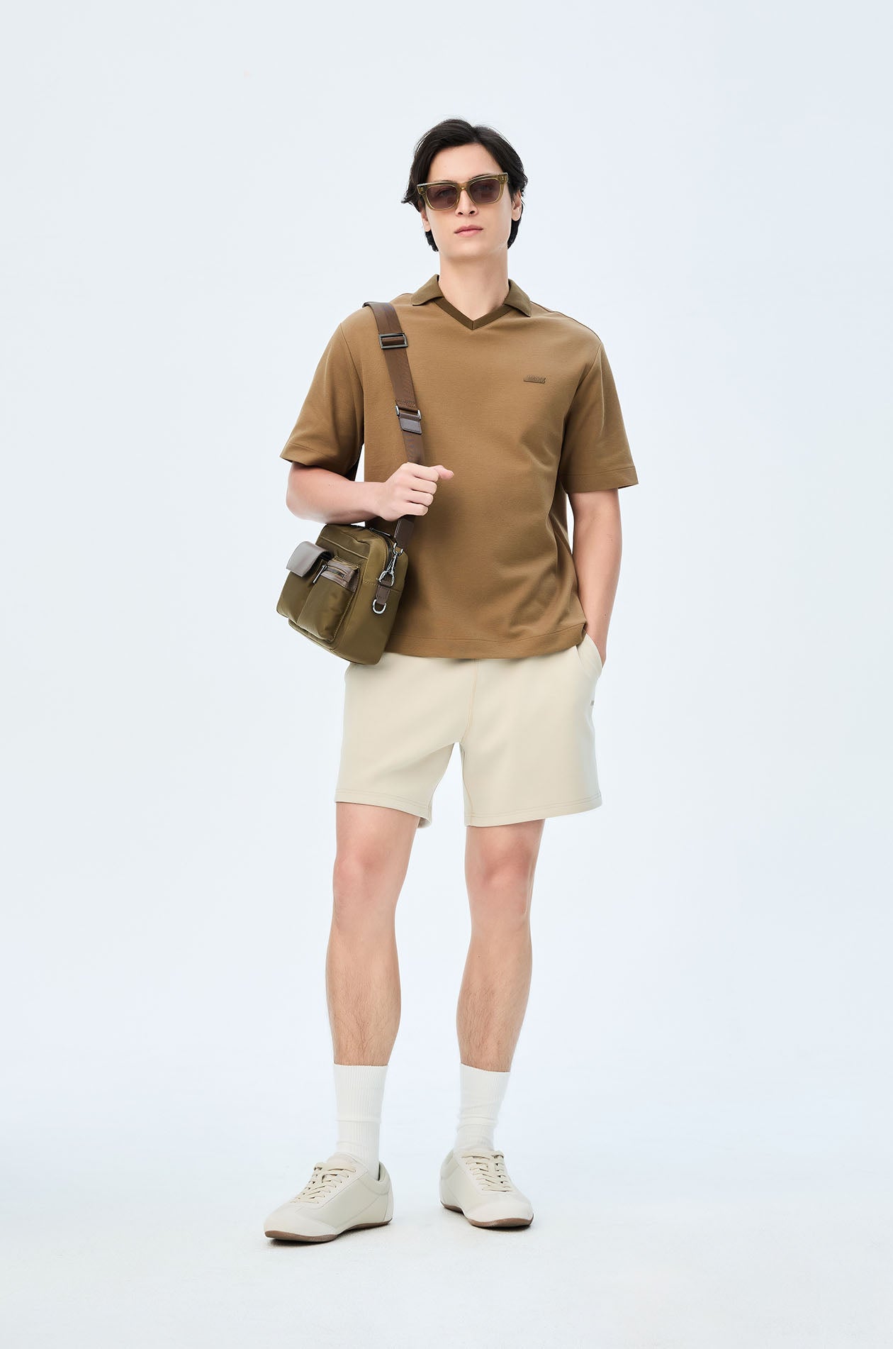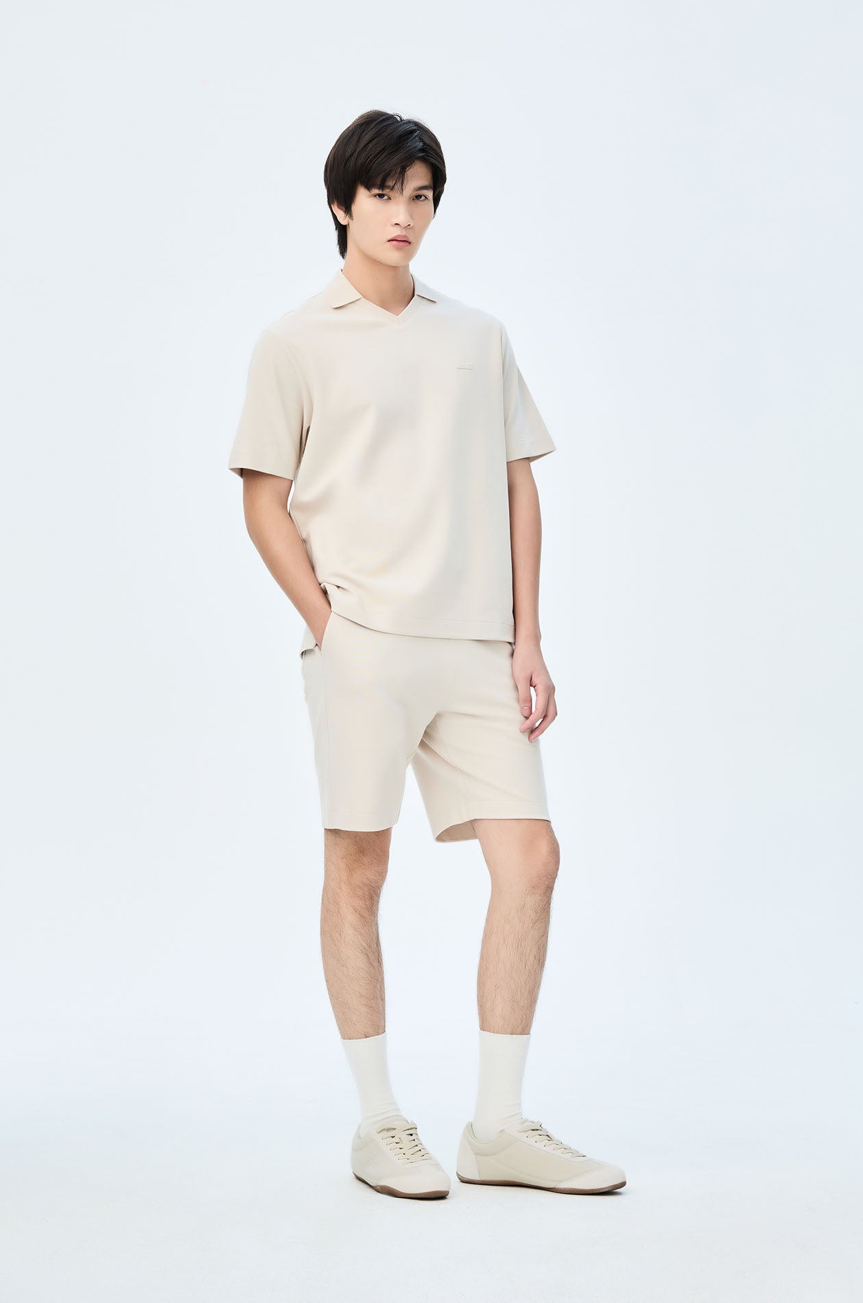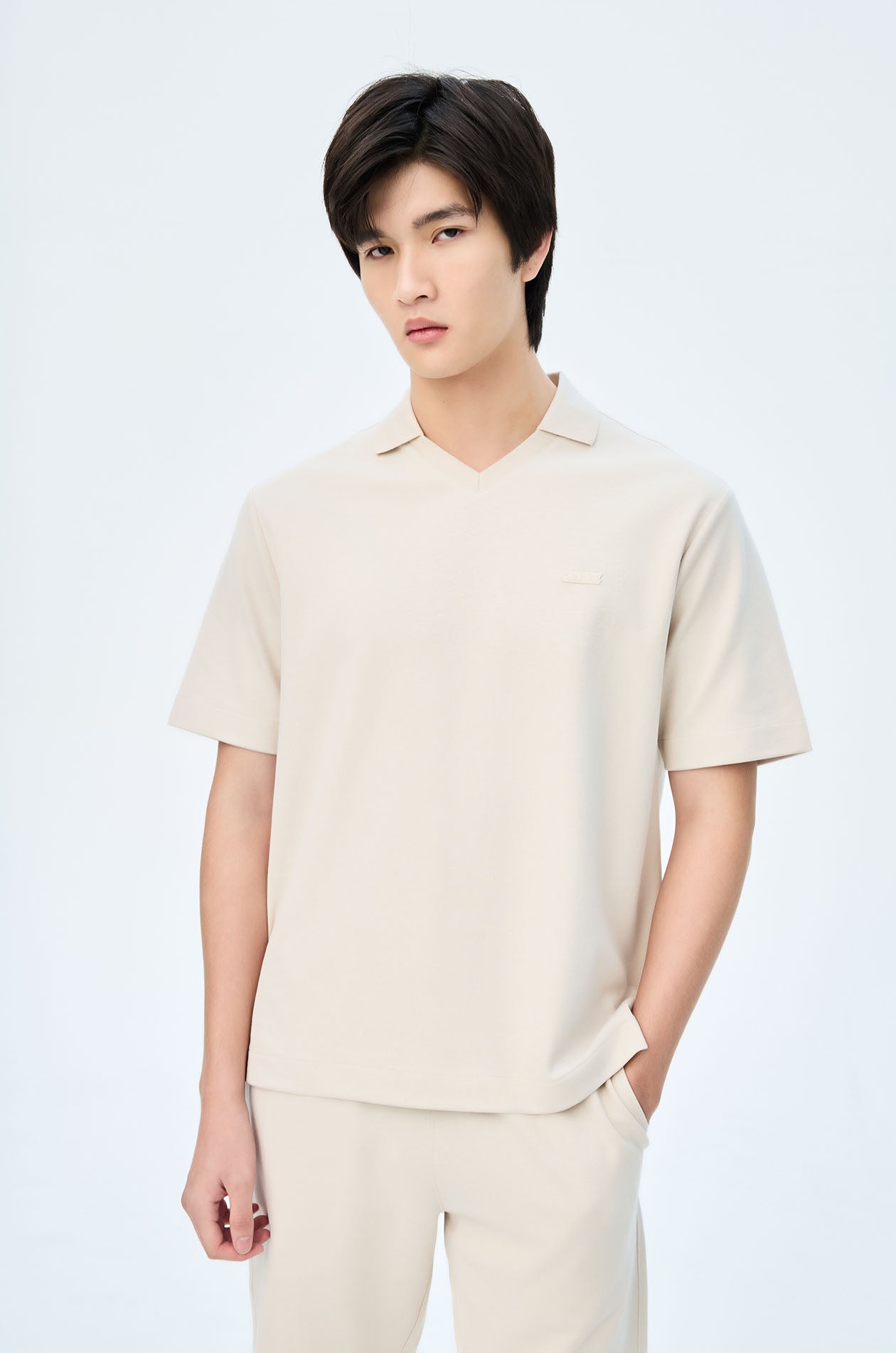 Short-sleeved polo shirt in cotton-blend pique. Relaxed fit with open collar and Jaspal logo at the chest. Available in light beige, navy, and olive brown.