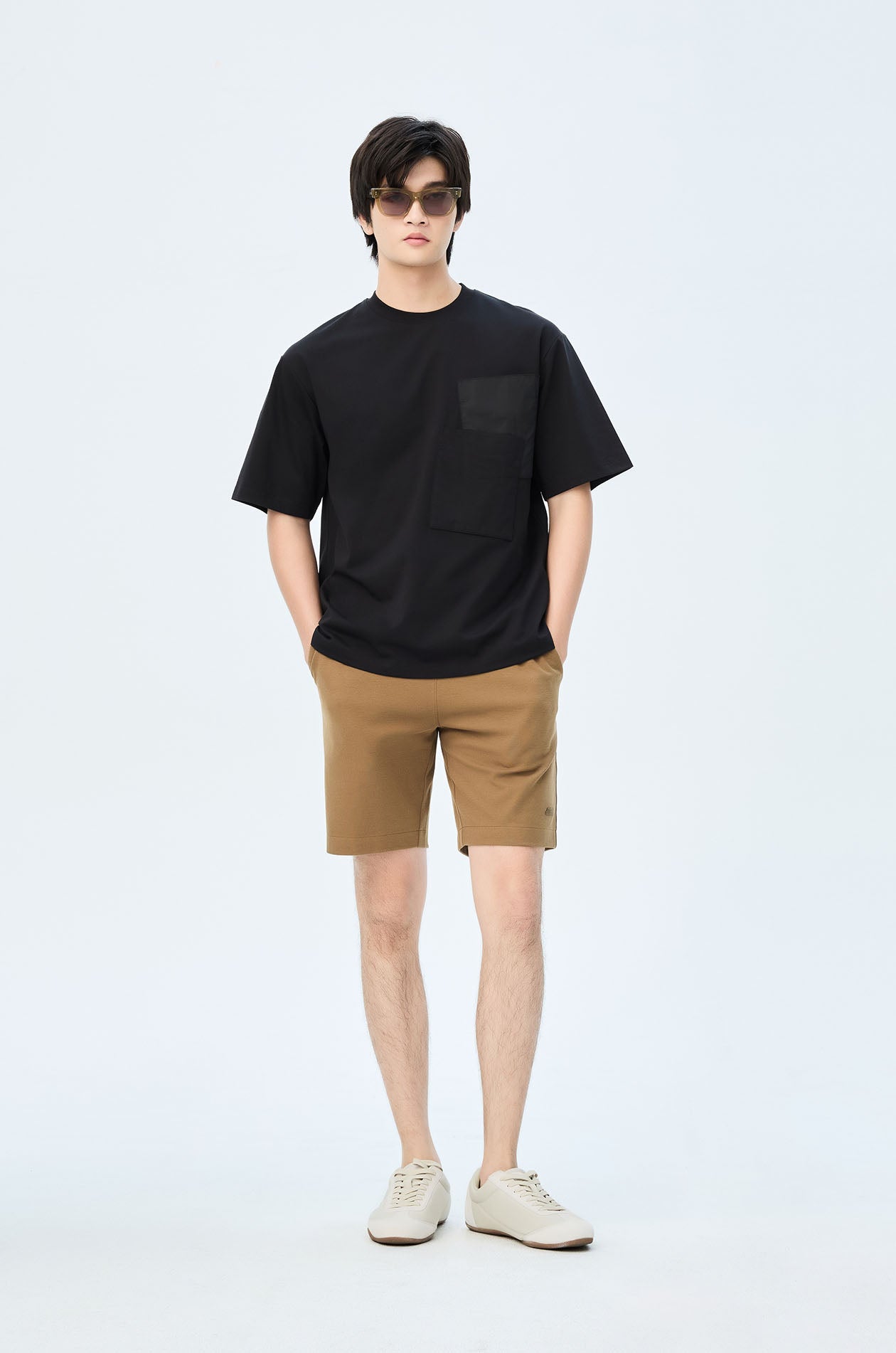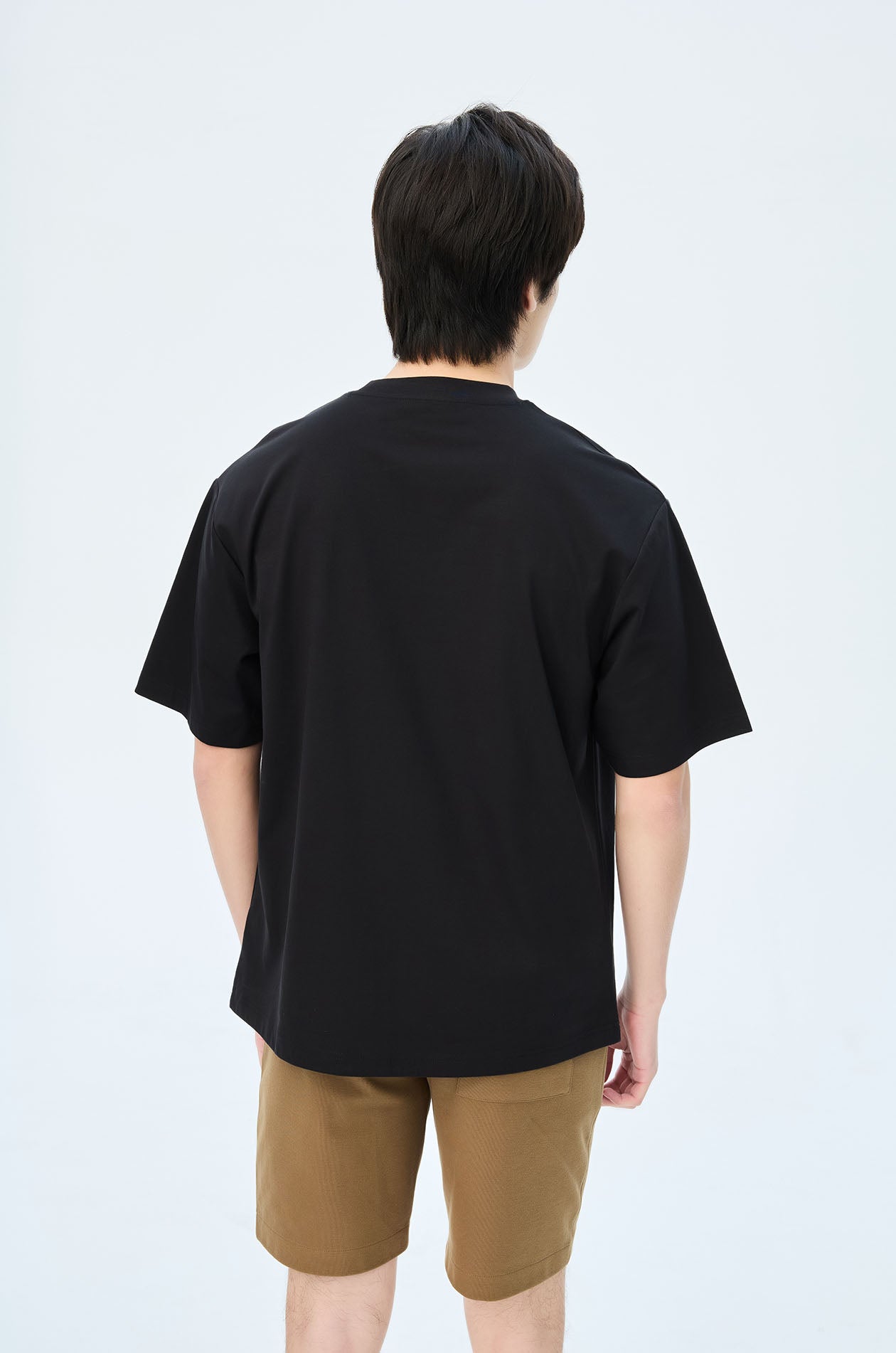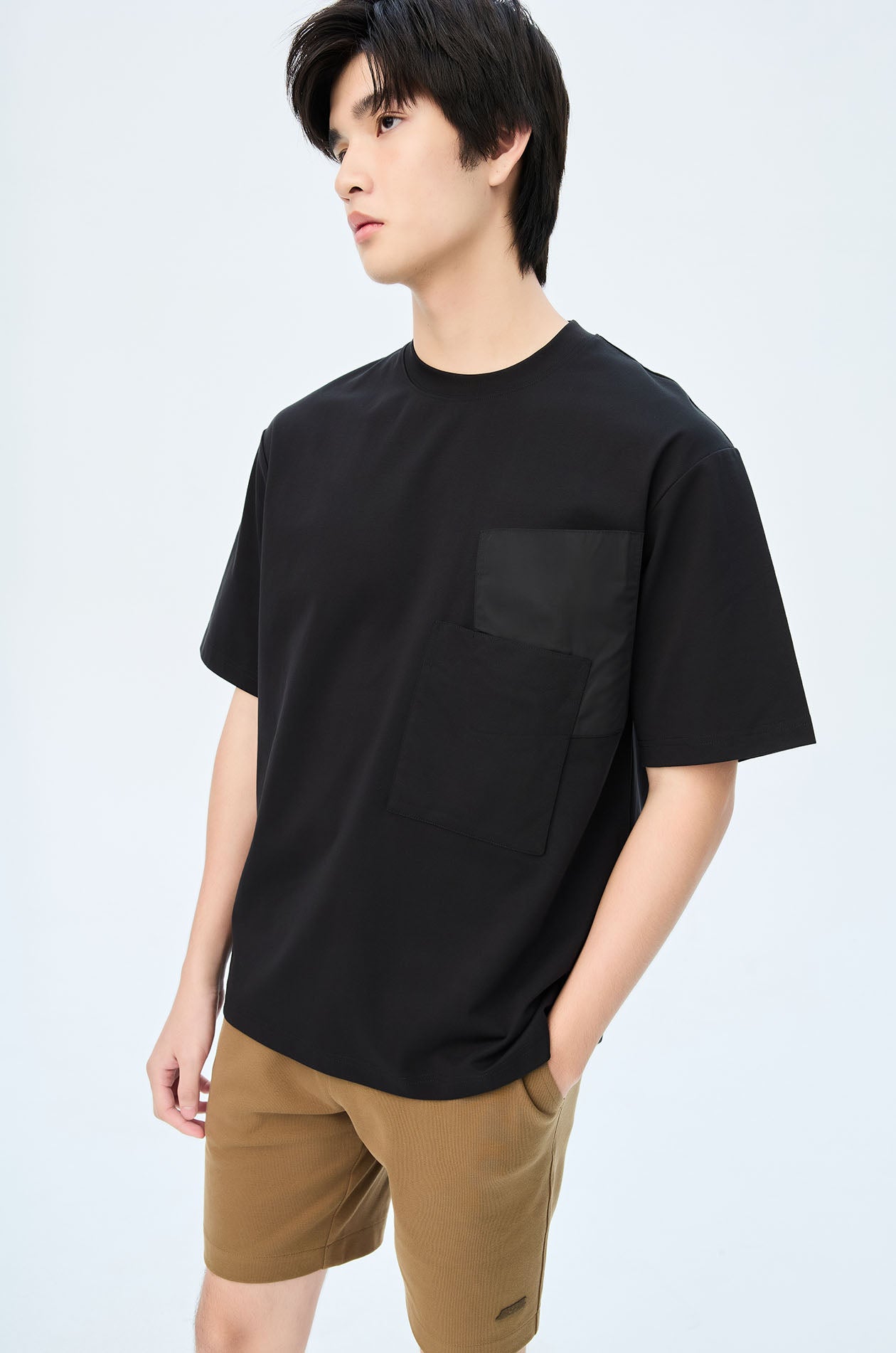 Short-sleeved T-shirt in cotton-blend jersey. Oversized fit with round neckline and double pockets. Available in black and white.