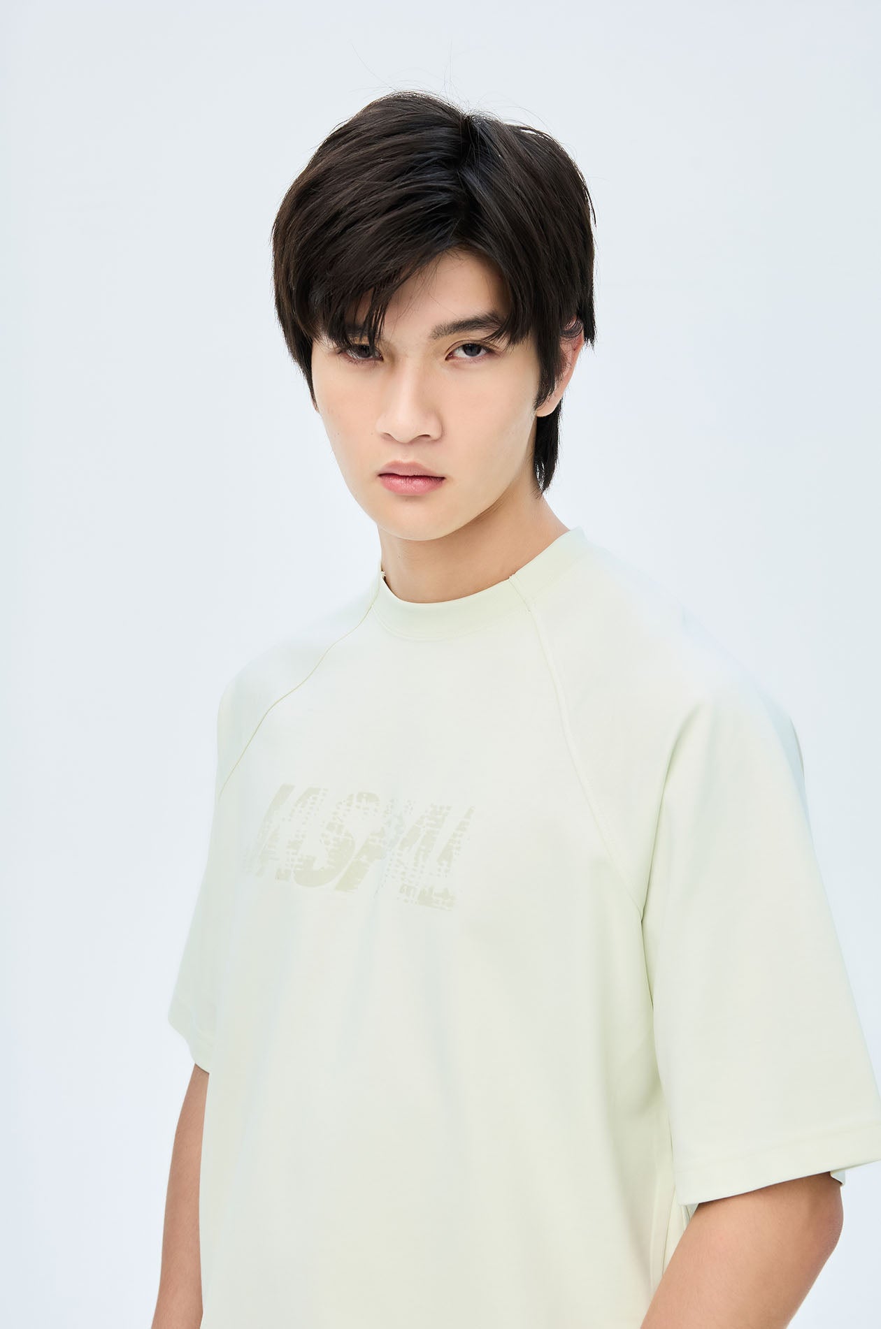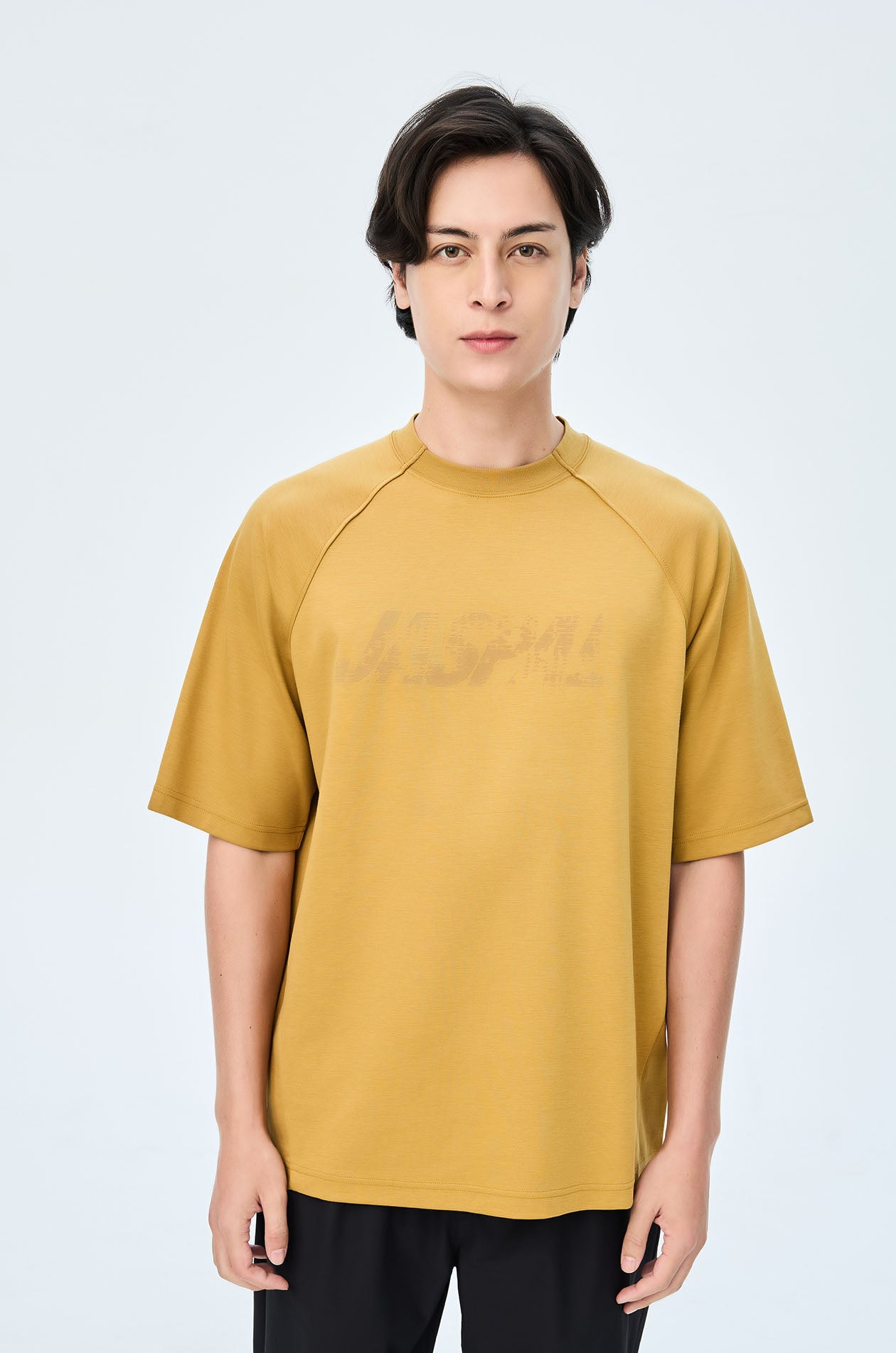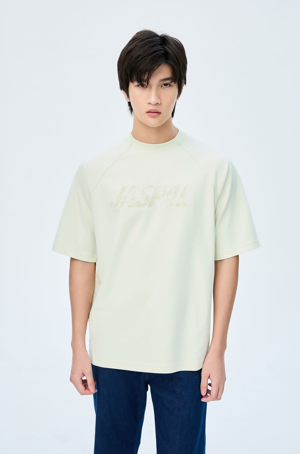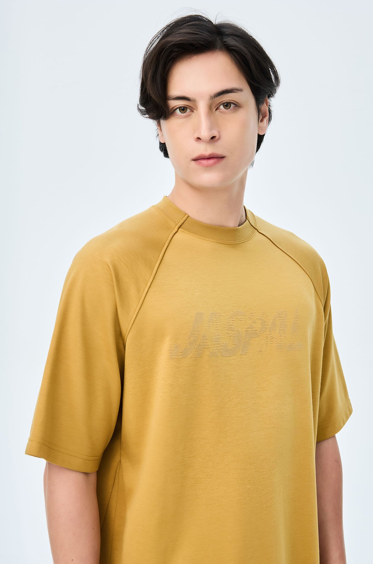 Short-sleeved T-shirt in slub jersey. Oversized fit with round neckline and Jaspal logo in weathered flock for a vintage effect. Available in pale lime, camel brown, and dark grey.
