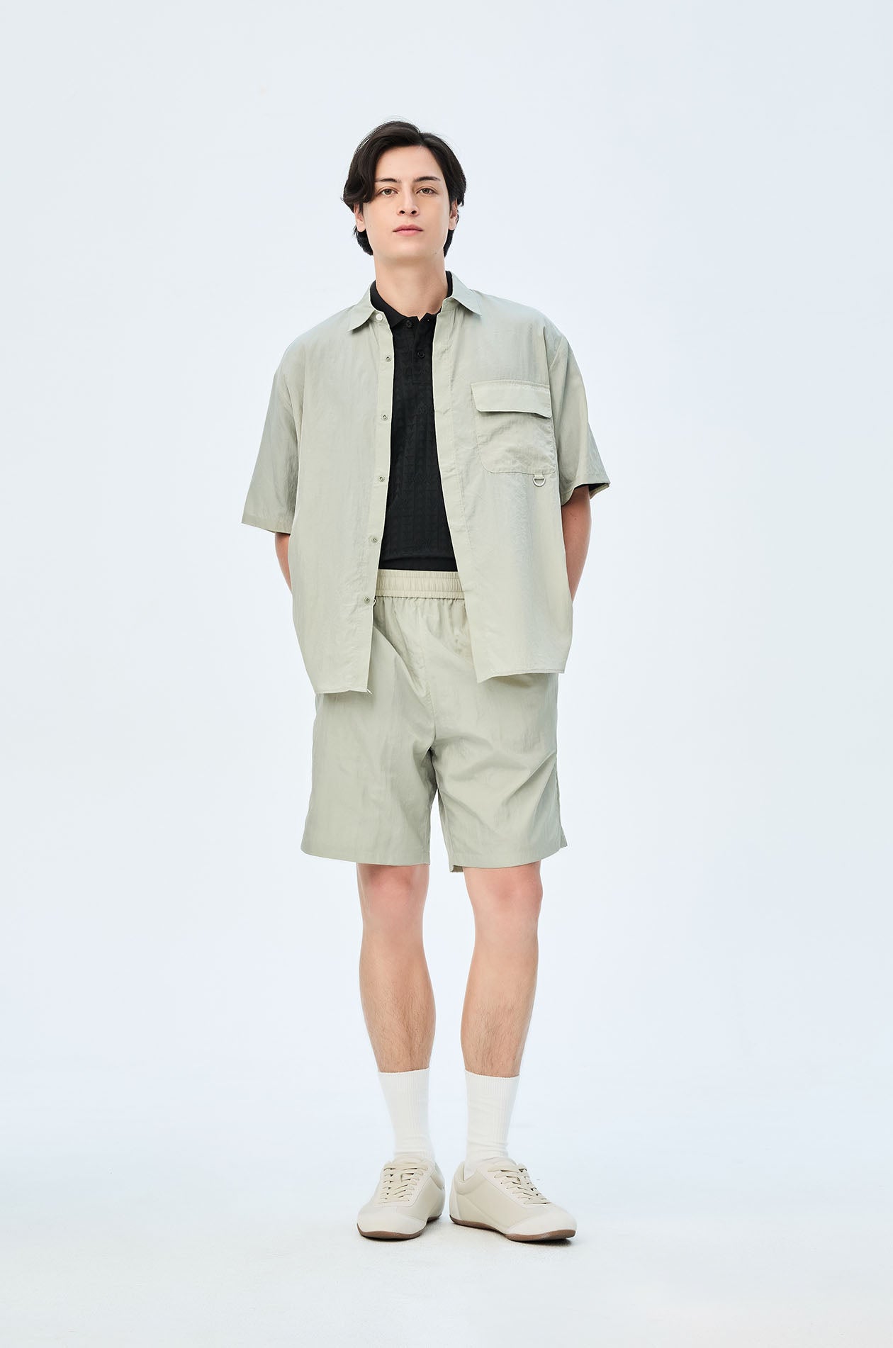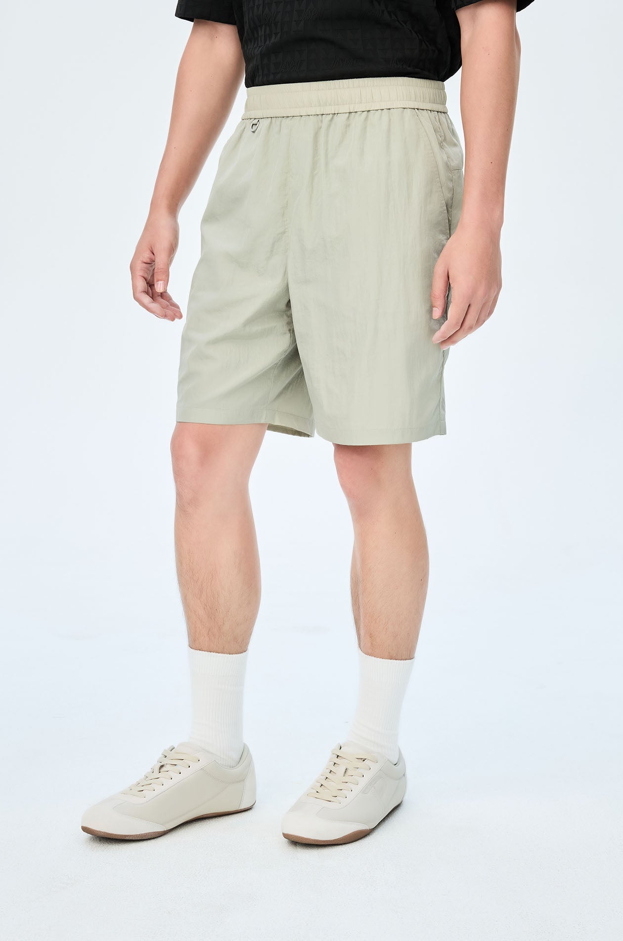 Mid-rise track shorts in parachute fabric. Above-knee length with side and back pockets. Elastic drawstring waistband with D-ring. Available in olive grey.