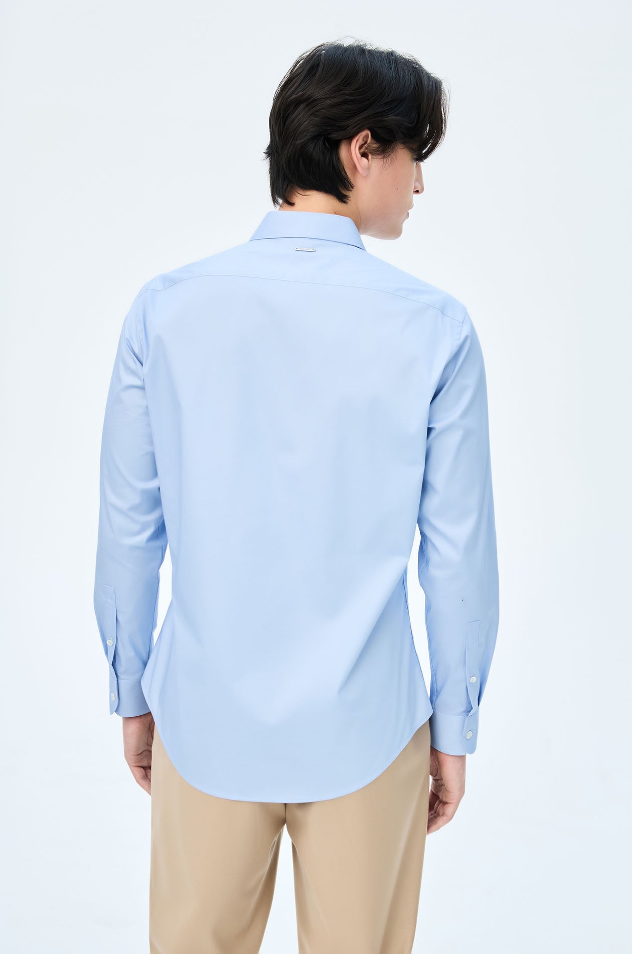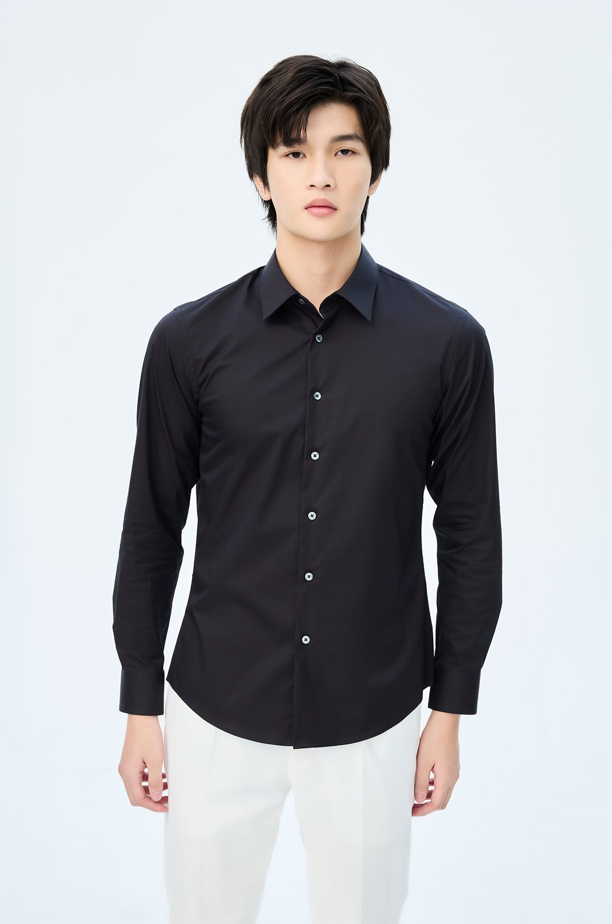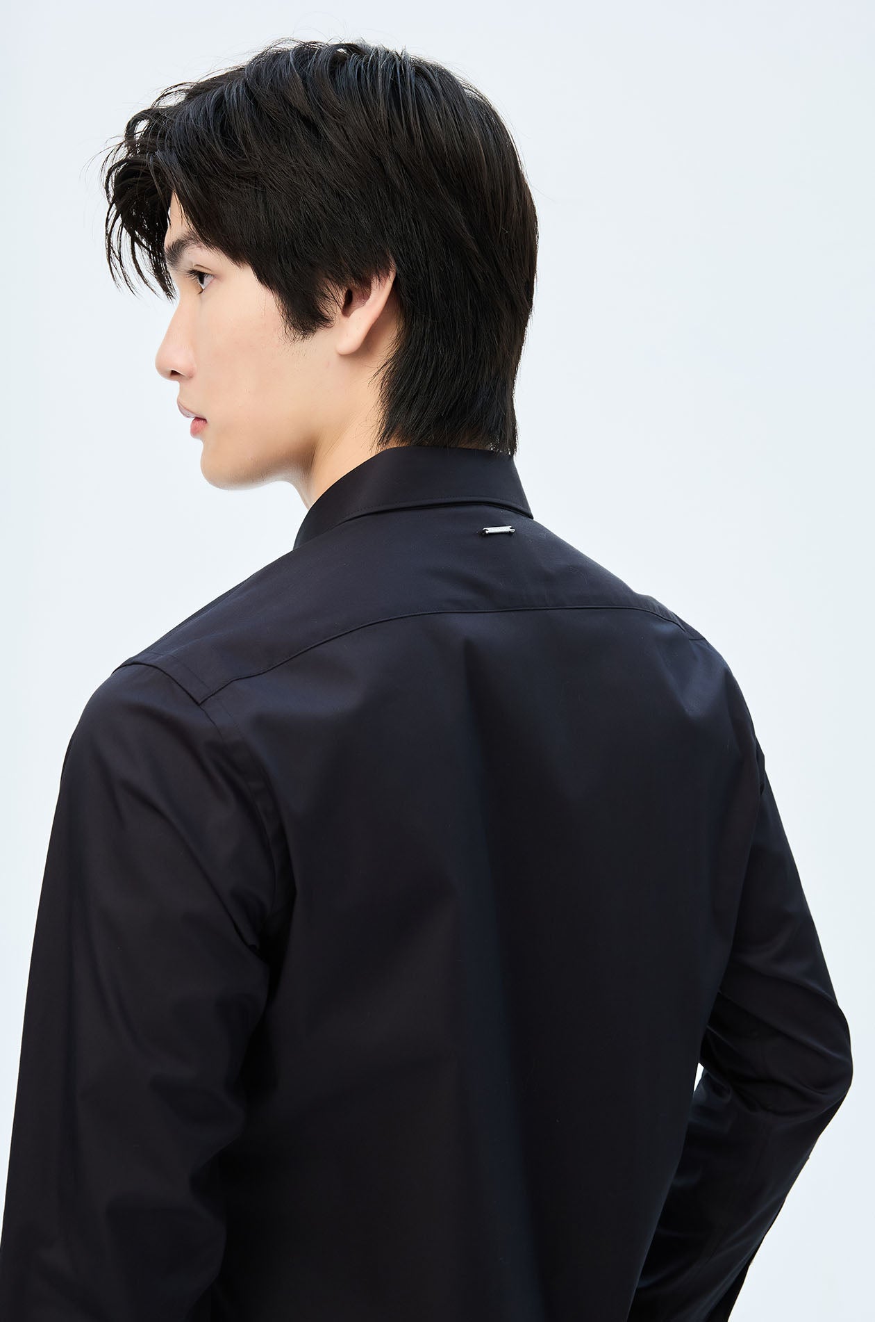 Long-sleeved shirt in poplin. Regular fit with classic collar and buttoned cuffs. Front button closure. Available in black, white, and blue.