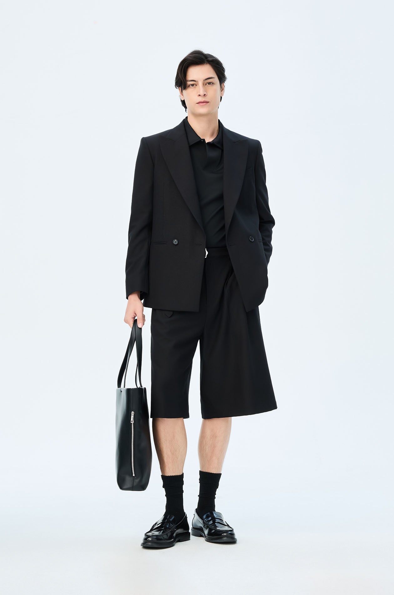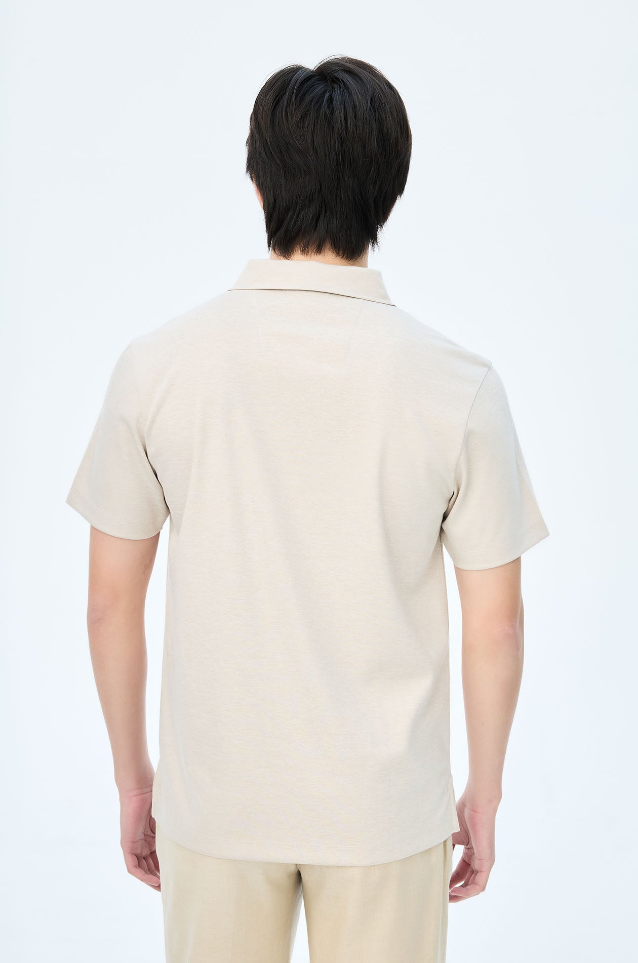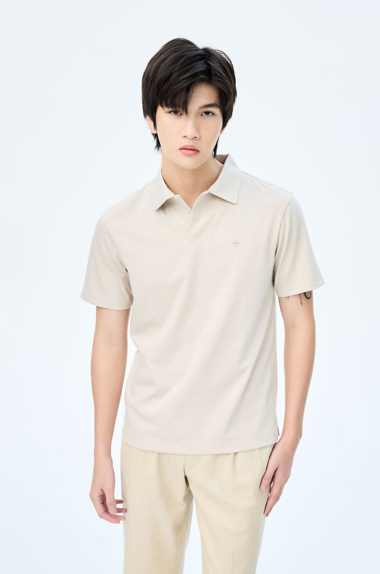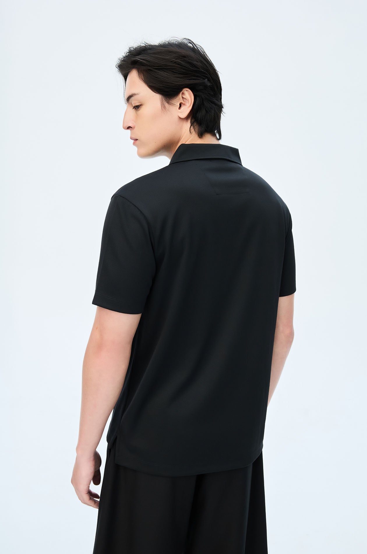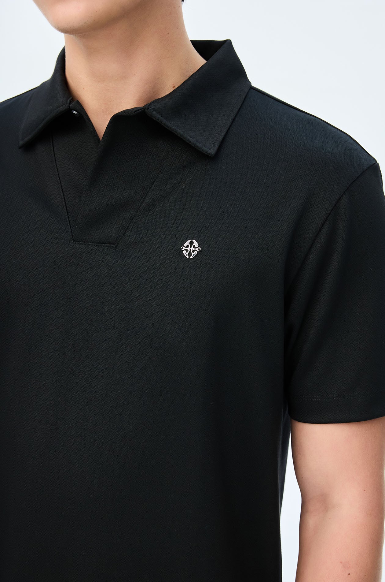 Short-sleeved polo shirt in herringbone jersey fabric. Regular fit with open collar and silver hardware at the chest. Available in black, white, and light beige.