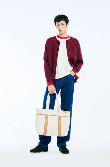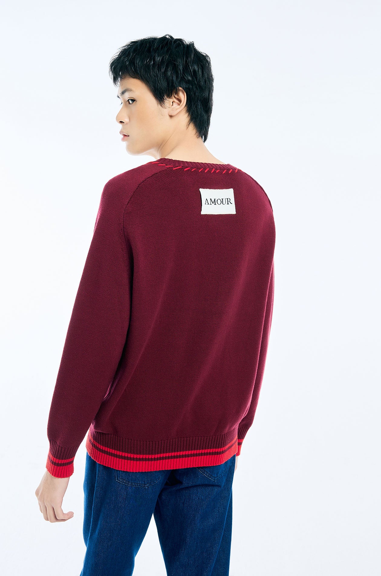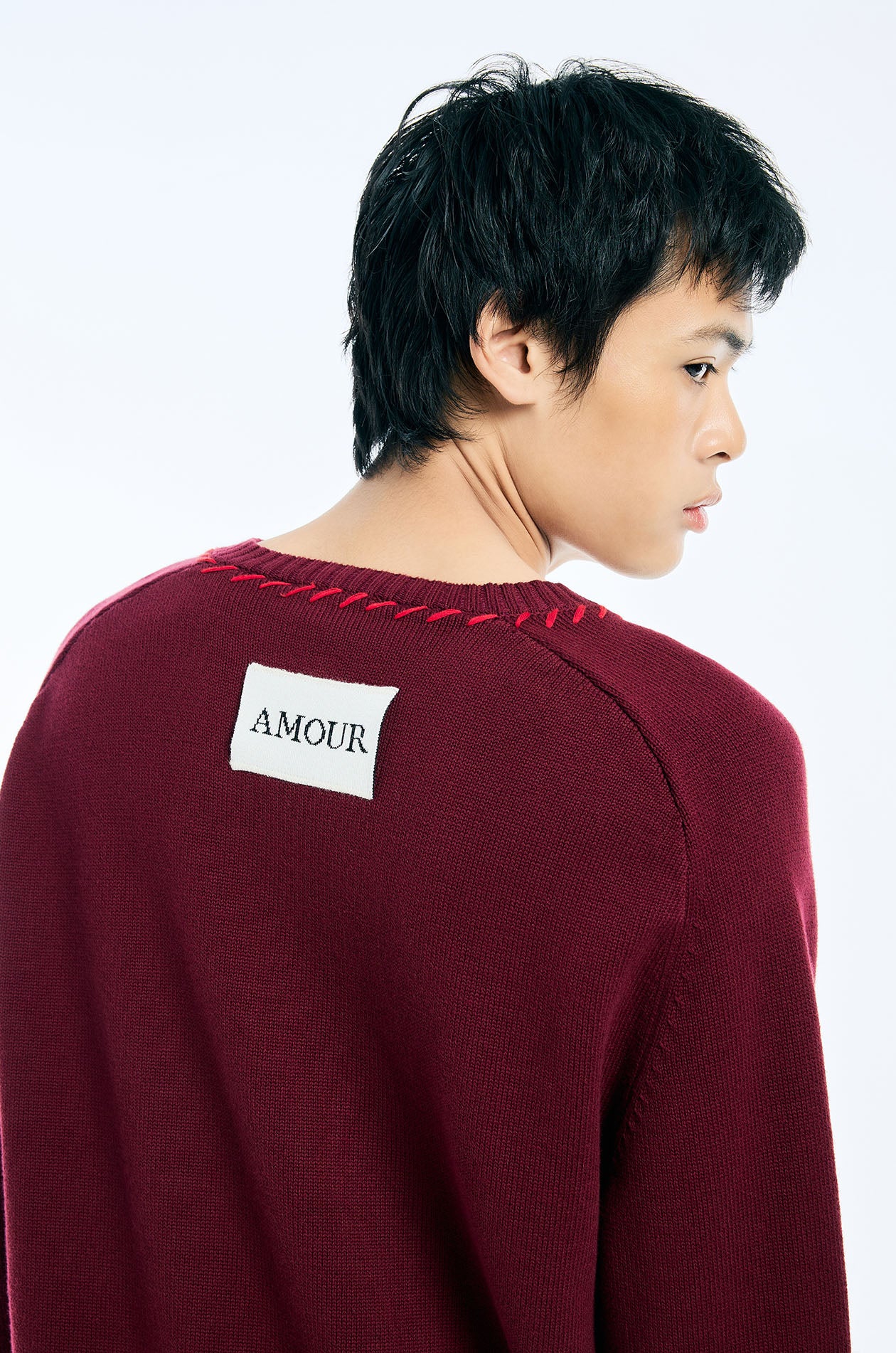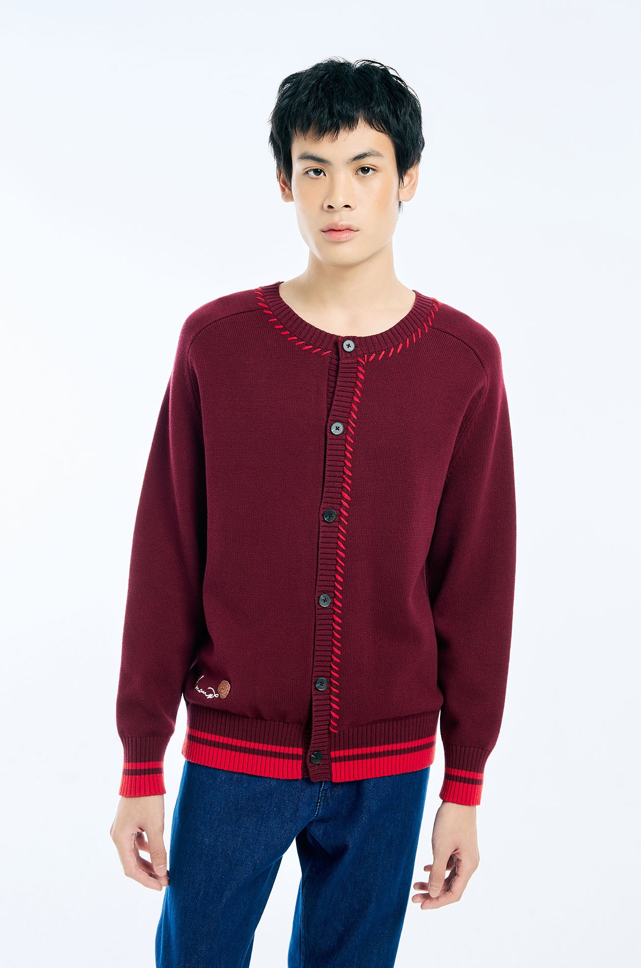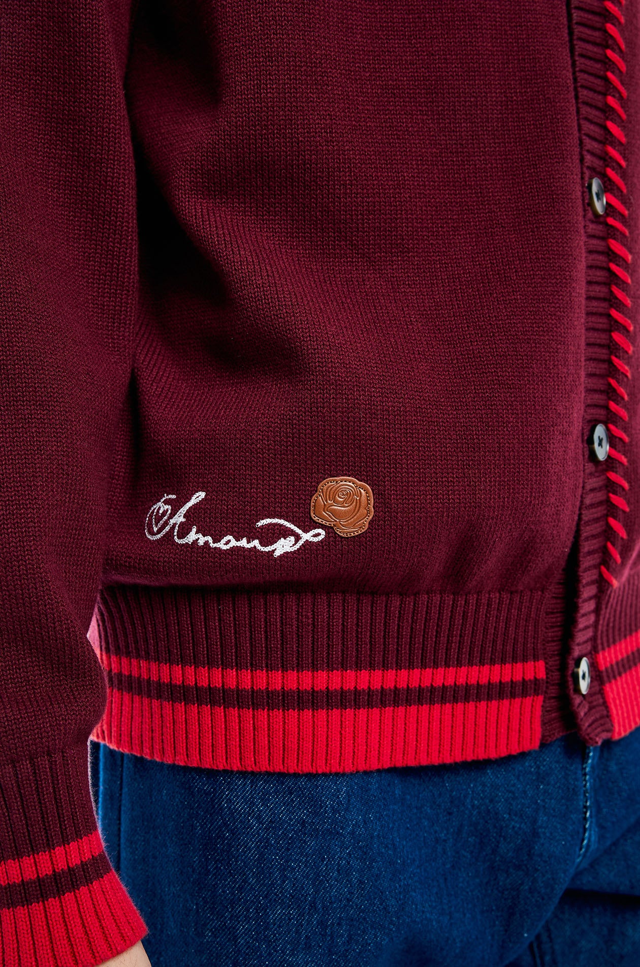 Jaspal The Edit x Proud & Tan | Long-sleeved cardigan in knit. Regular fit with a round neckline, a faux leather rose applique at the hem, and stitching detail. Front button closure. Available in burgundy red.