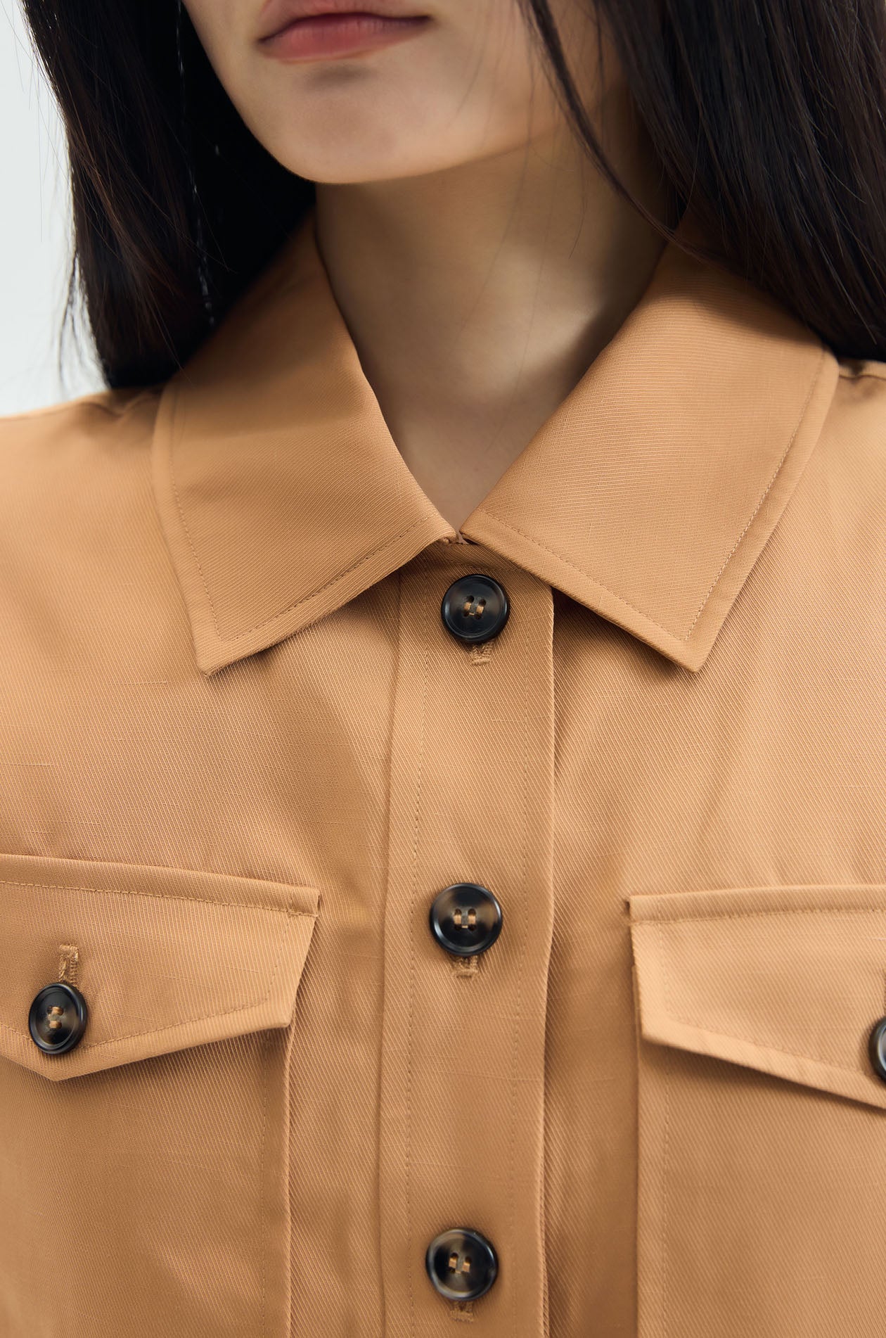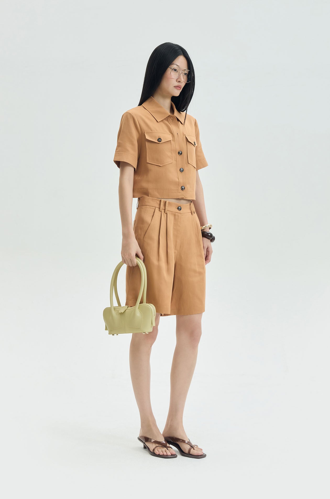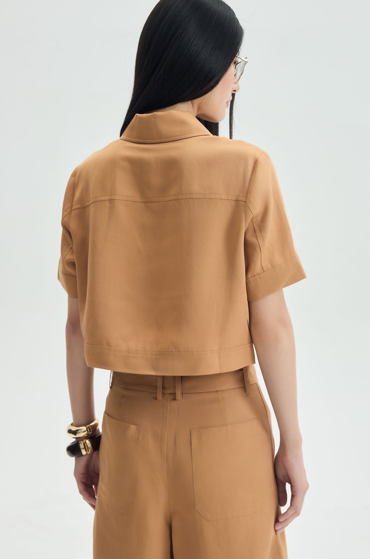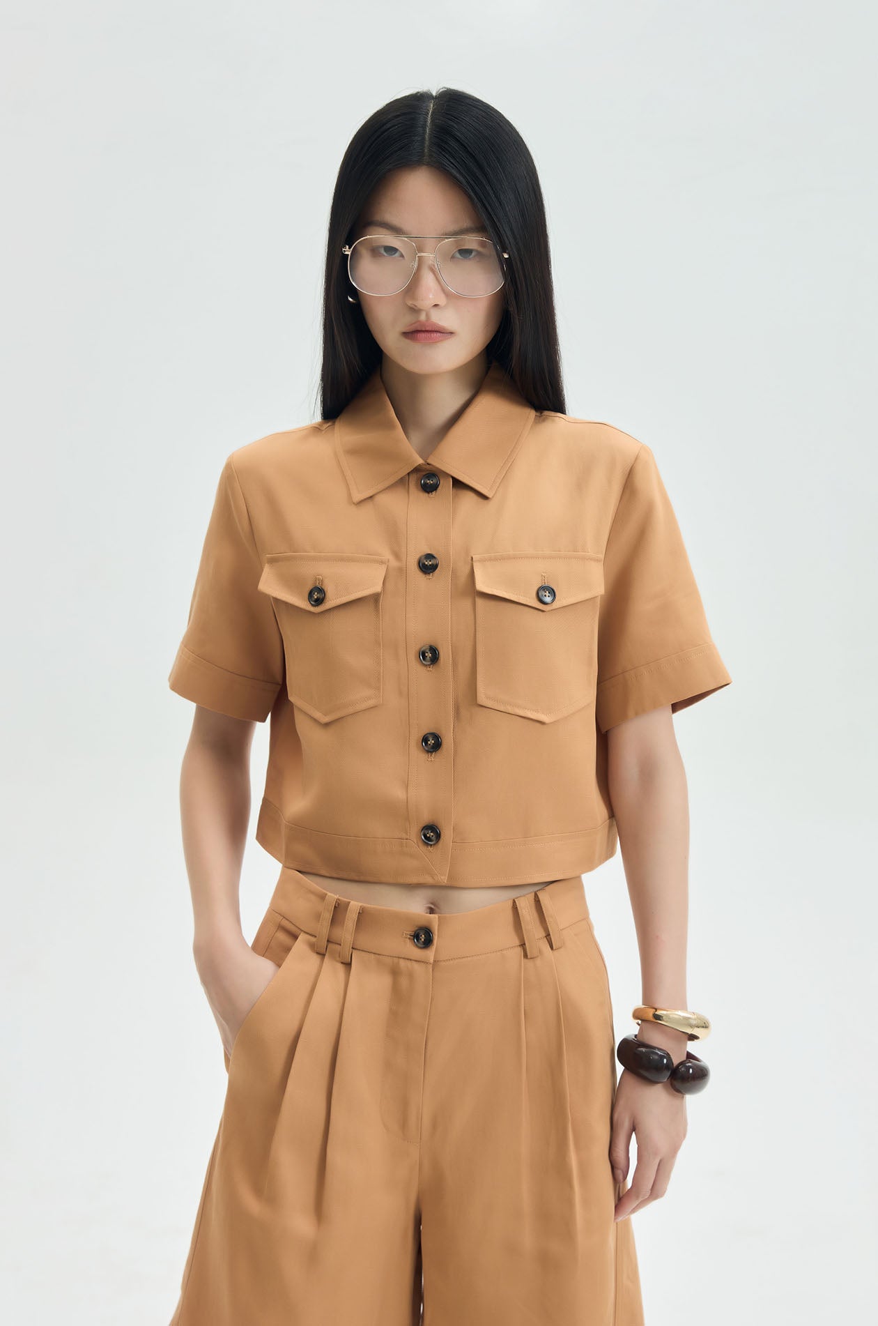 Short‑sleeved cropped shirt crafted from a lyocell–linen blend for a light, breathable feel. Designed in a relaxed fit with a classic collar and finished with chest pockets for a clean, effortless look. Available in brown.