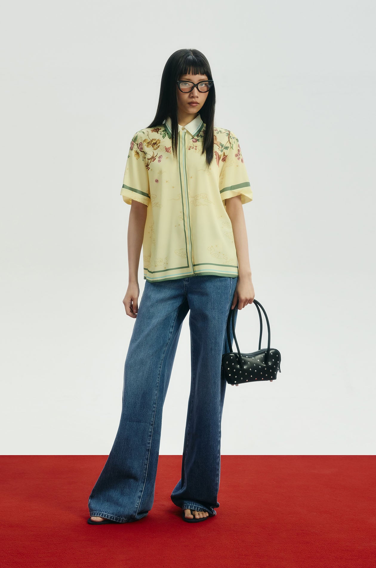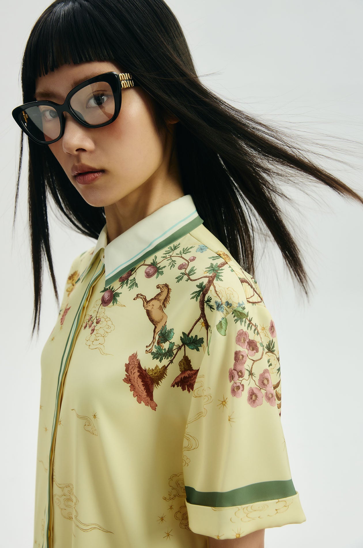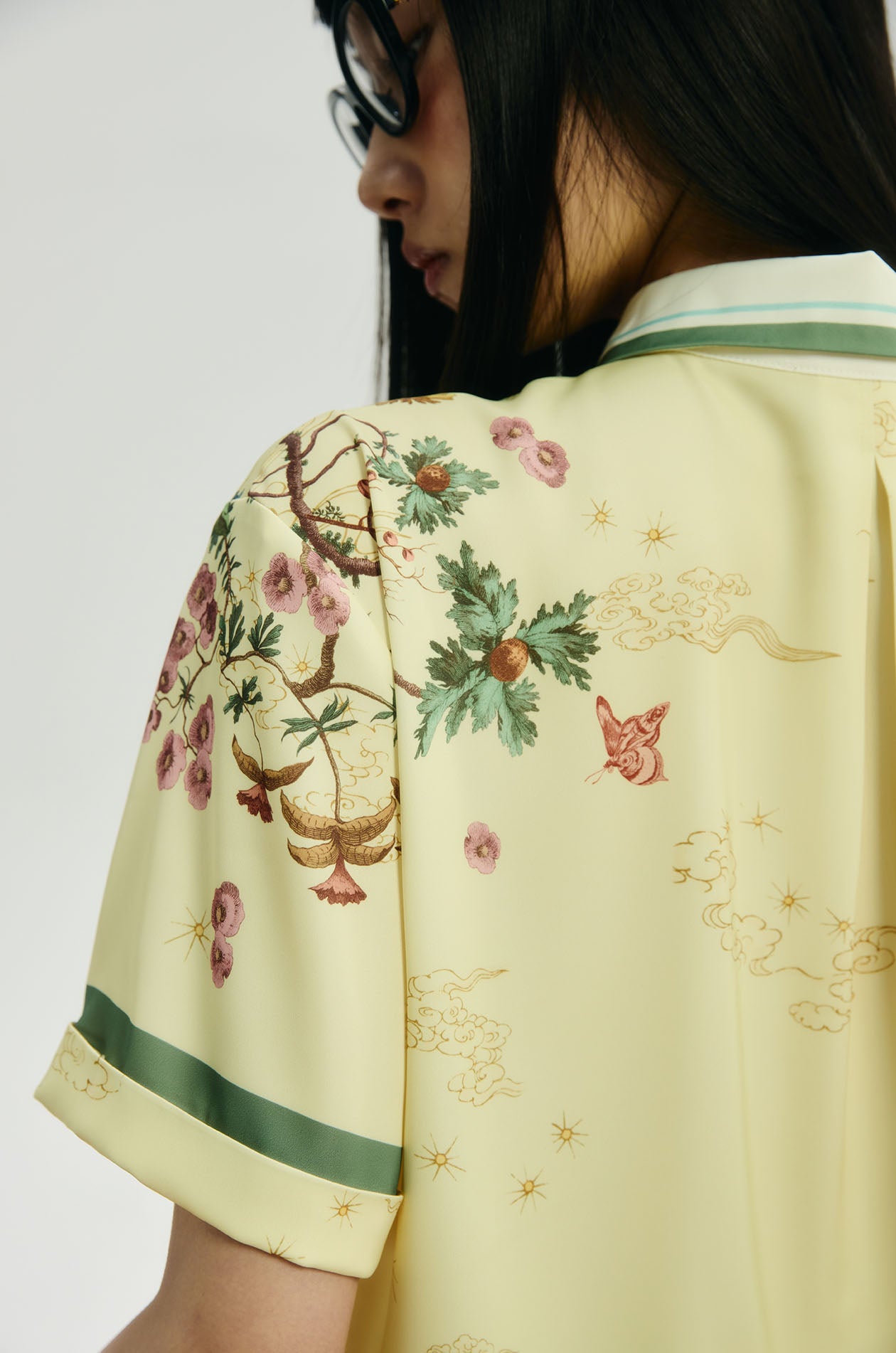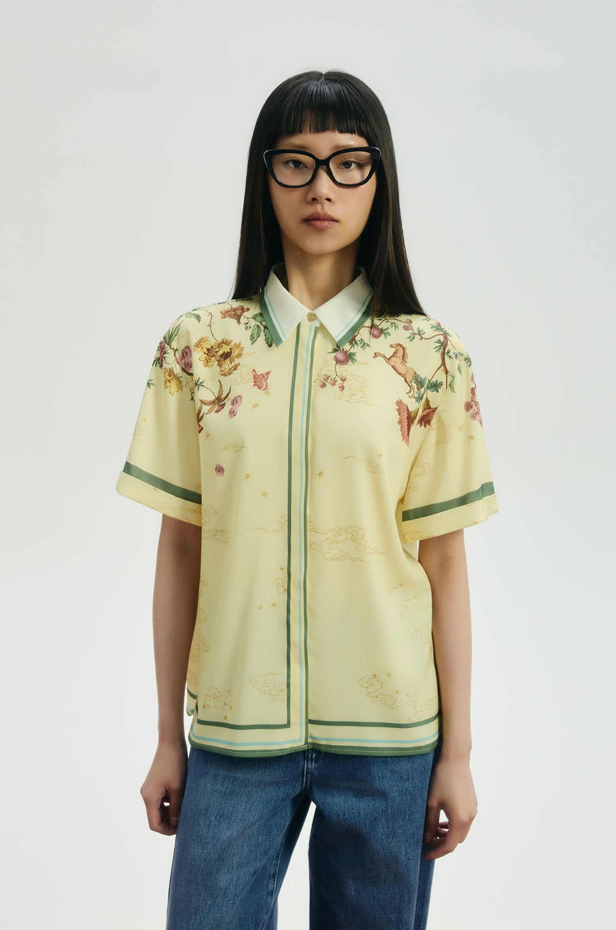 Jaspal x nussdaydream for Lunar New Year | Short-sleeved shirt in satin. Regular fit with Floral & Horse motif print and striped edges. Classic collar and rollup sleeves. Front button closure. Available in Pale Banana.