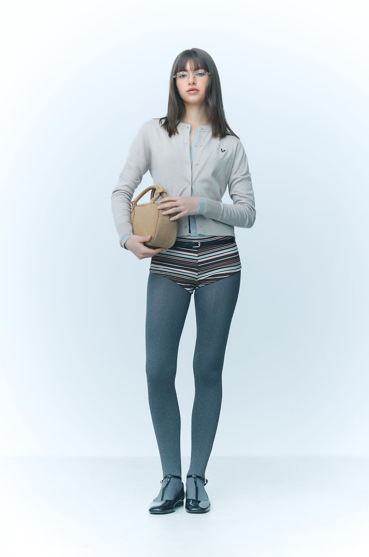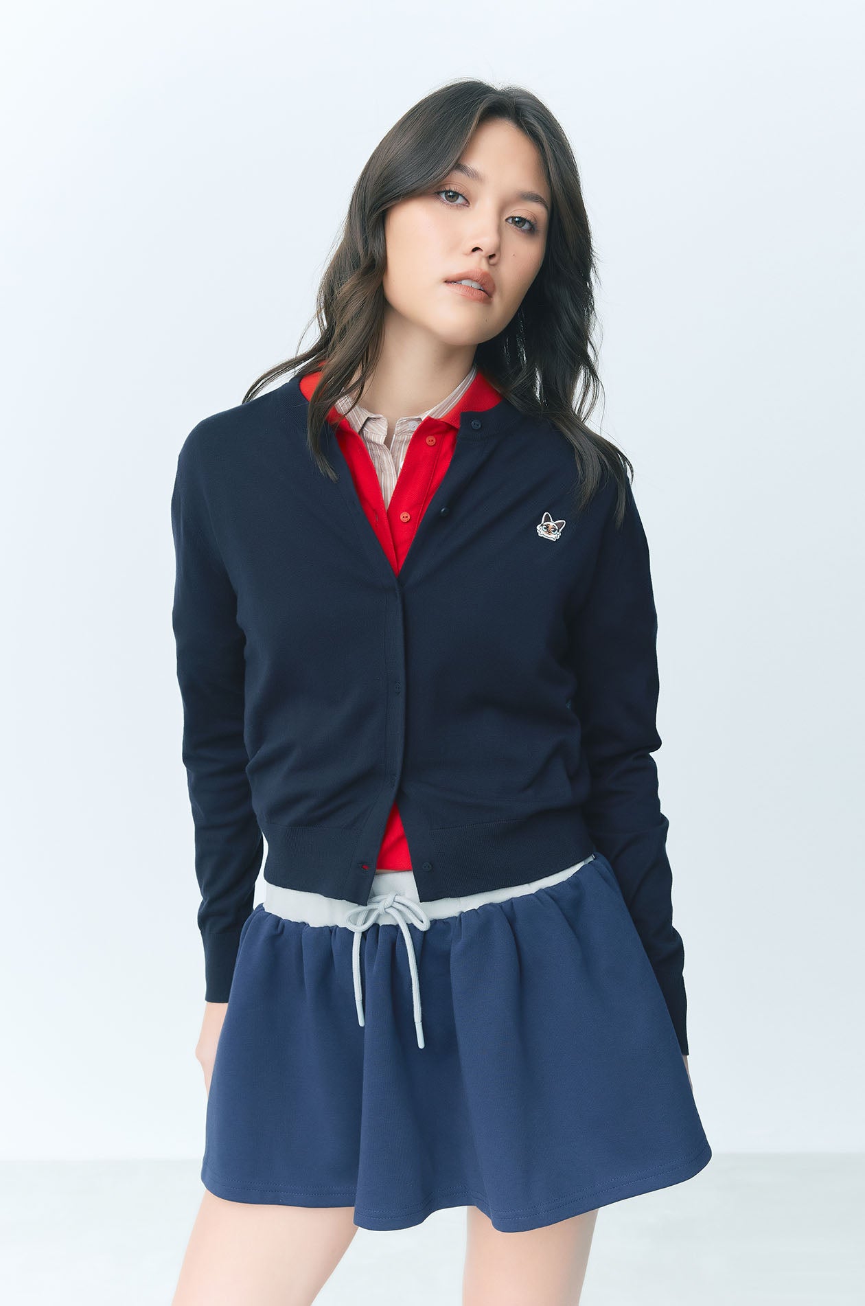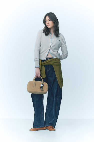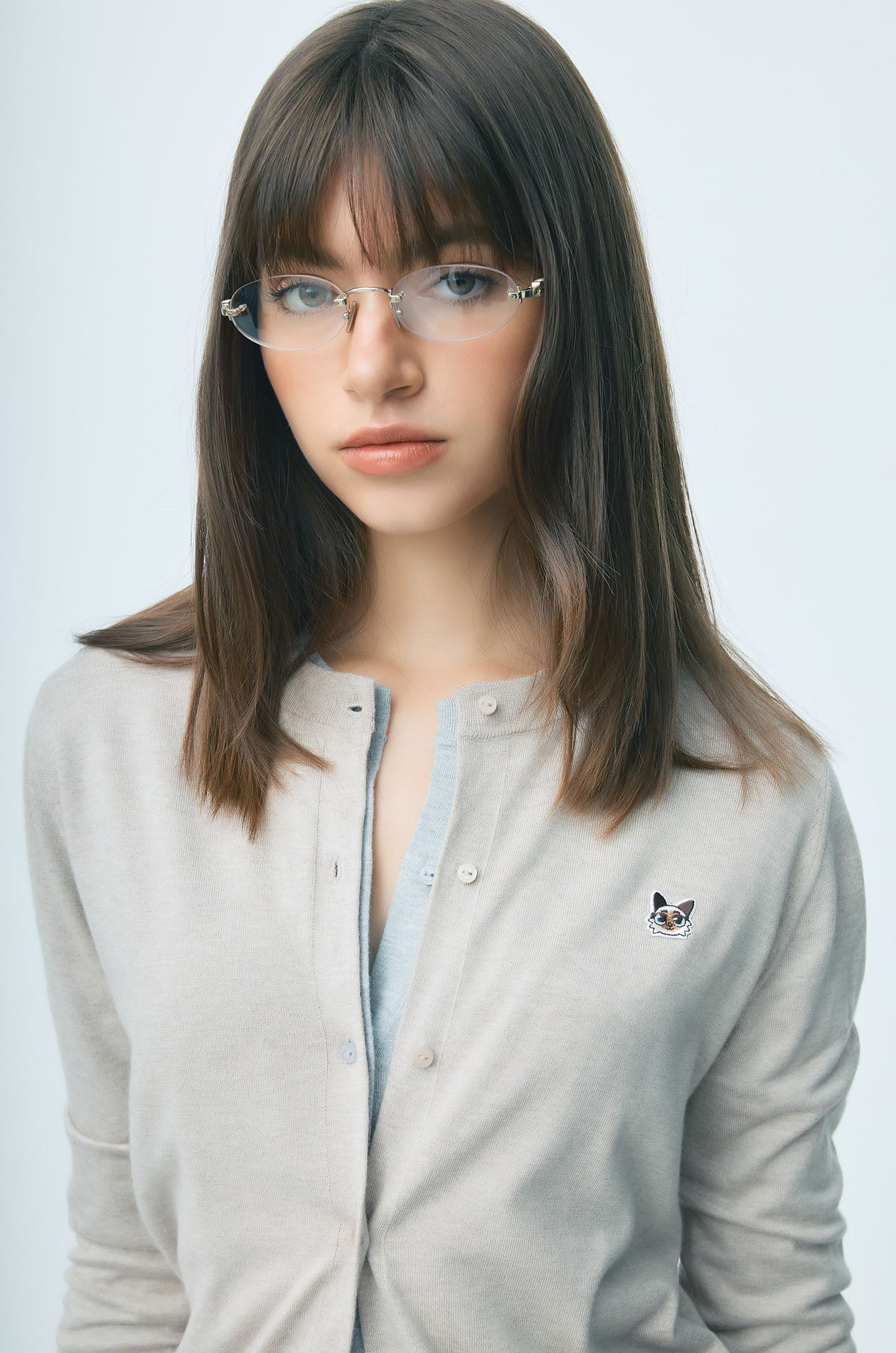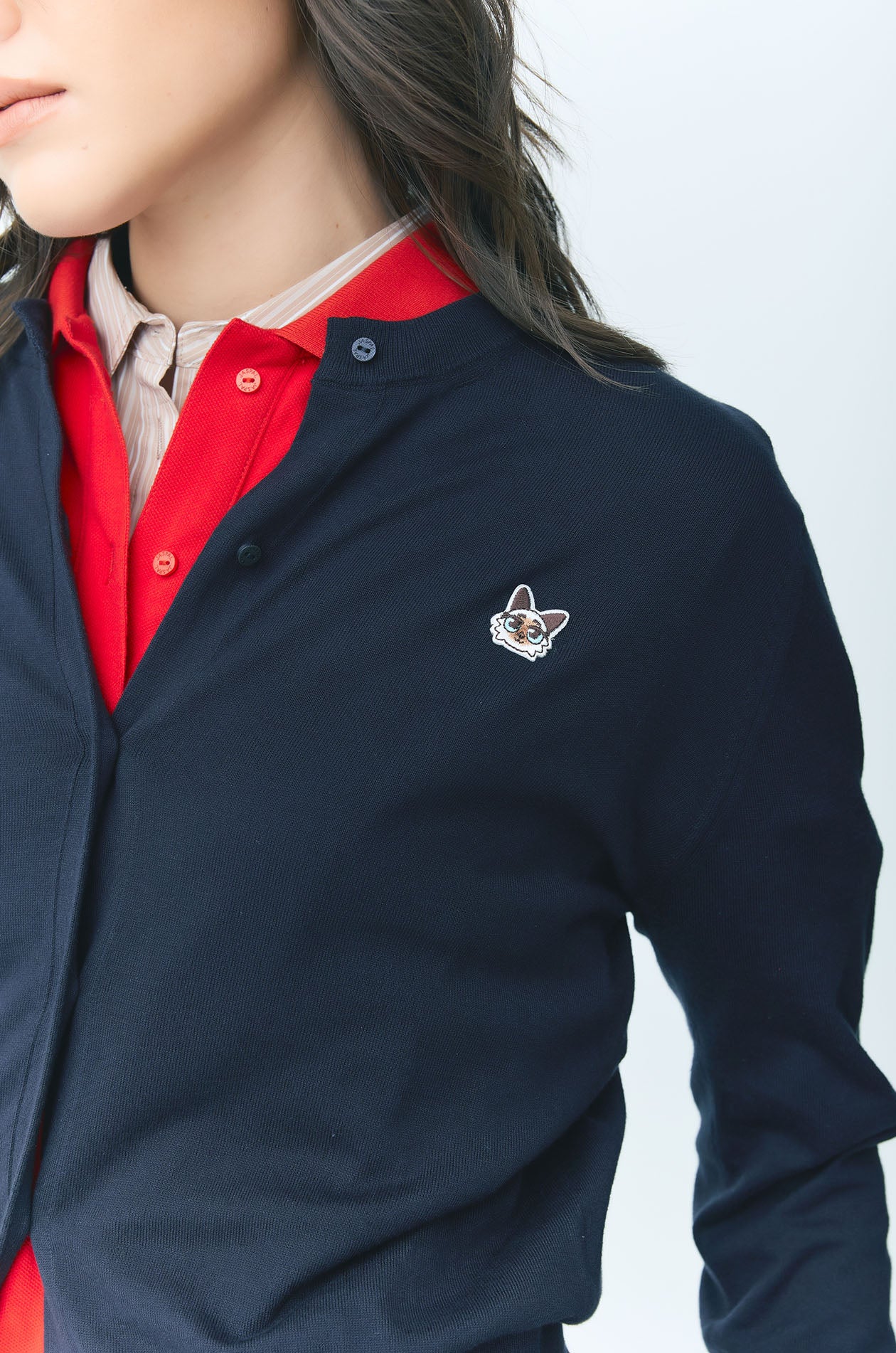 JASPURR | Long‑sleeved cardigan crafted from flat‑knit jersey in a comfortable regular fit. Detailed with cat applique at the chest and finished with ribbed edges and a round neckline for a soft, classic look. Available in beige, grey, and navy.