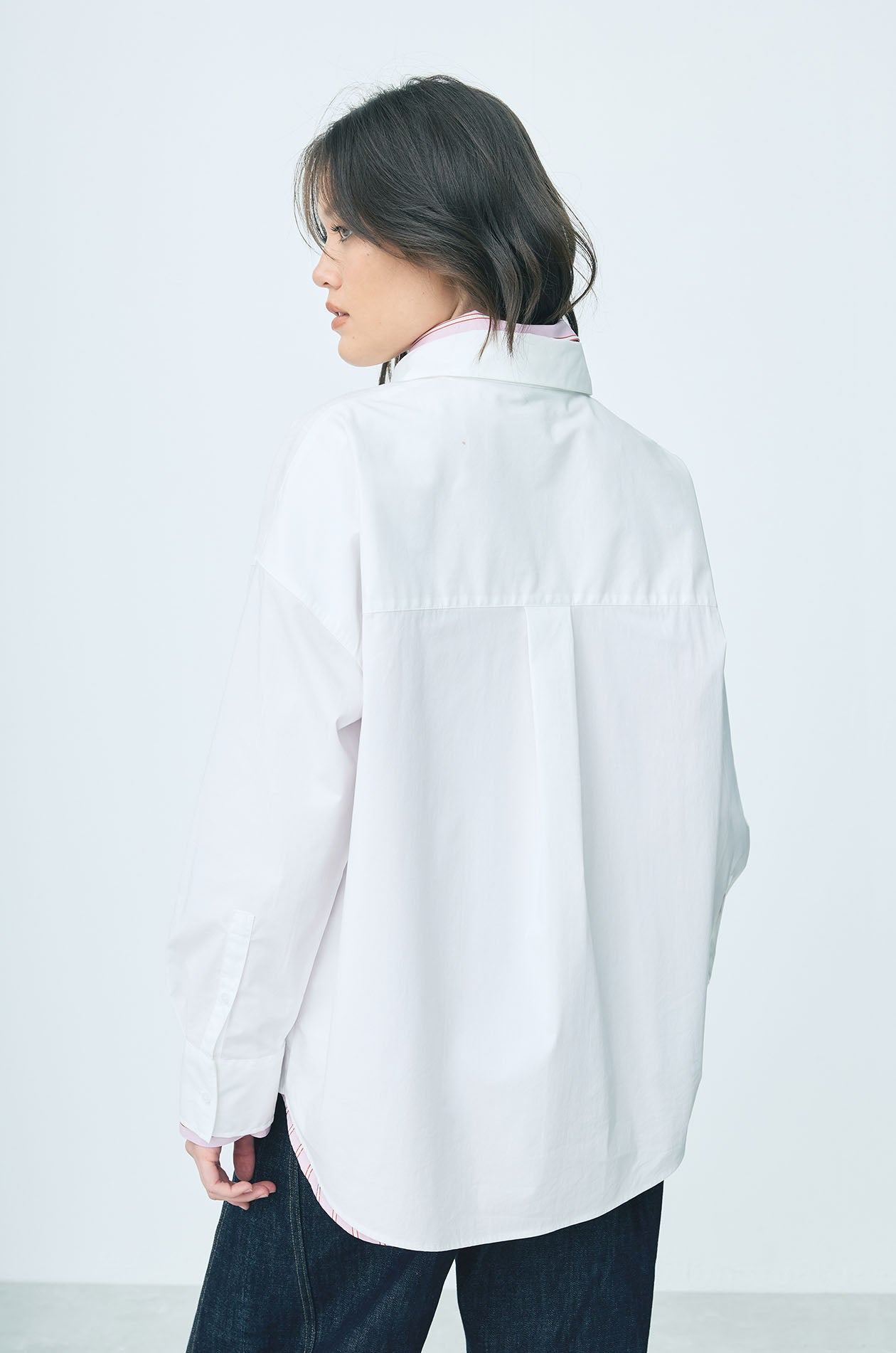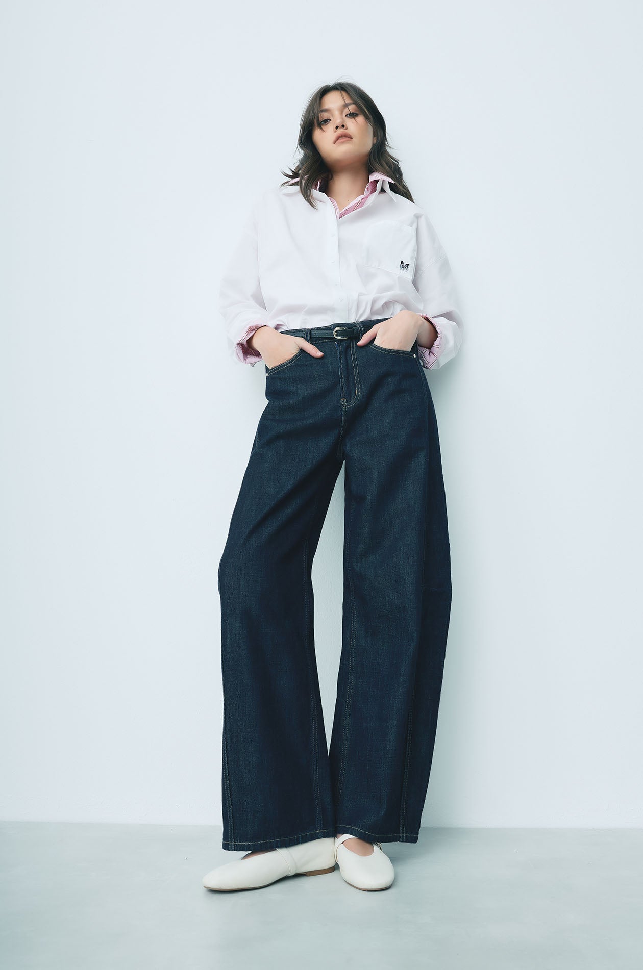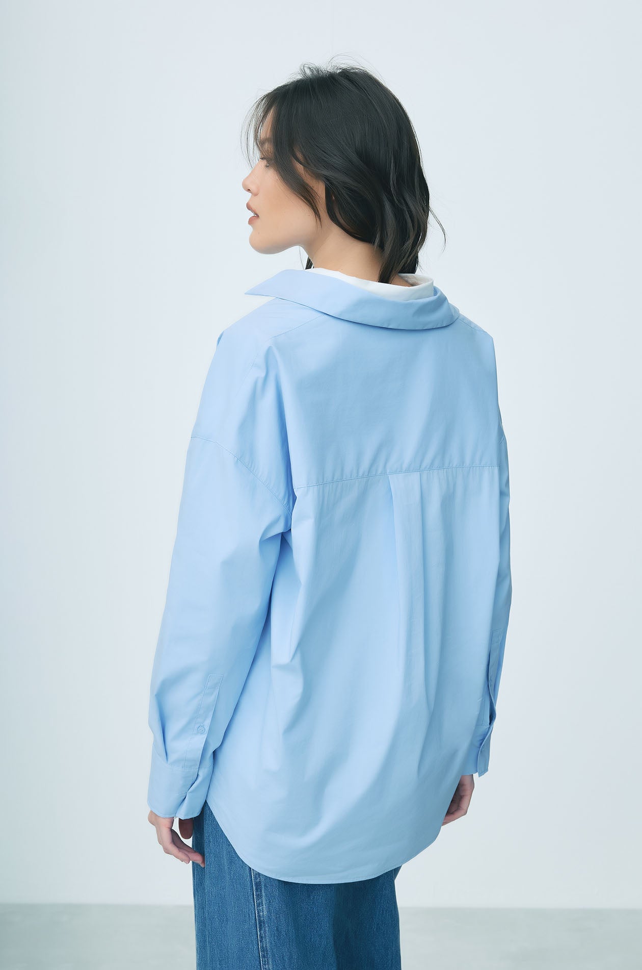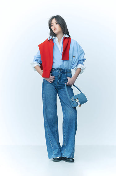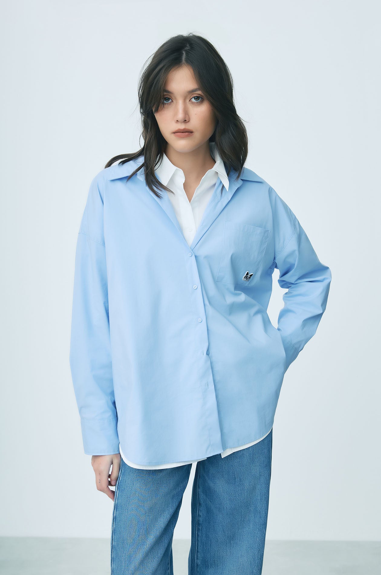 JASPURR | Long‑sleeved shirt crafted from a woven cotton blend in an oversized silhouette. Designed with a classic collar and a chest pocket detailed with cat applique for a playful accent. Available in blue and white.