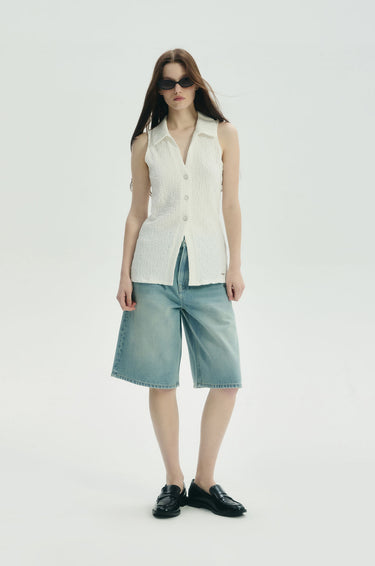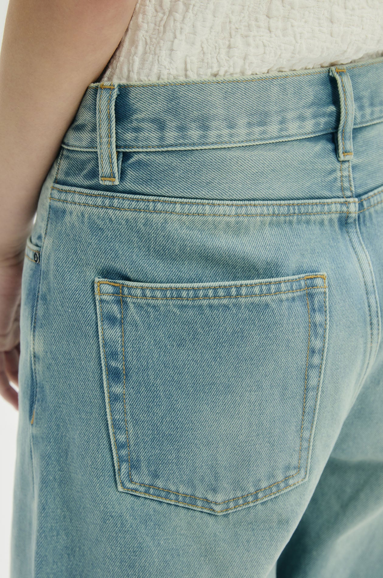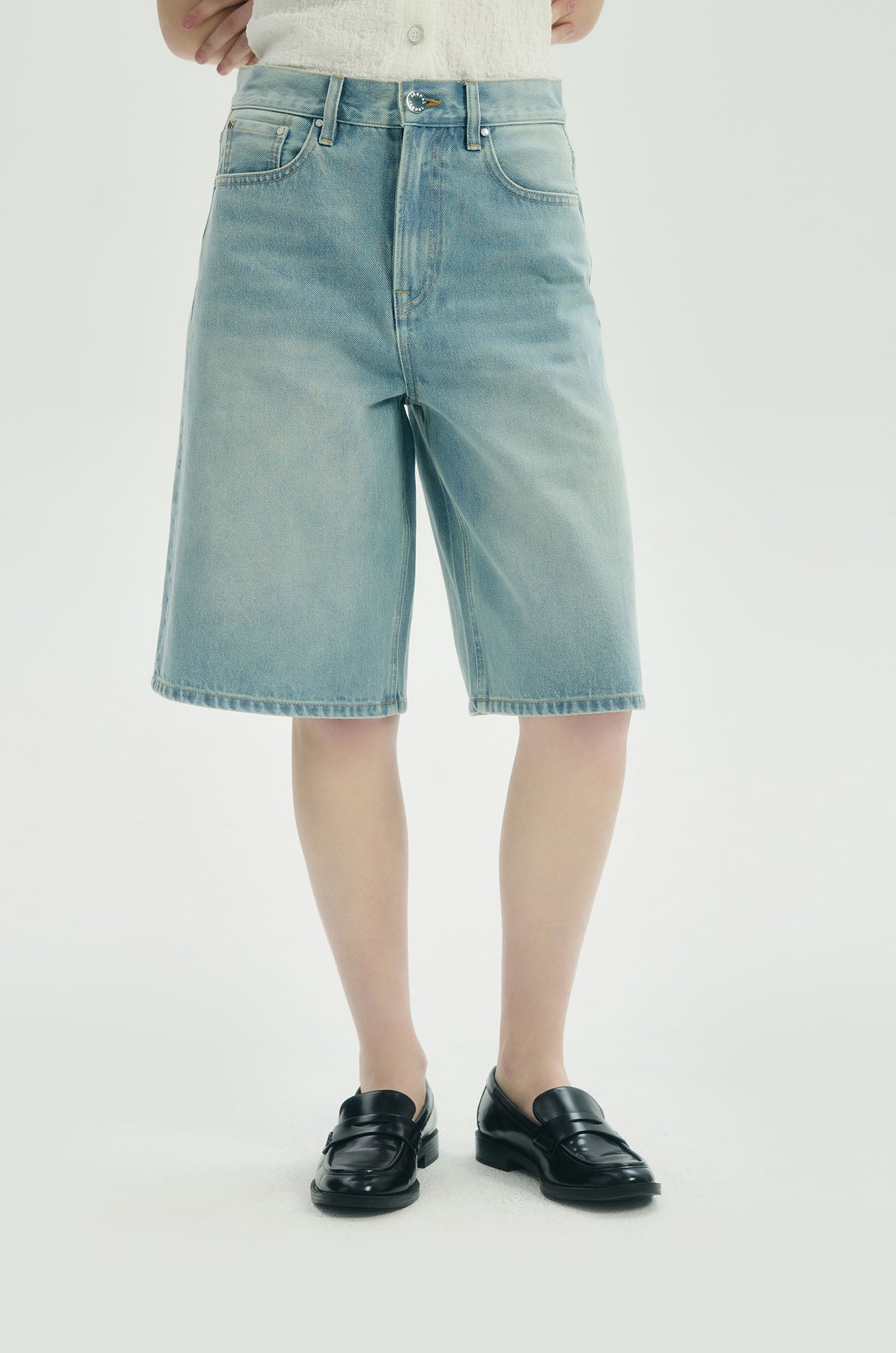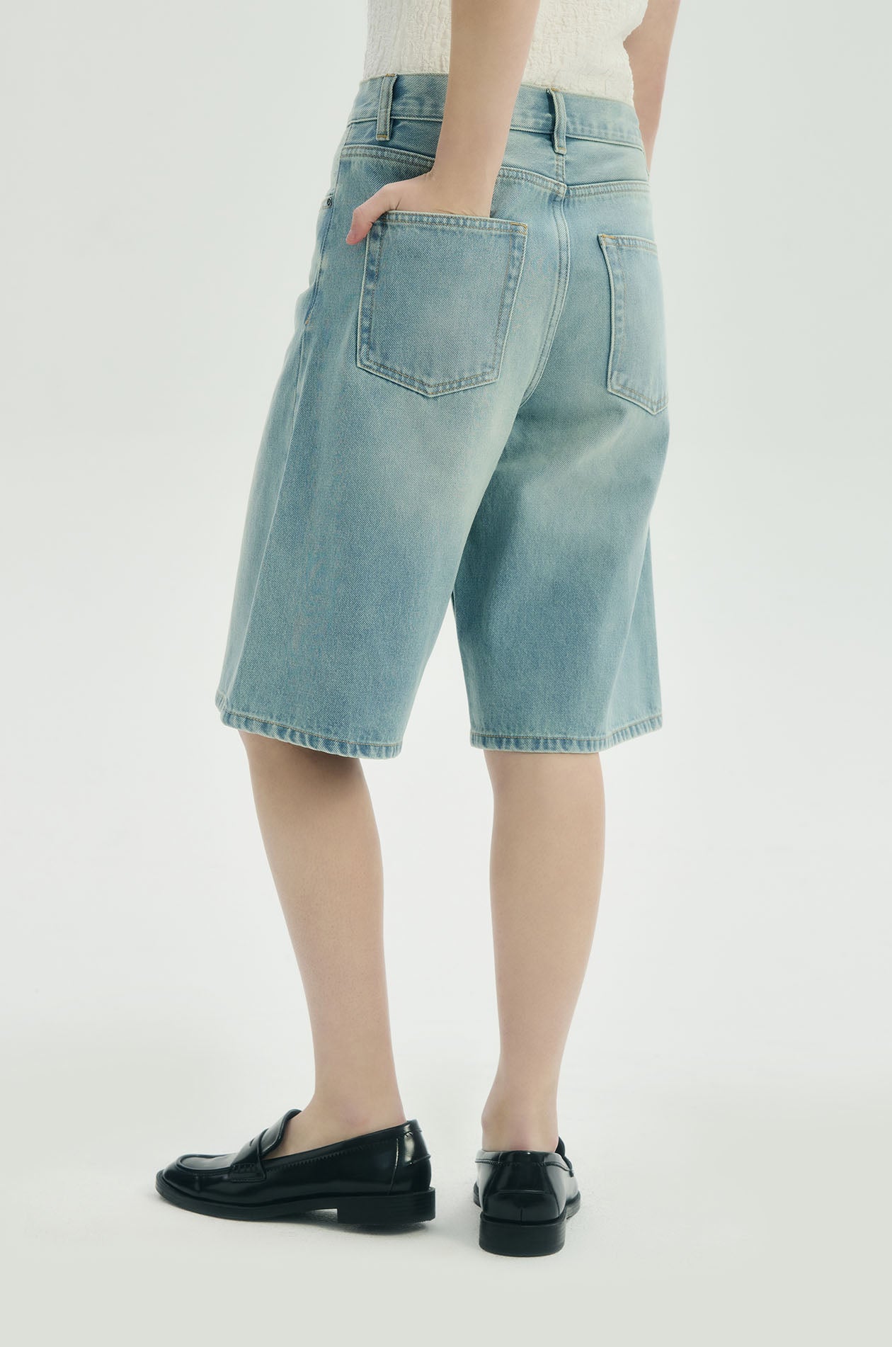 Mid-rise Bermuda shorts in denim. Straight-leg silhouette with classic five-pocket style and vintage-wash detailing. Front button and zip closure. Available in light blue.