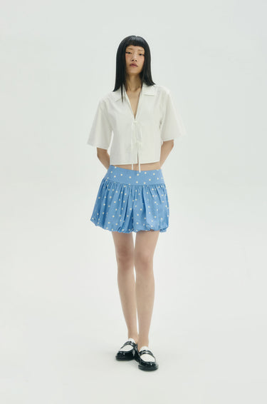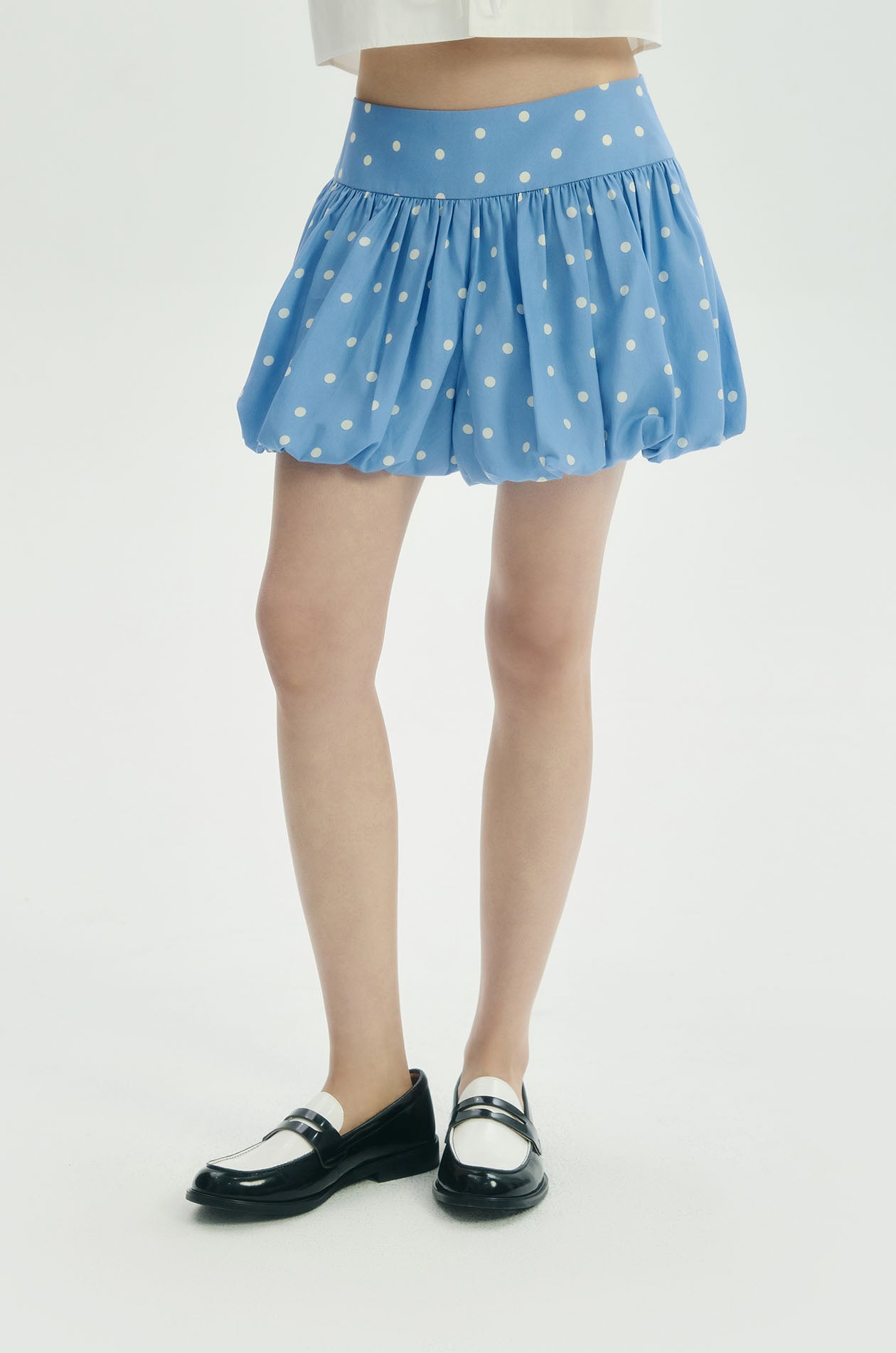Mid-rise shorts in poplin with dot pattern. Balloon legs with drop-waist panel. Back zip closure. Available in blue.