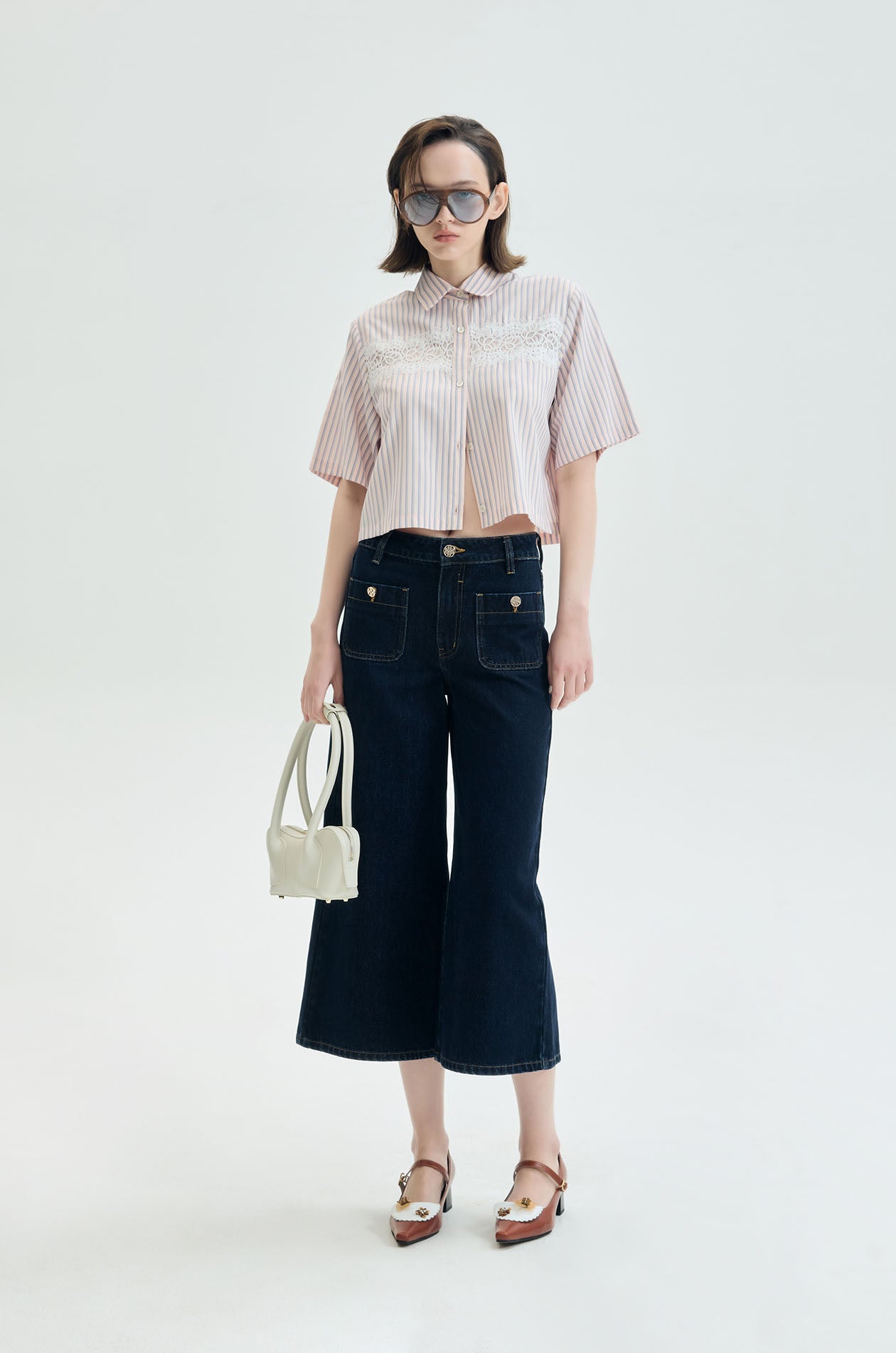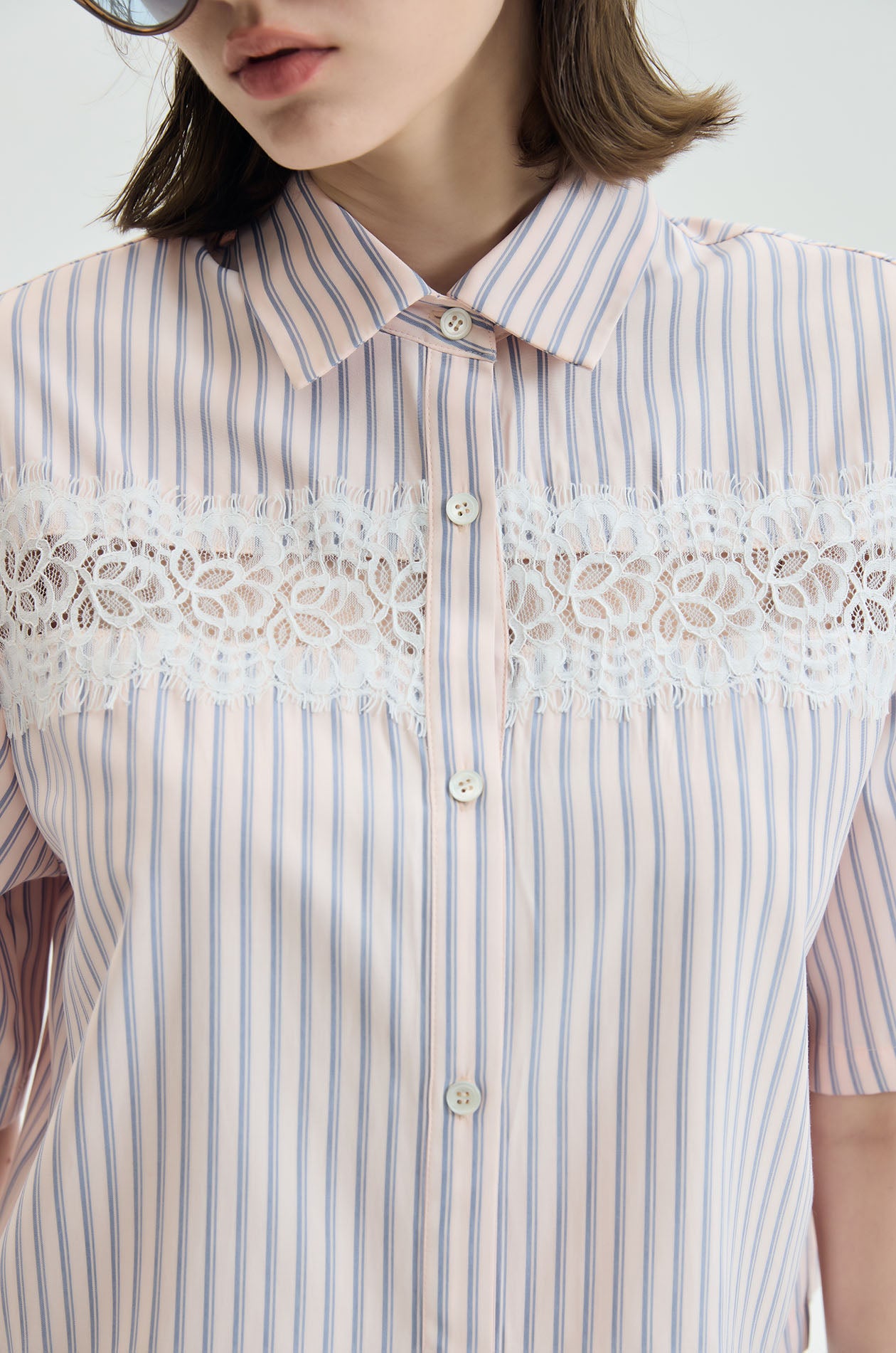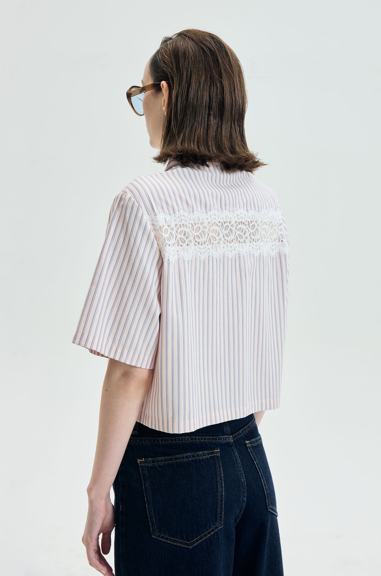 Short-sleeved shirt crafted from striped poplin in a regular fit. Designed with a classic pointed collar and boxy silhouette, featuring a delicate lace panel across the chest and back for a soft feminine contrast. Available in pink.