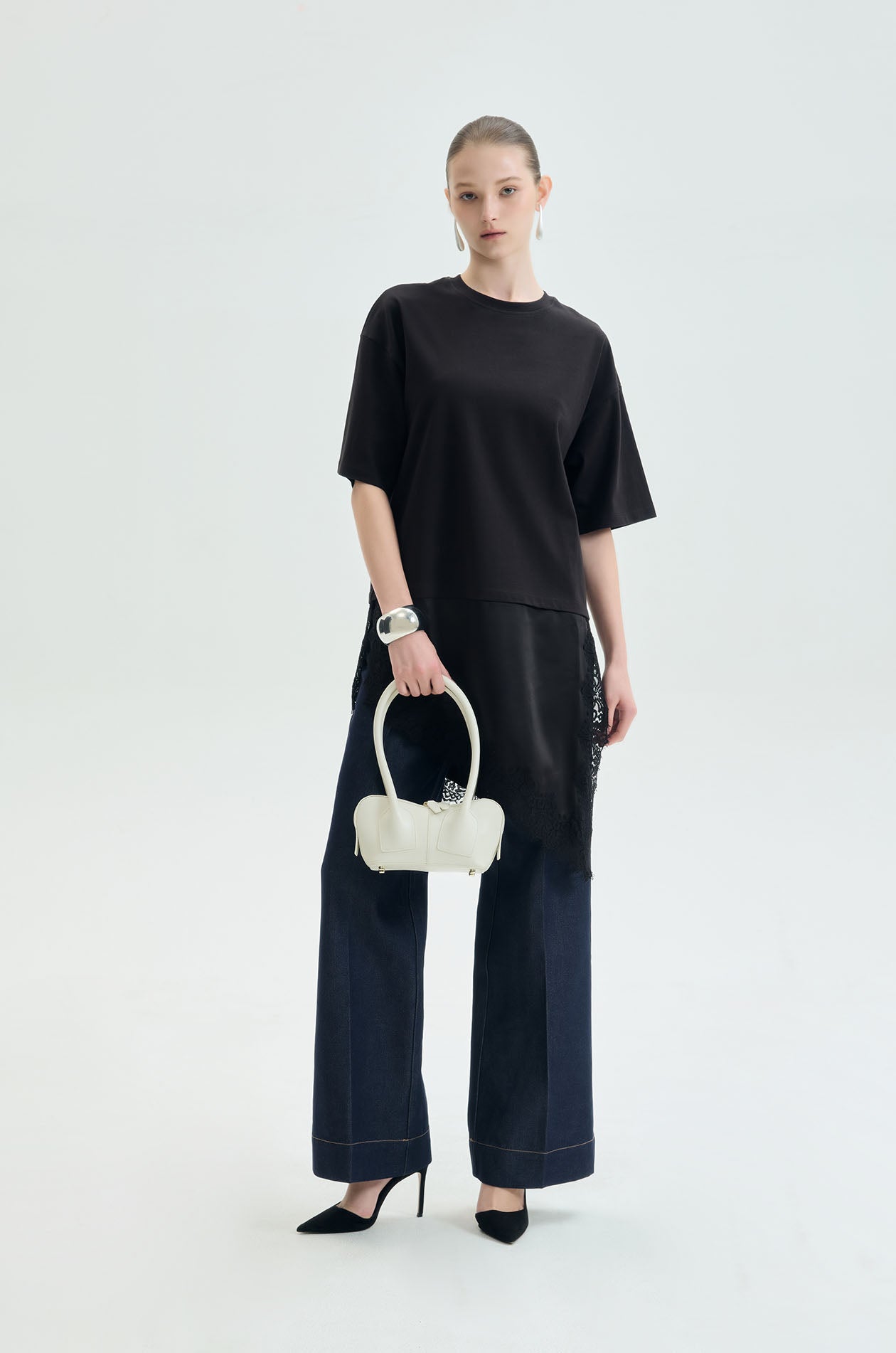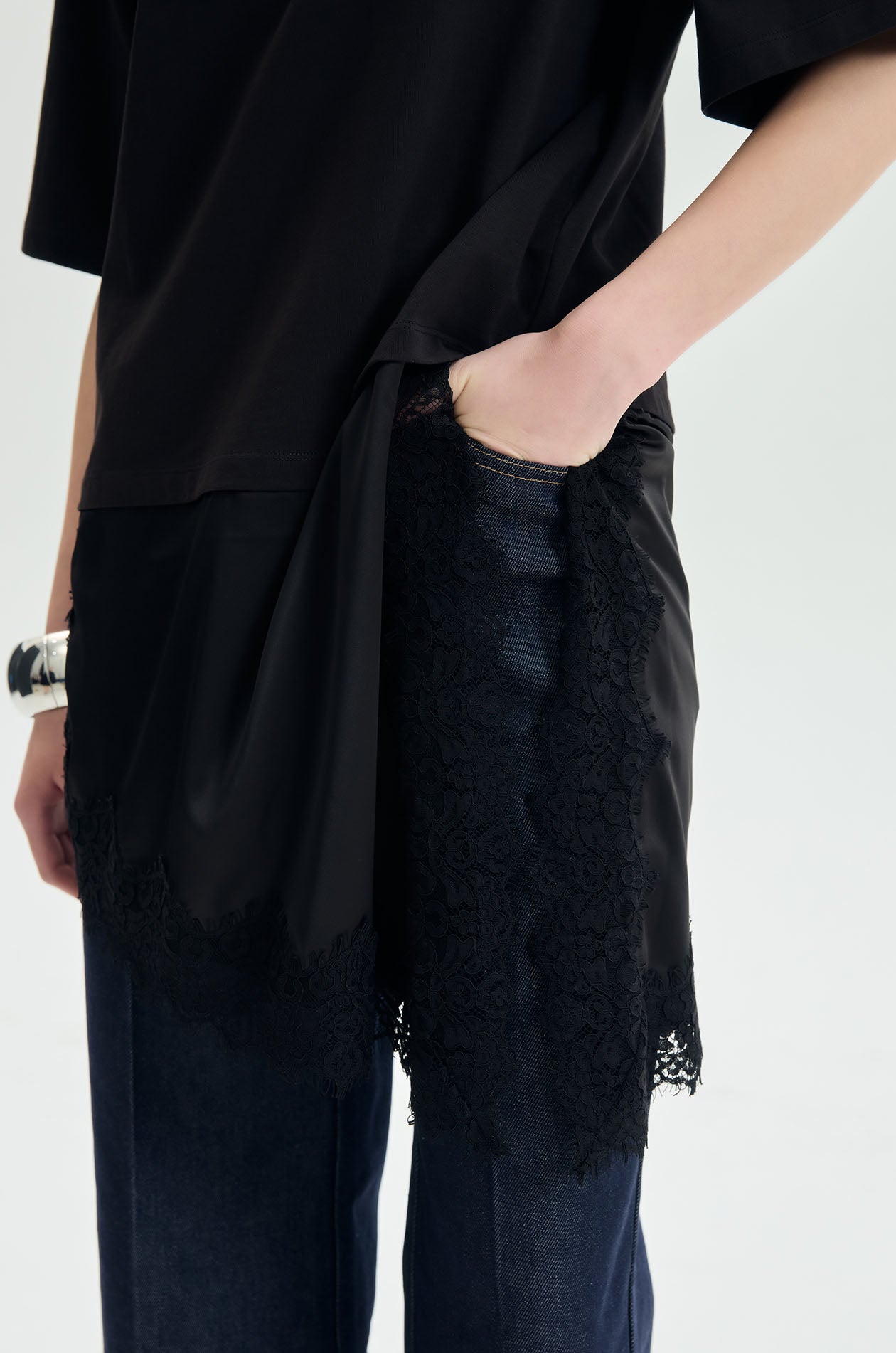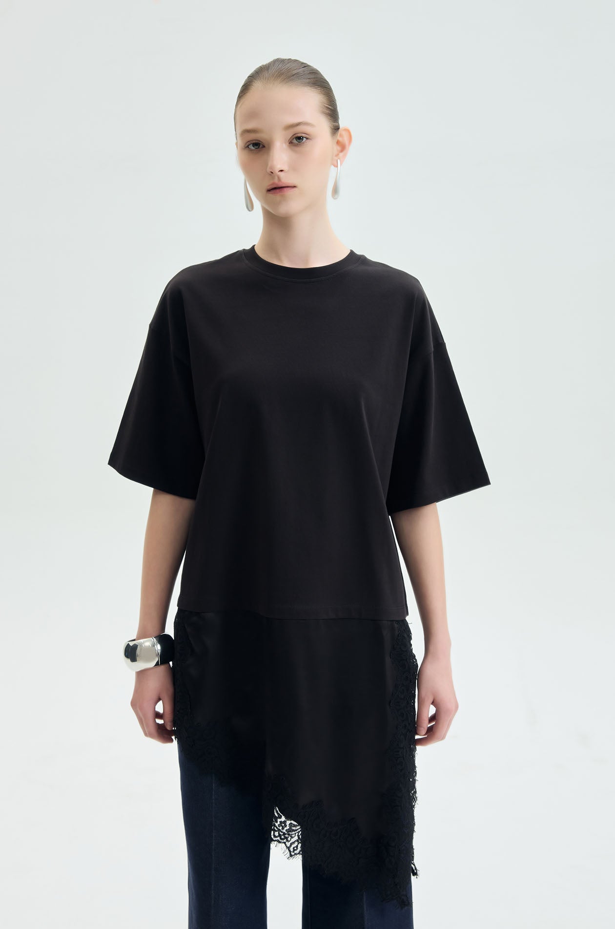 Short-sleeved T-shirt crafted from soft cotton jersey. Designed with a clean round neckline and oversized fit, featuring a contrasting silk-like layered hem panel finished with delicate lace trim for fluid movement and feminine contrast. Available in black.