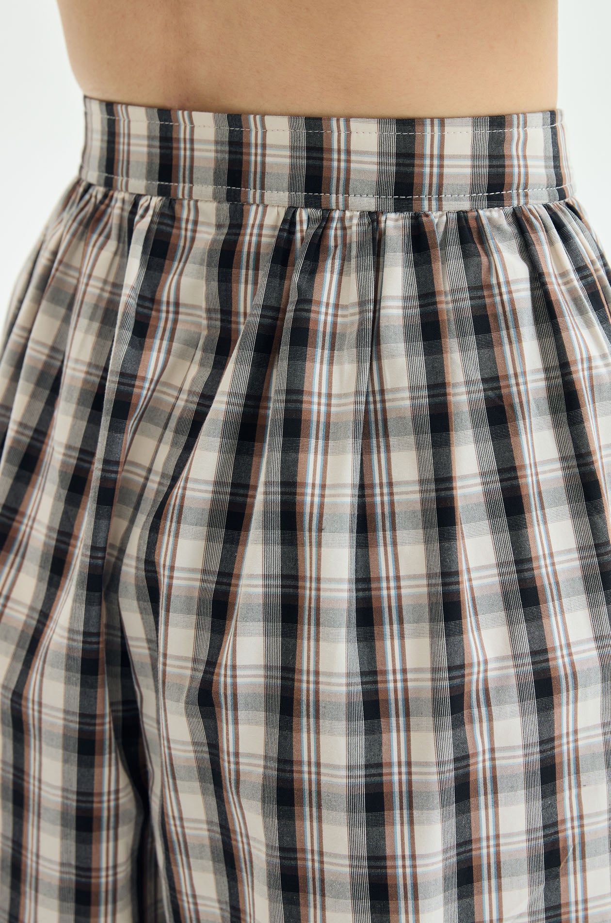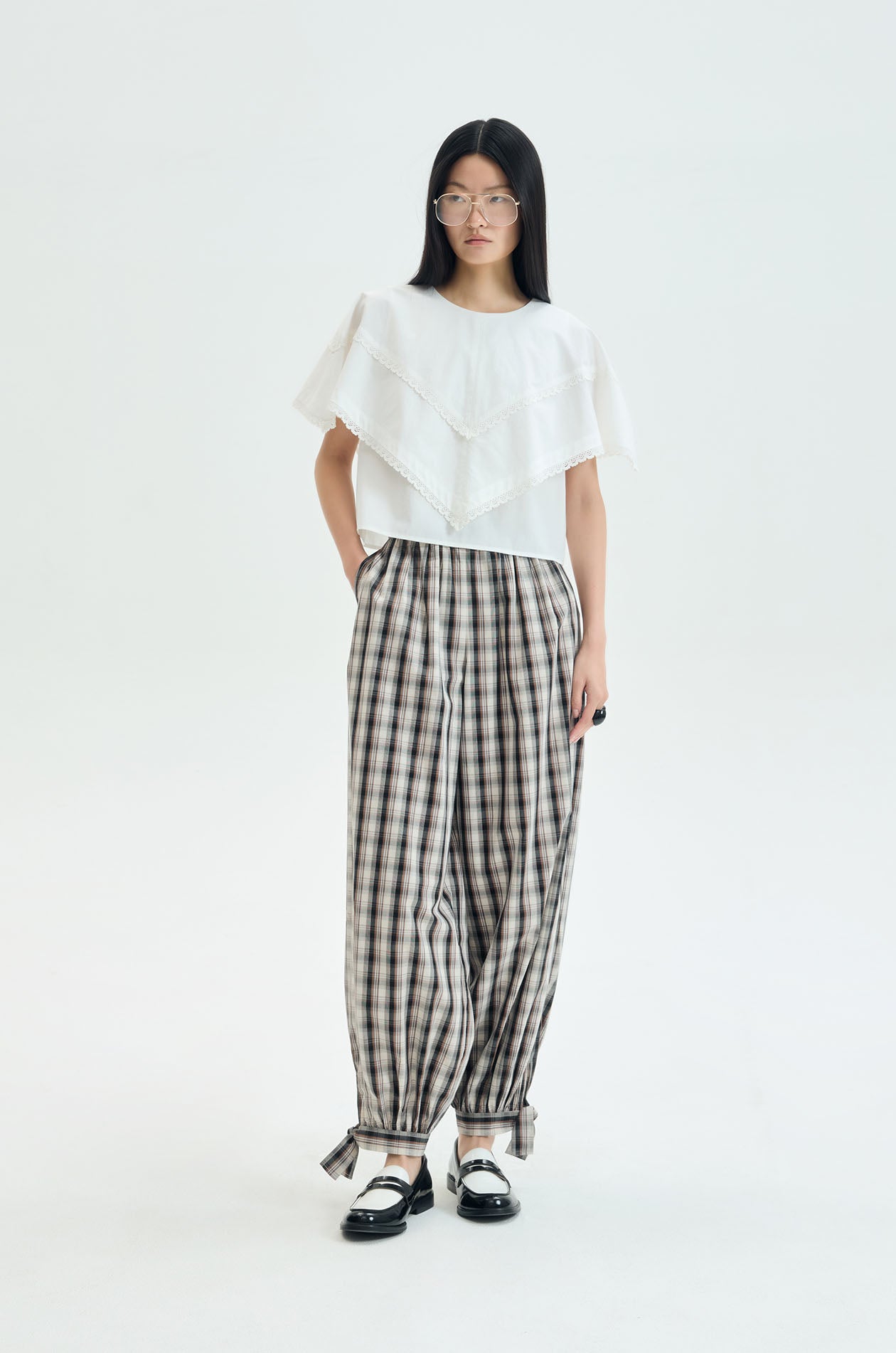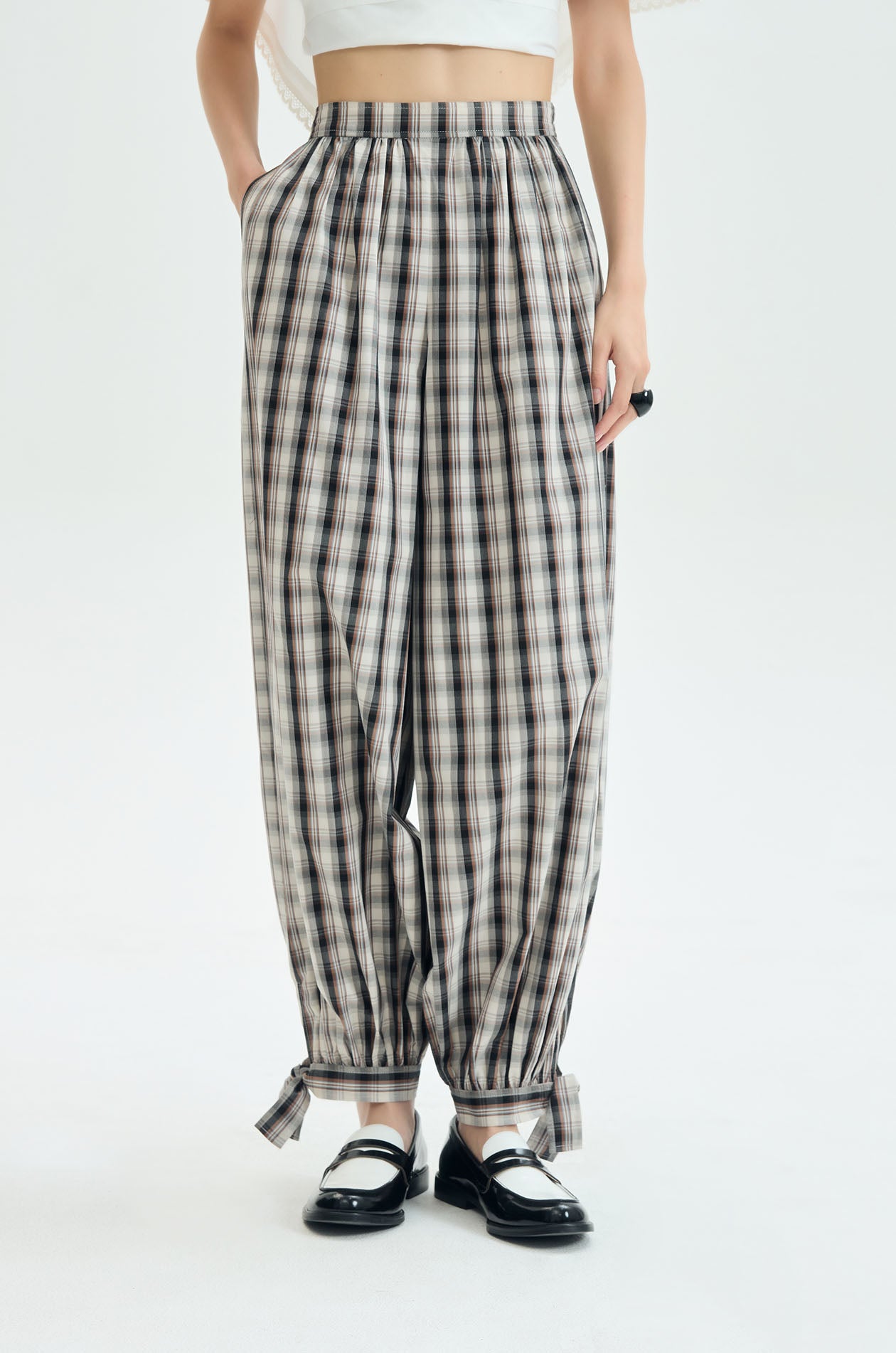 Pants crafted from lightweight woven cotton in a classic plaid pattern. Designed with a voluminous balloon-leg silhouette. Adjustable tie cuffs at the ankles create a softly gathered shape, adding playful structure while keeping an easy relaxed feel. Available in black/beige.