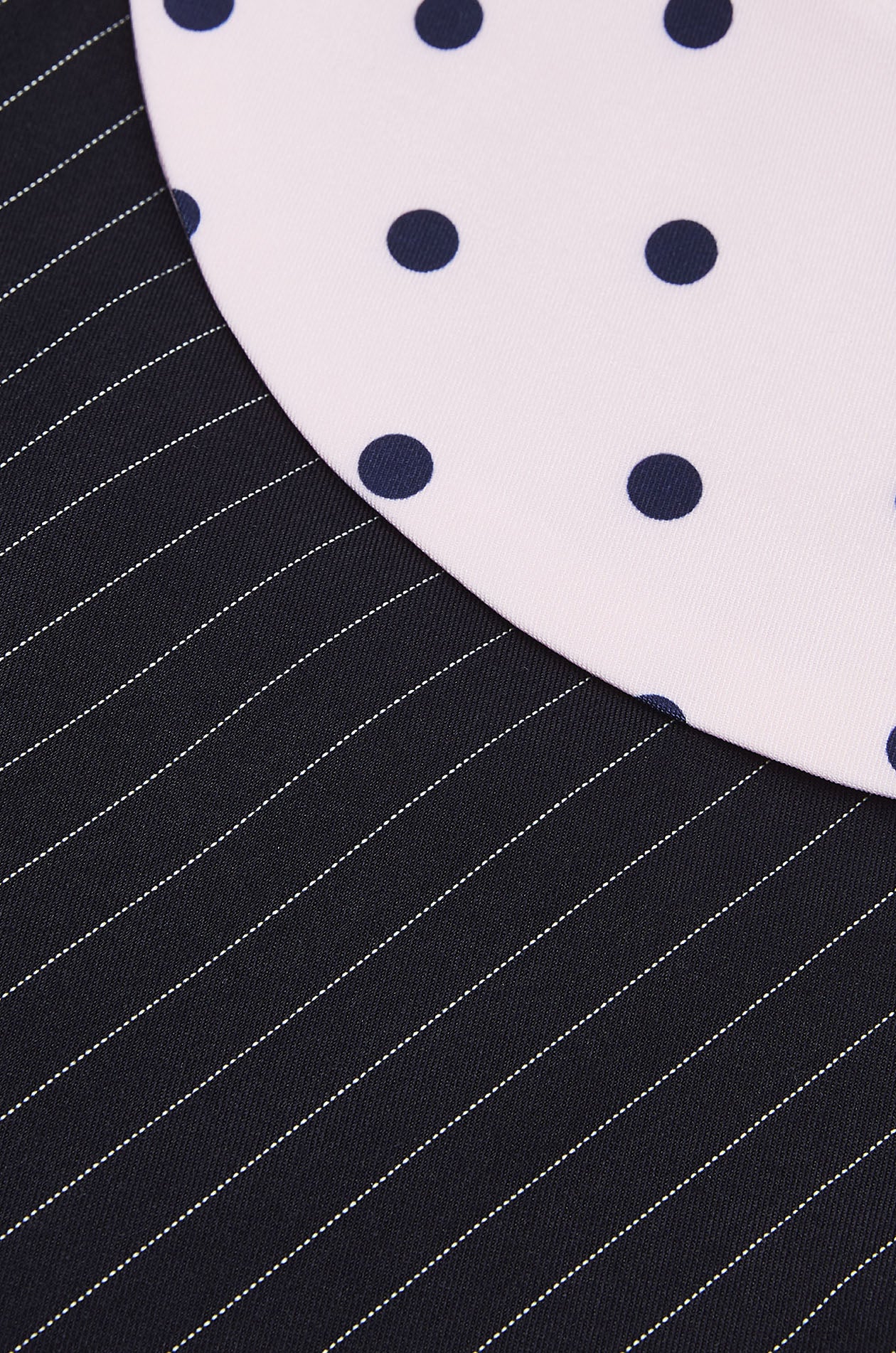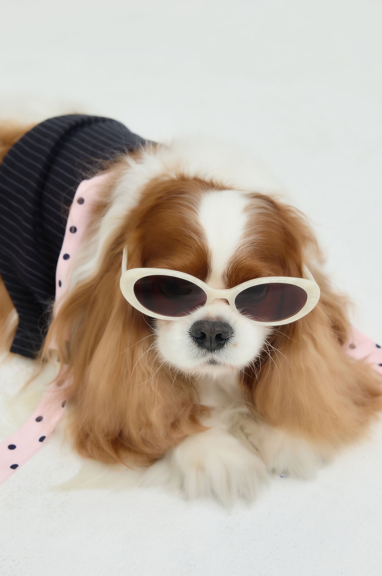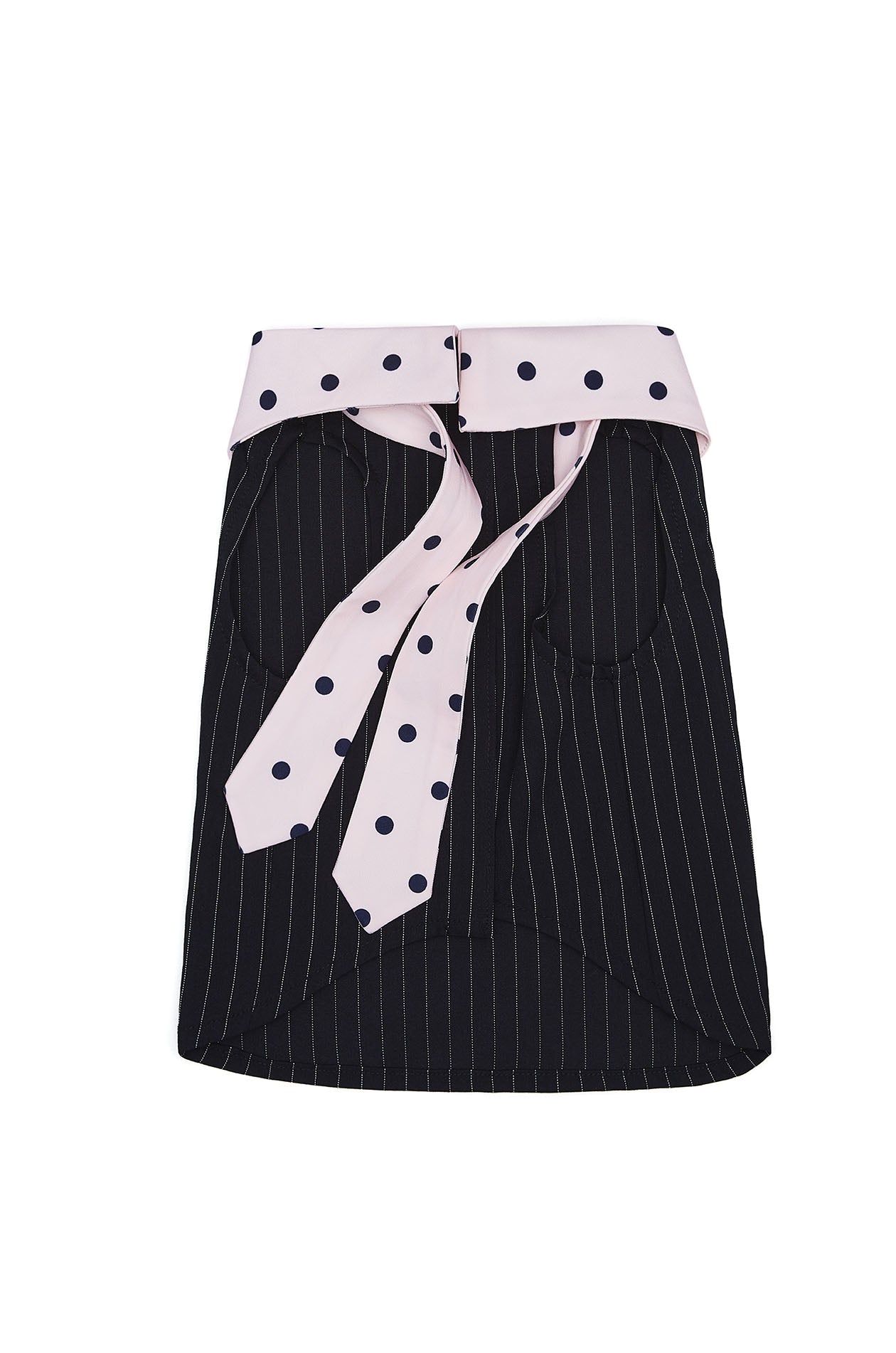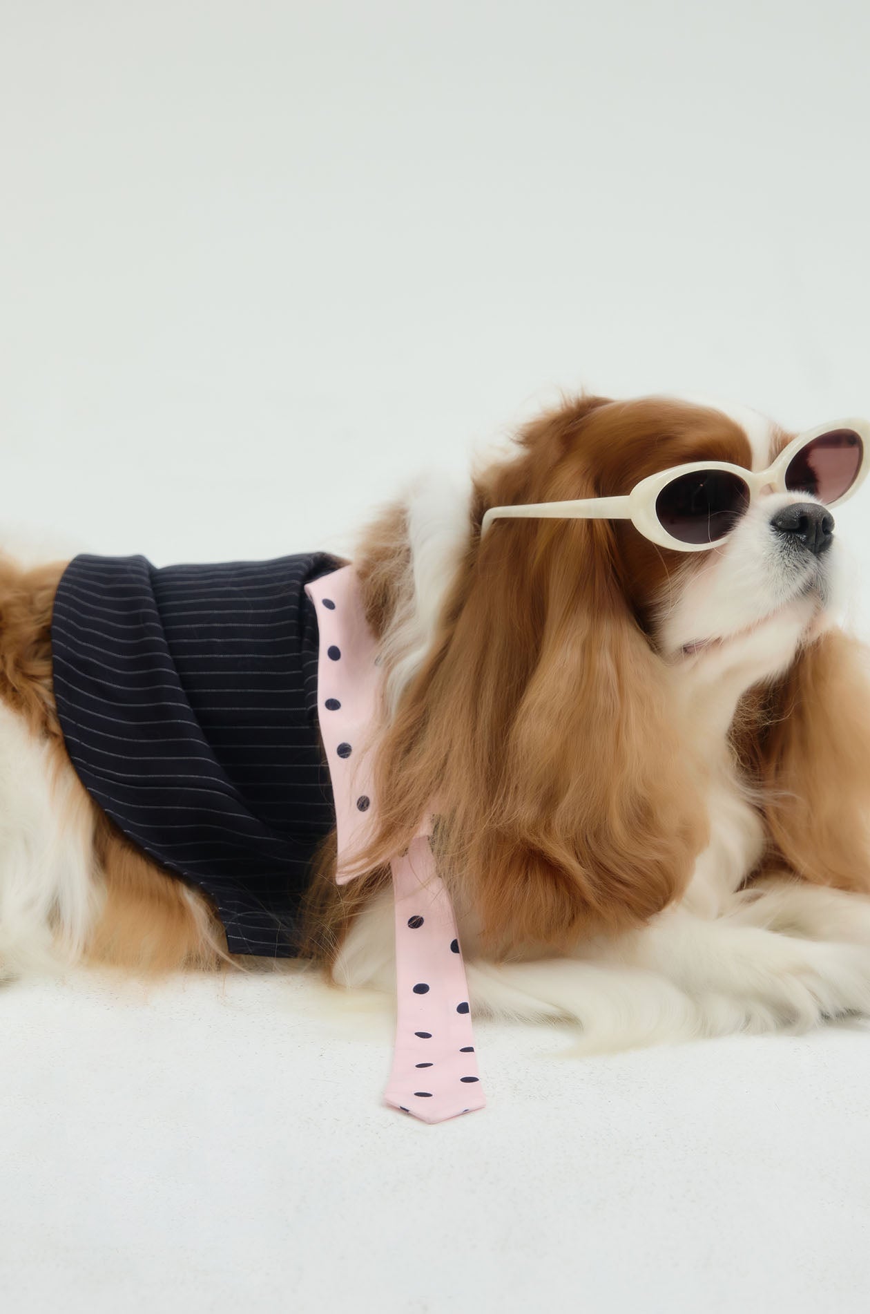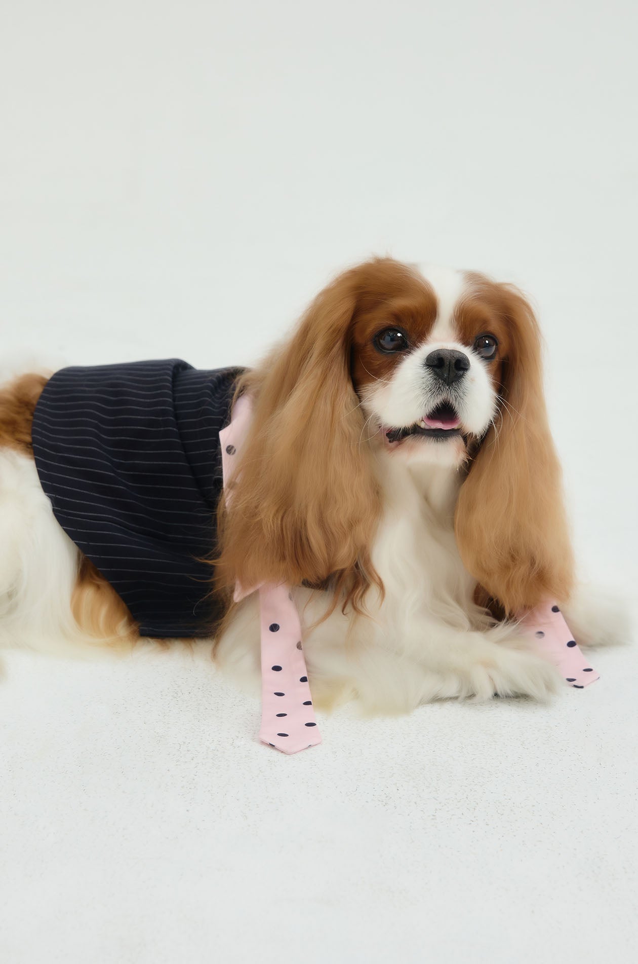 Jaspal The Edit x Proud & Tan | Crafted for small breeds, this sleeveless pet cloth is tailored in woven fabric, elevated with contrast stripes and finished with a dot‑pattern collar and necktie. Available in navy.