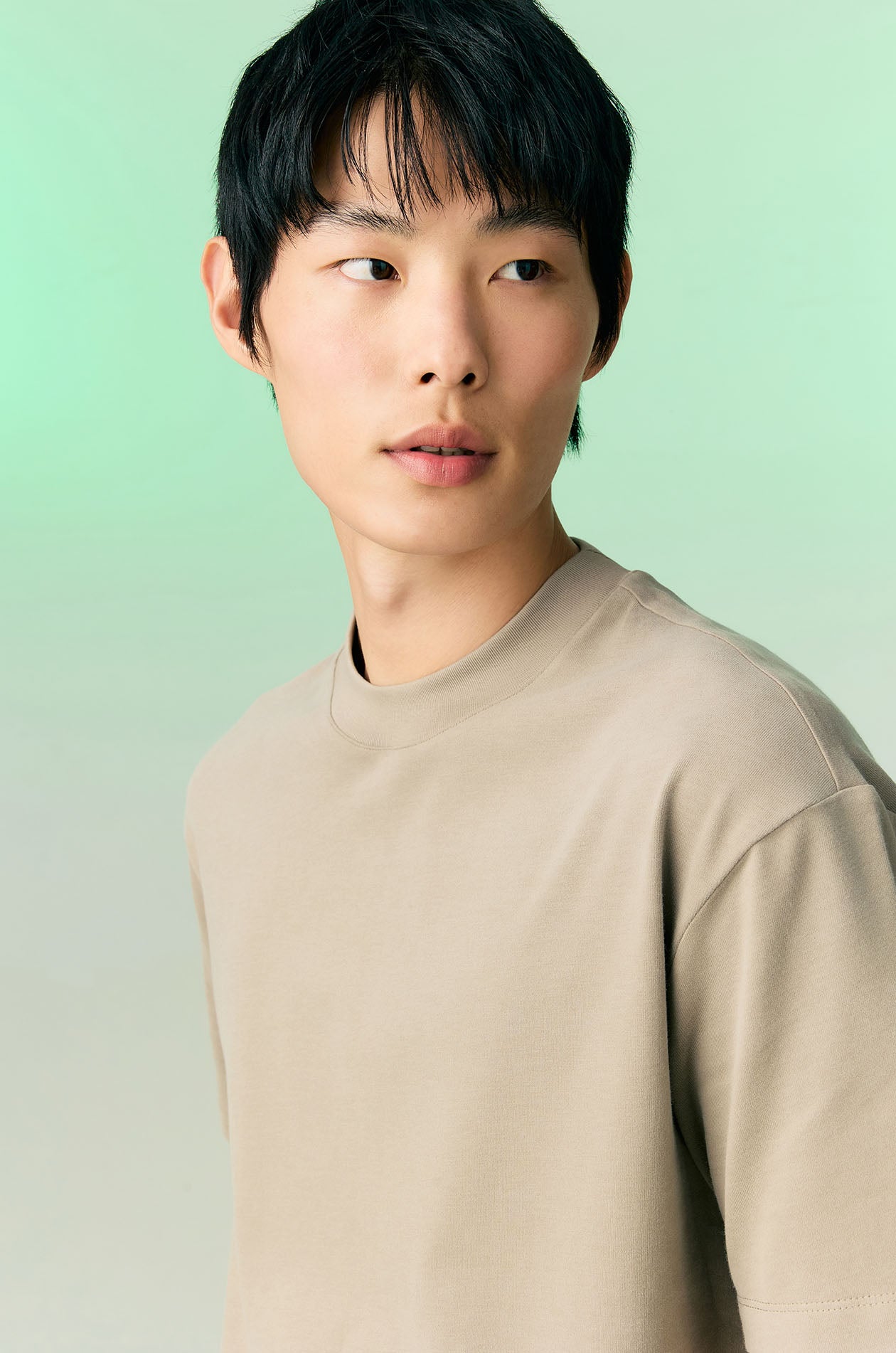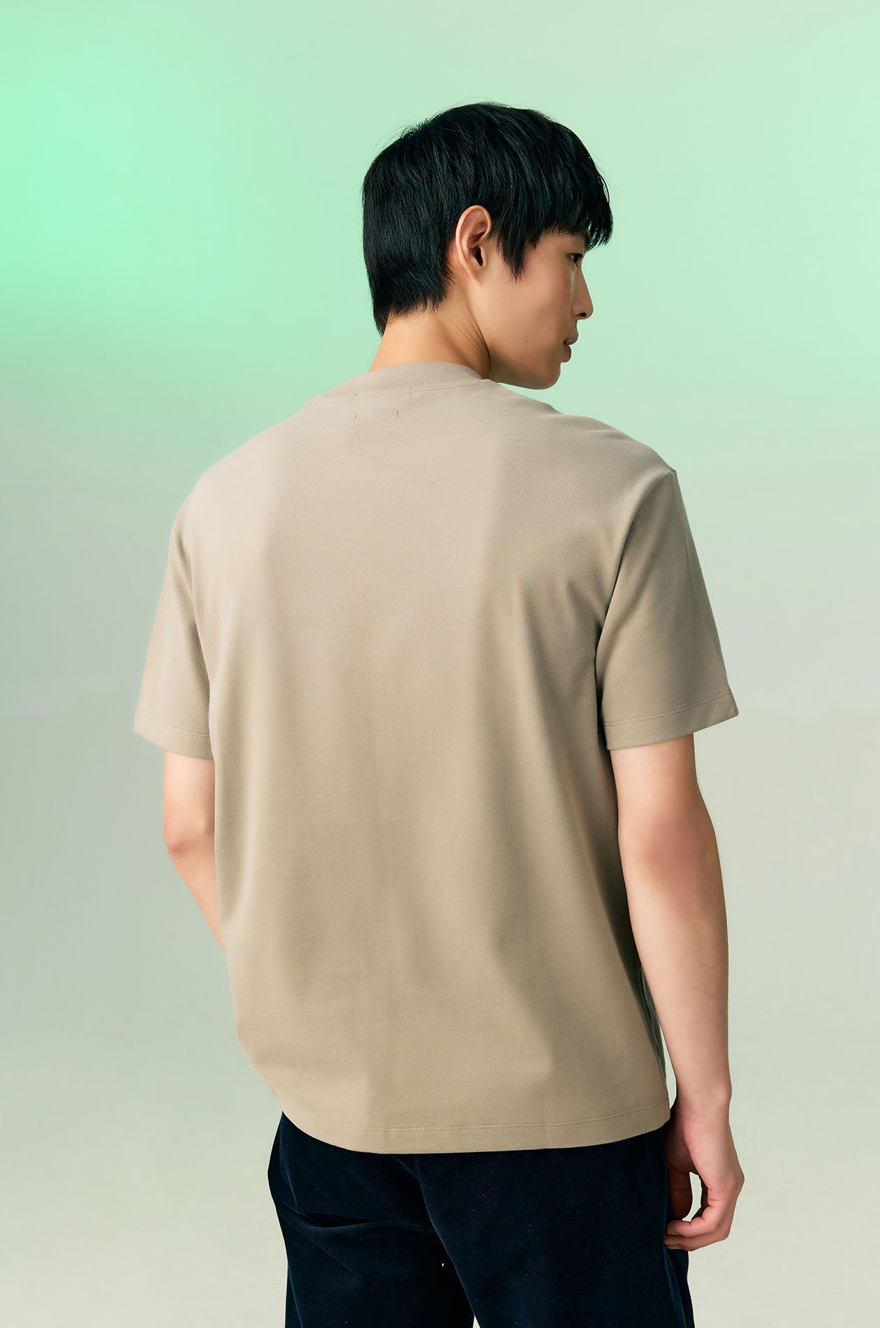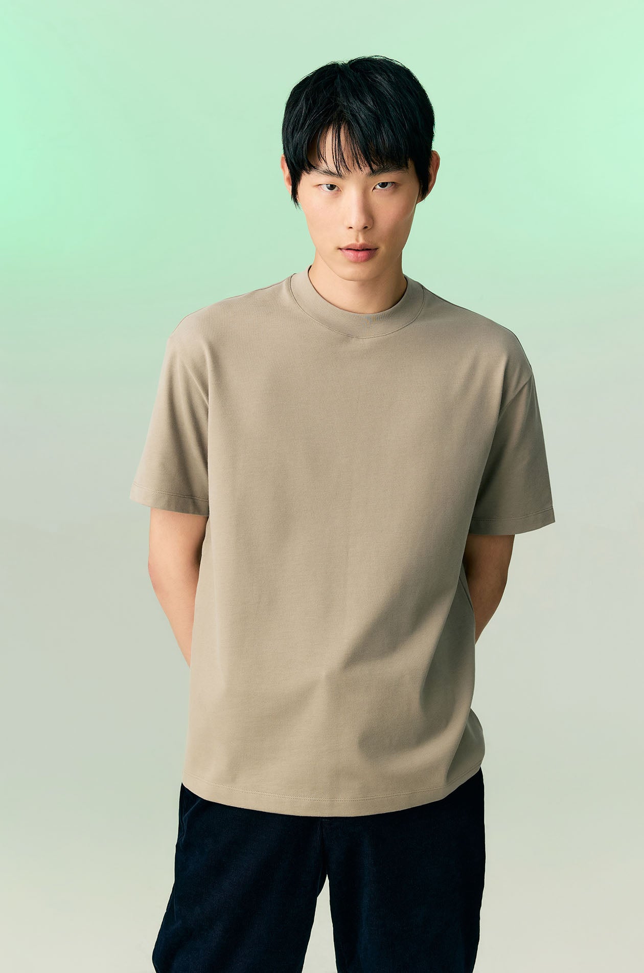 Short-sleeved T-shirt in cotton-blend jersey with soft finish. Relaxed fit with mock neck. Available in black, sand, and olive grey.