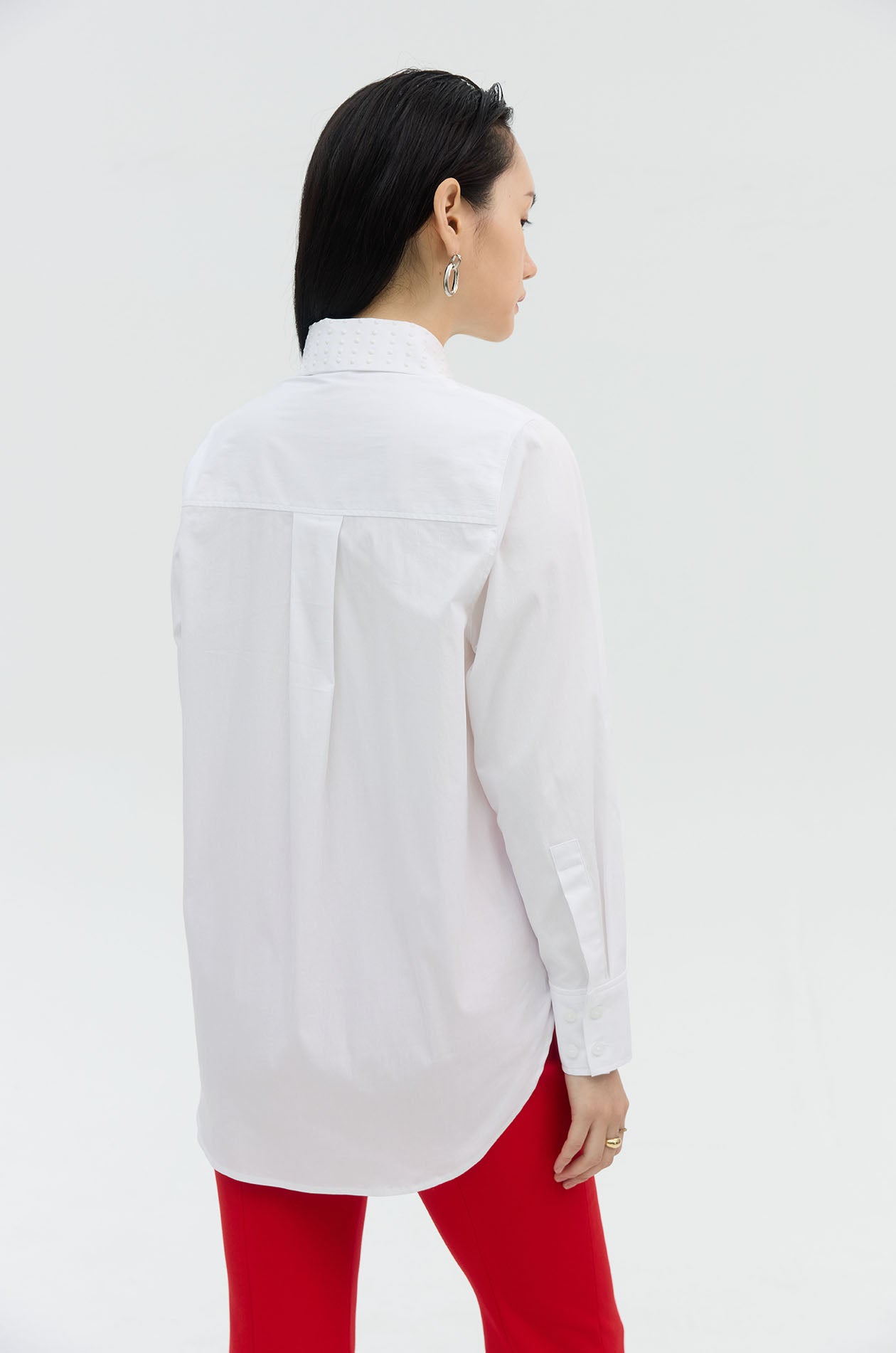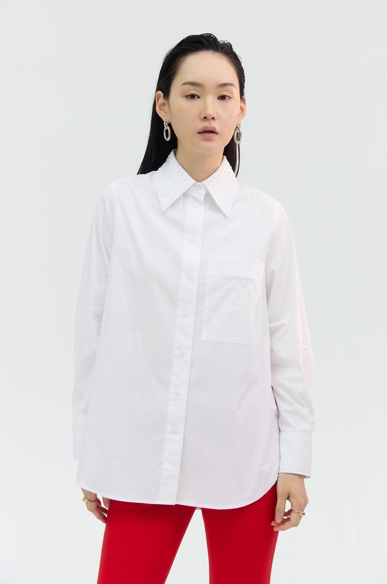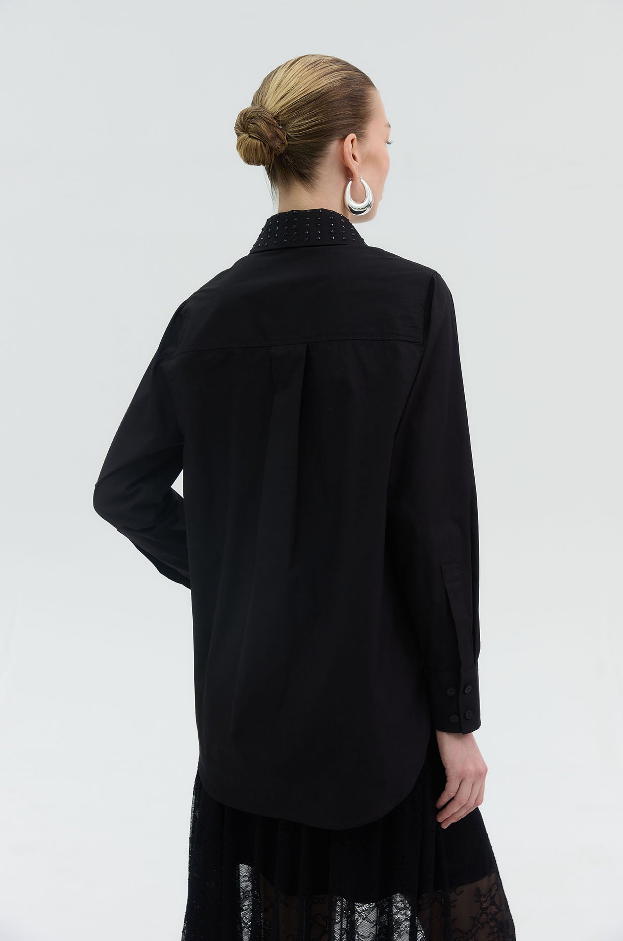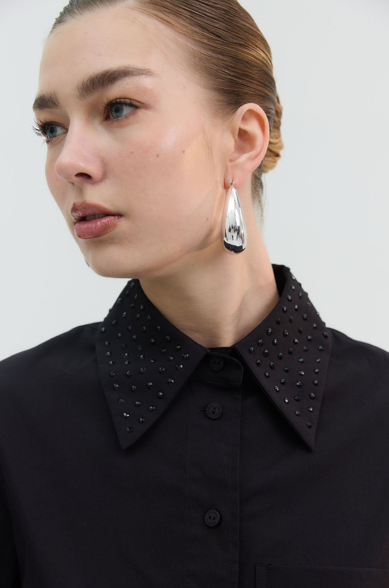 Long-sleeved shirt in cotton blend. Crafted from cotton produced according to the Better Cotton Initiative's (BCI) standards that prioritize sustainability across environmental, social, and economic aspects of cotton farming. Classic collar with tonal rhinestone. Regular fit and slightly stretch. Front button closure. Available in black and white.