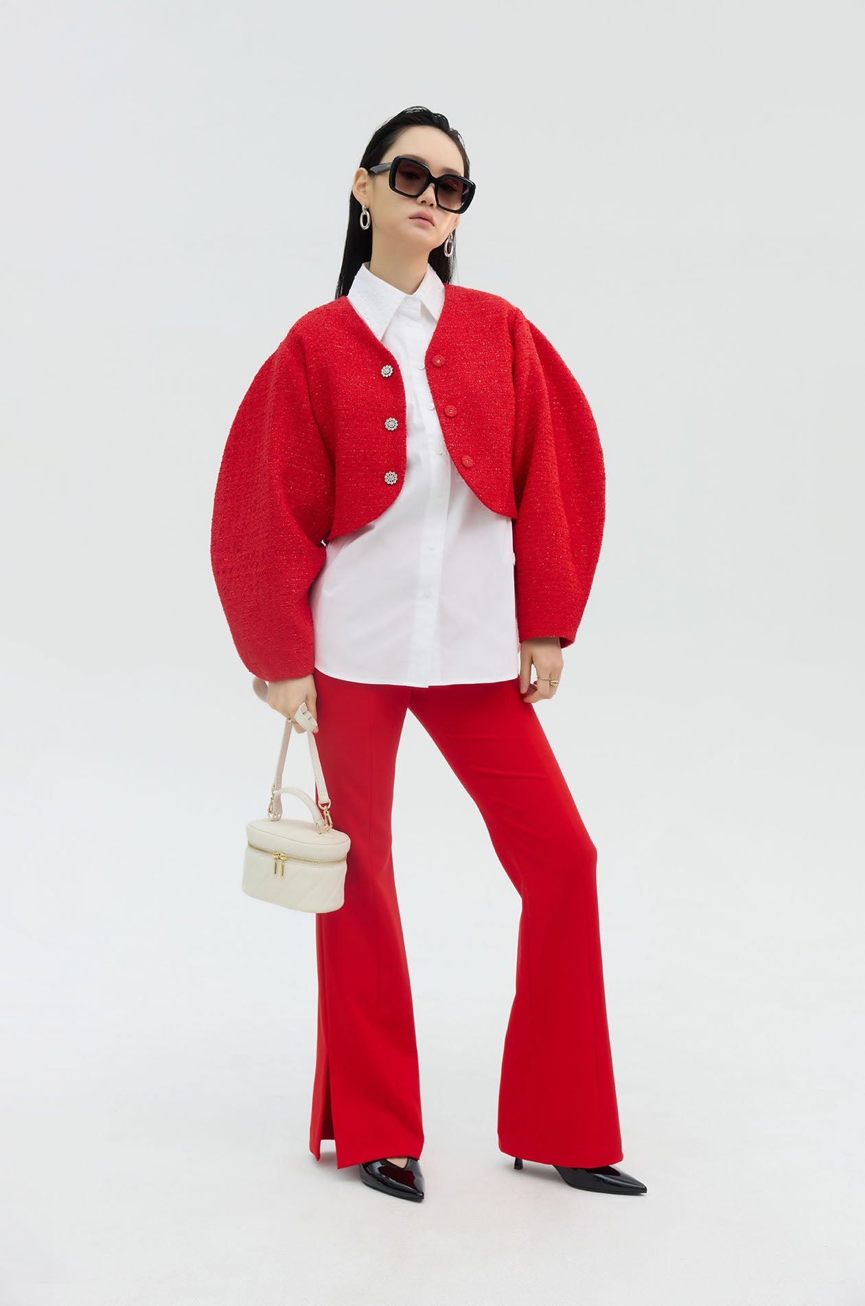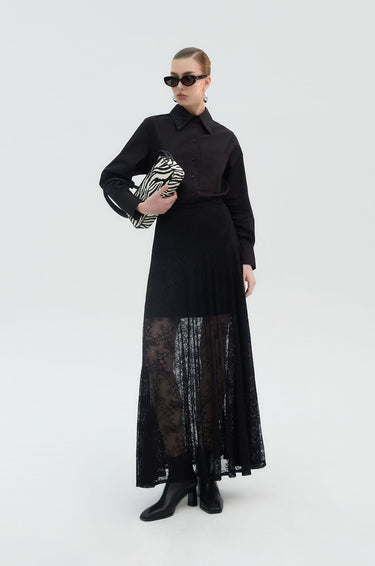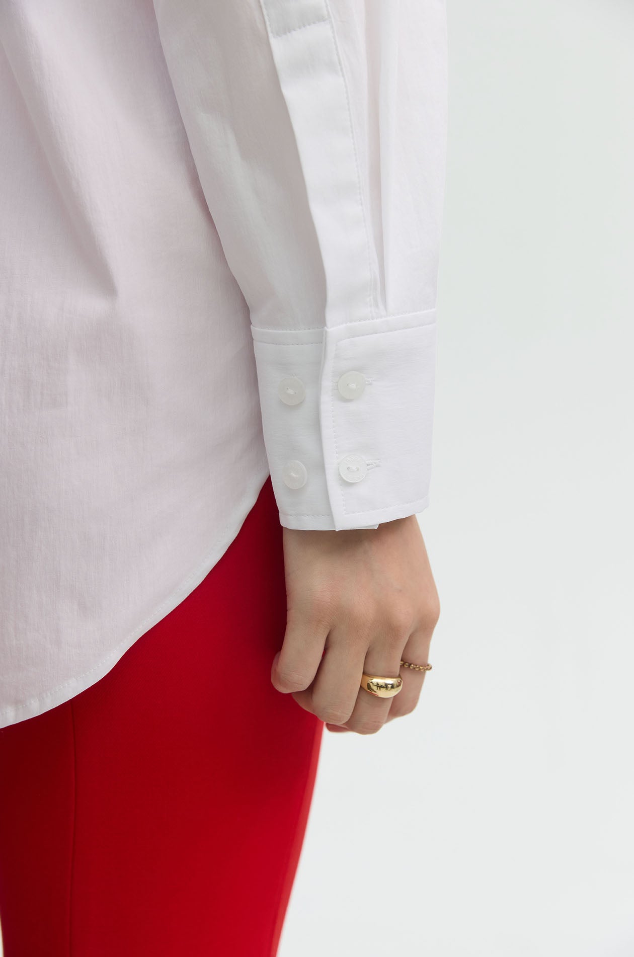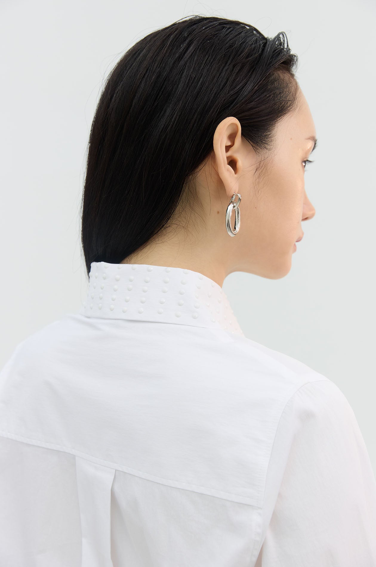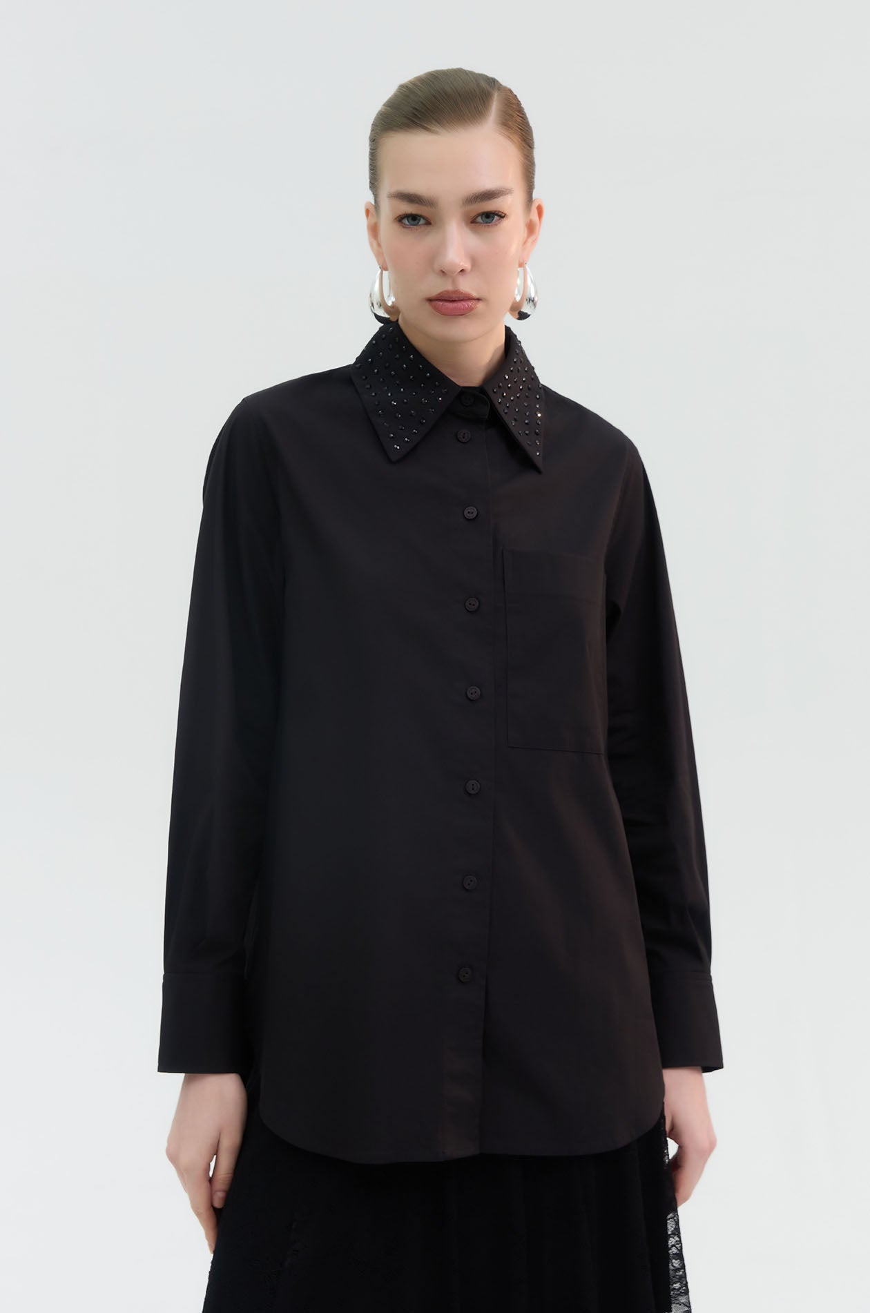 Long-sleeved shirt in cotton blend. Crafted from cotton produced according to the Better Cotton Initiative's (BCI) standards that prioritize sustainability across environmental, social, and economic aspects of cotton farming. Classic collar with tonal rhinestone. Regular fit and slightly stretch. Front button closure. Available in black and white.