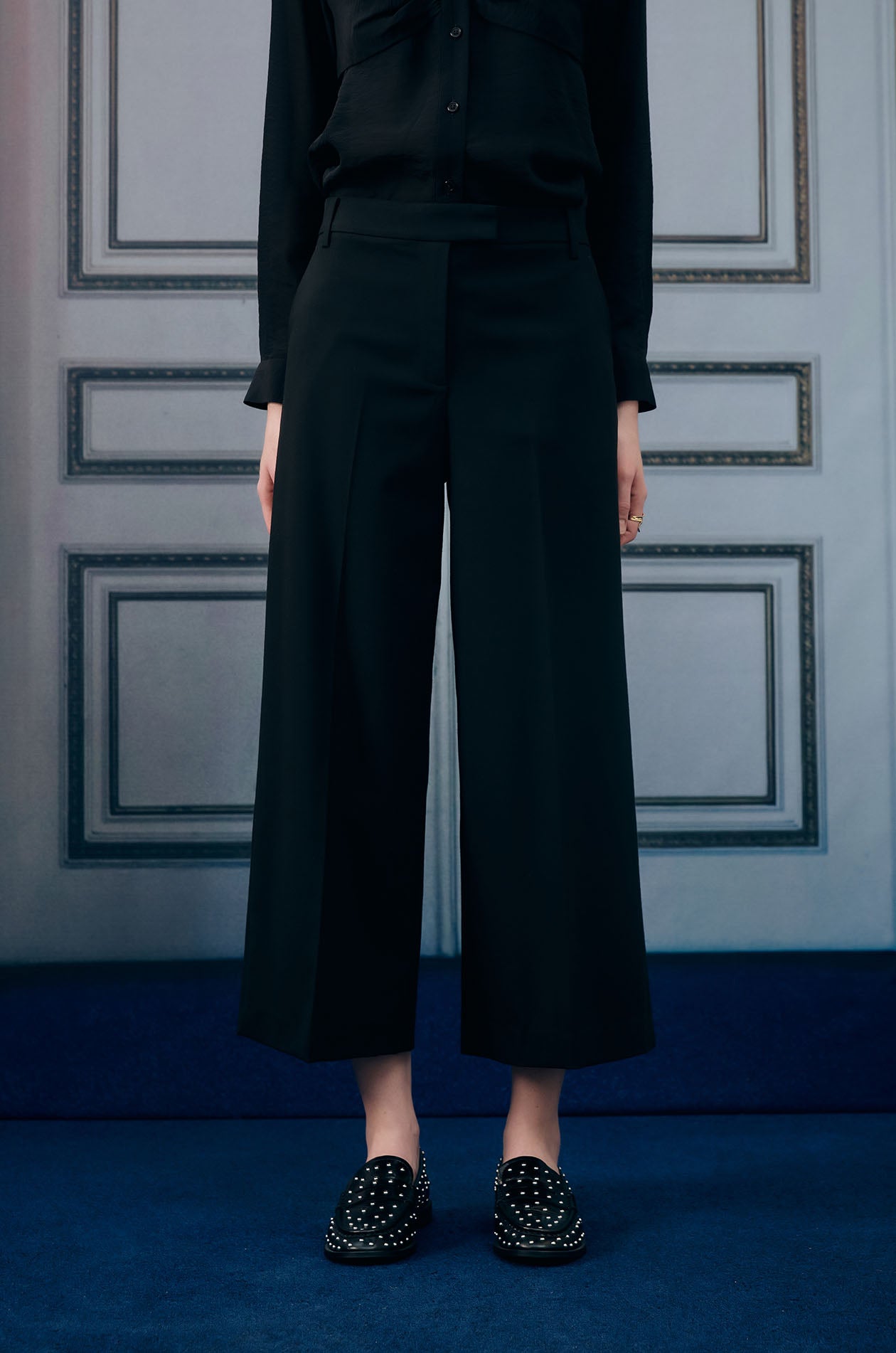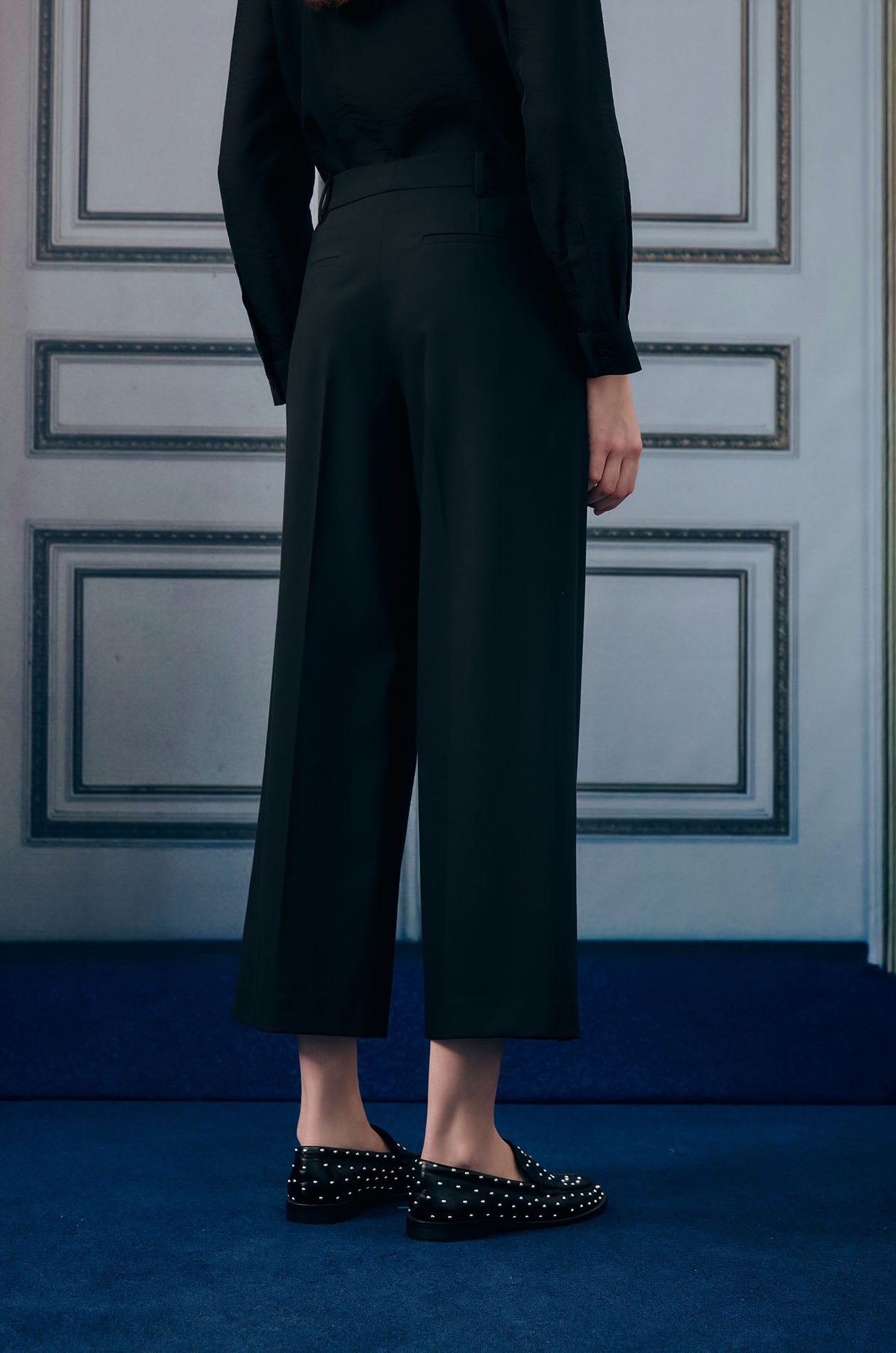 Mid-rise cropped pants in heavy muslin. Loose-straight legs with side pockets. Front hook and zip closure. Available in black.